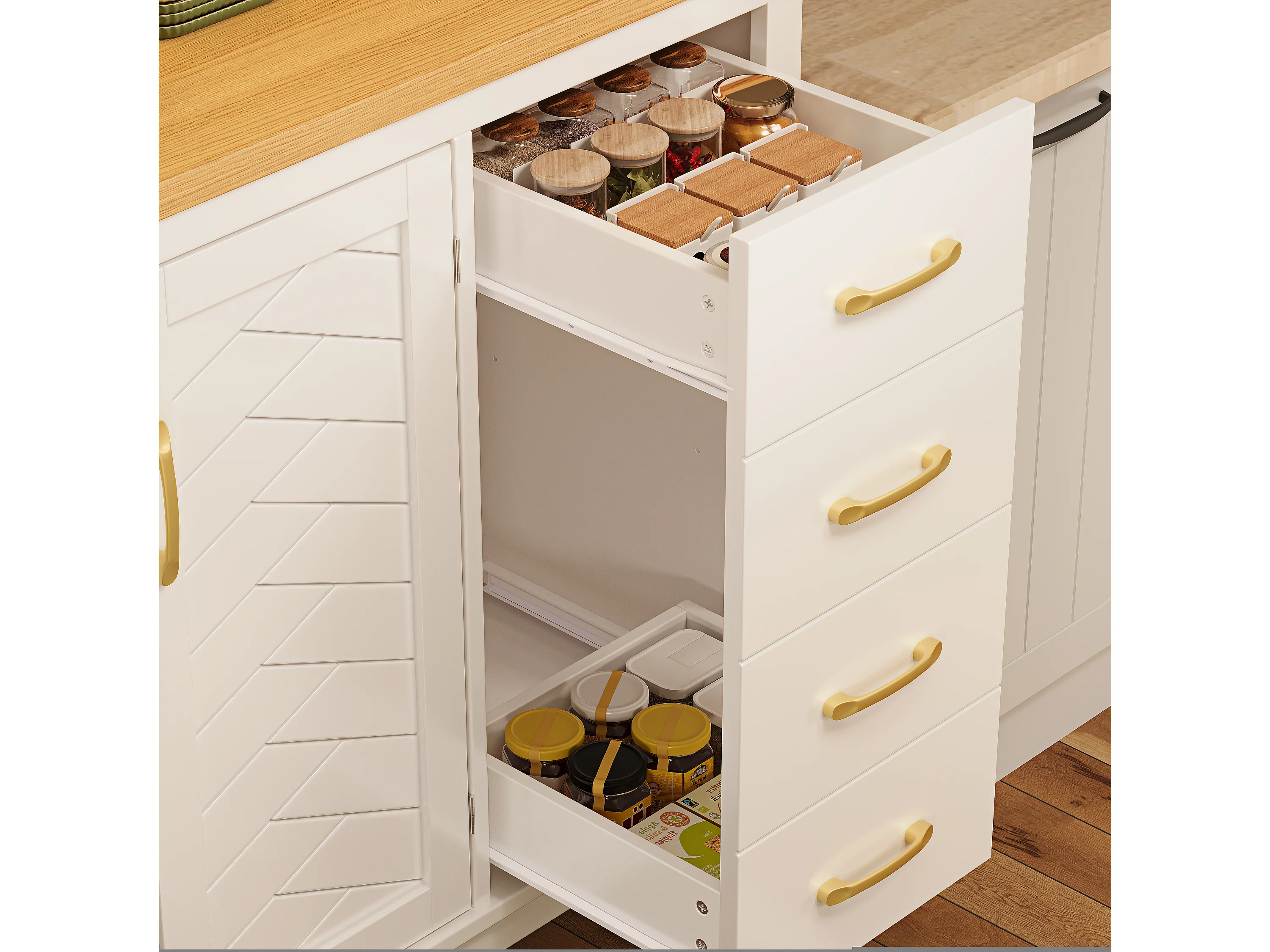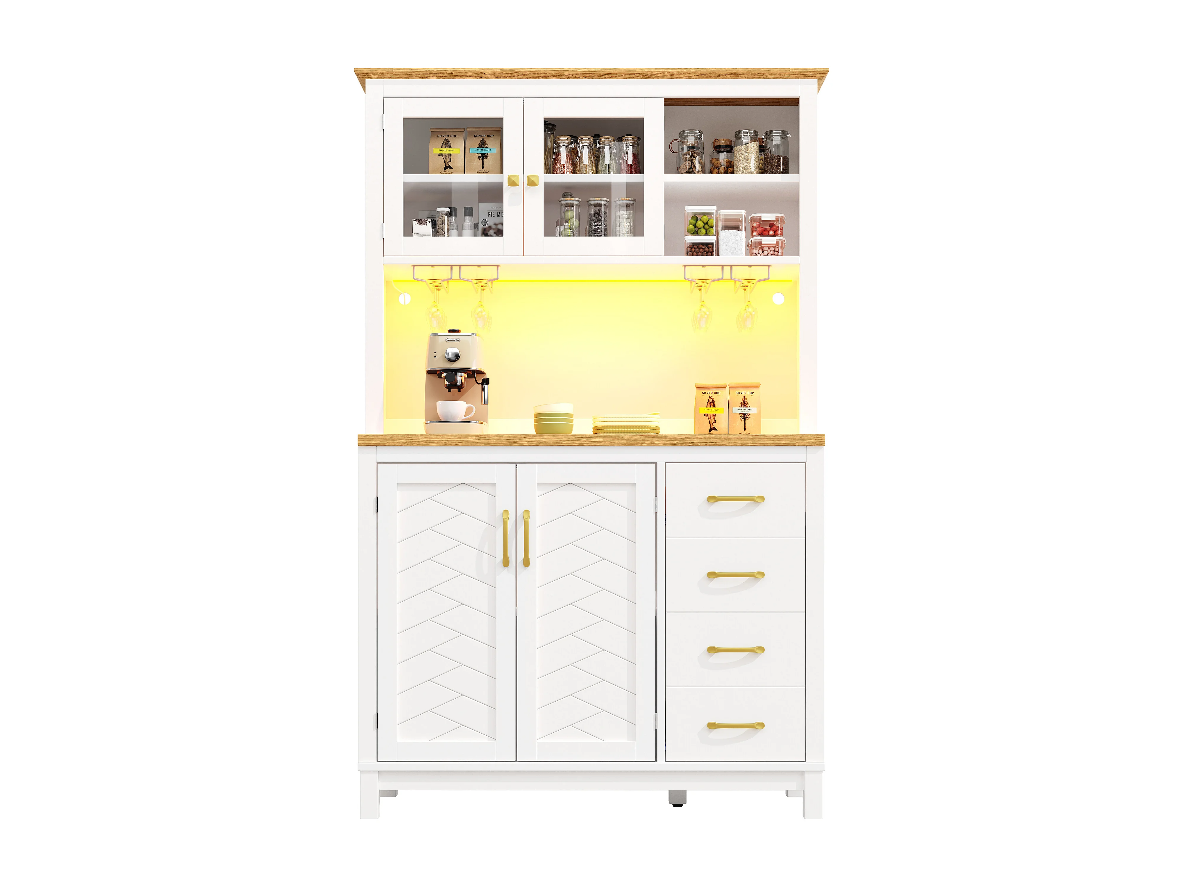 Kredens kuchenny w stylu rustykalnym - 105,5 x 40 x 180 cm - 4 drzwi + oświetlenie LED + uchwyty na kubki + szuflady - płyta MDF - biały