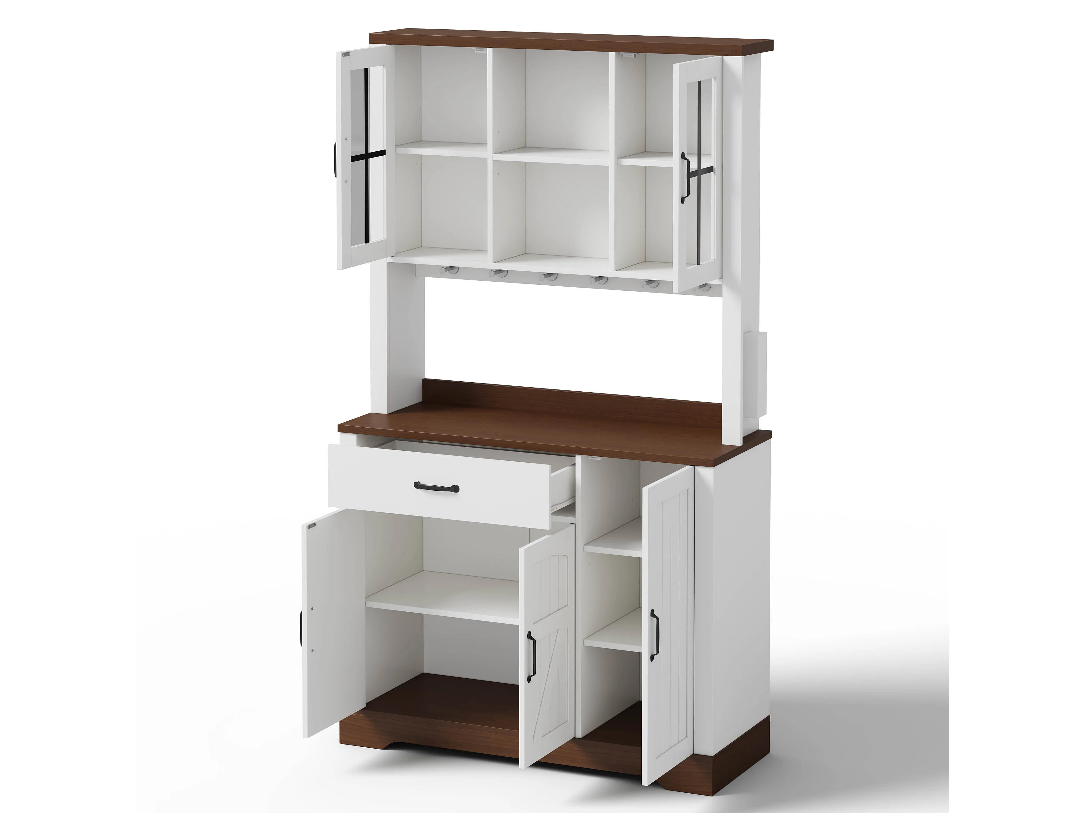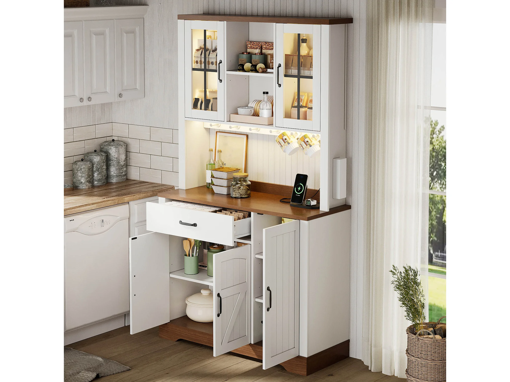 Kredens kuchenny w stylu rustykalnym - 100 x 40 x 180 cm - z 6 drzwiami + 2 szufladami + diodami LED + gniazdkiem elektrycznym - MDF - biały