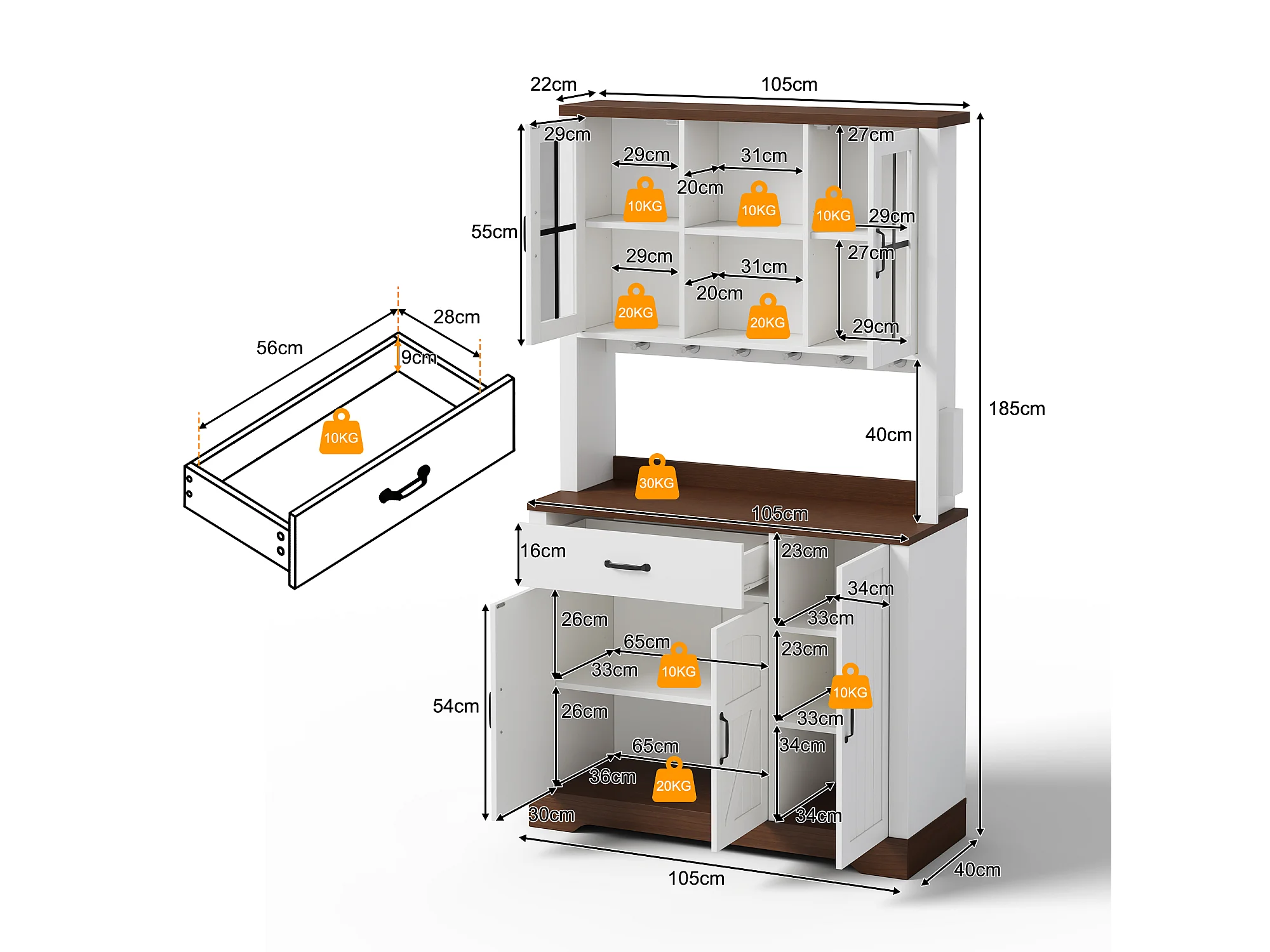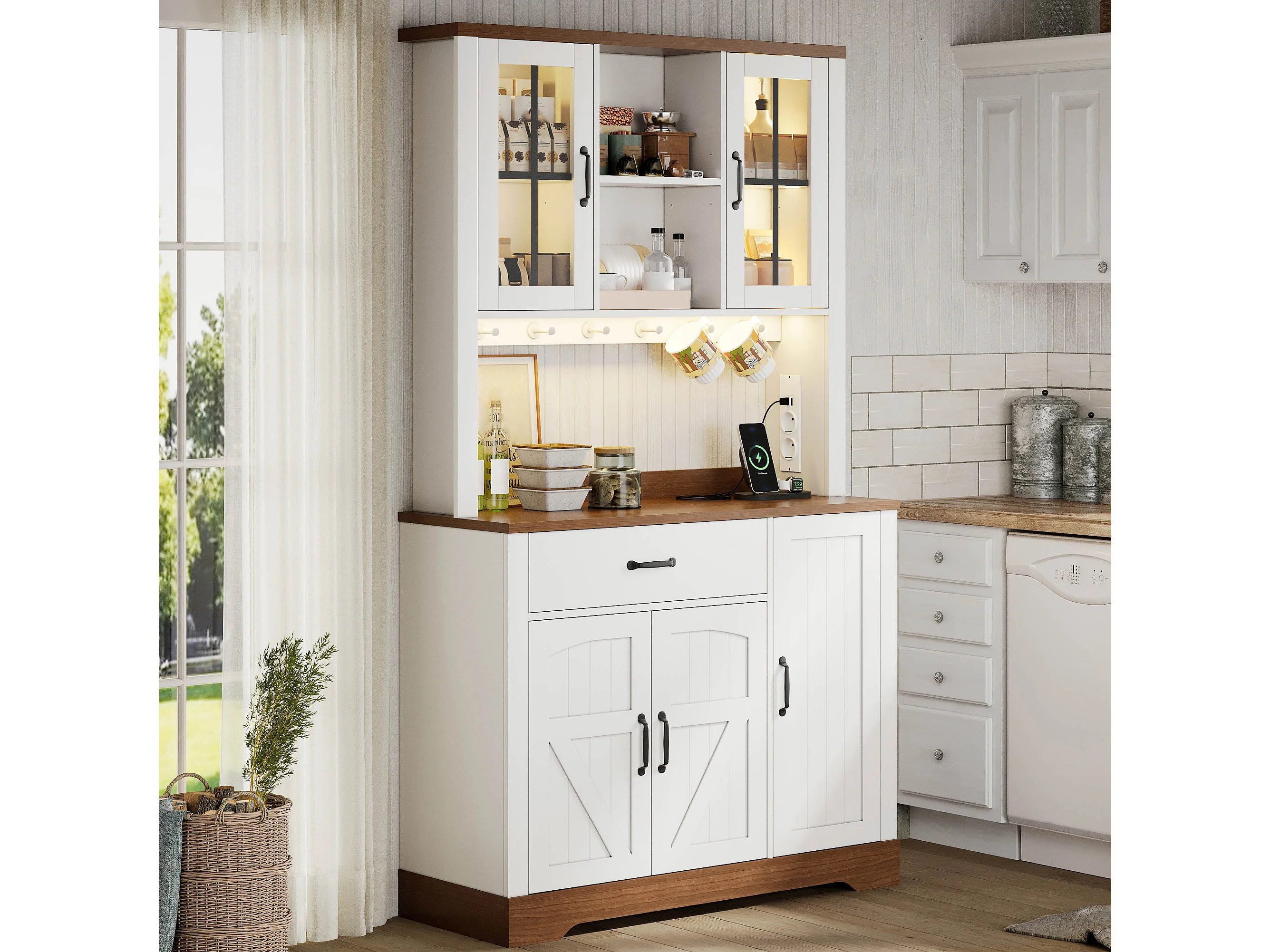 Kredens kuchenny w stylu stodoły - 105 x 40 x 185 cm - z szufladą, diodami LED i gniazdkami oraz 5 drzwiami - MDF - biały