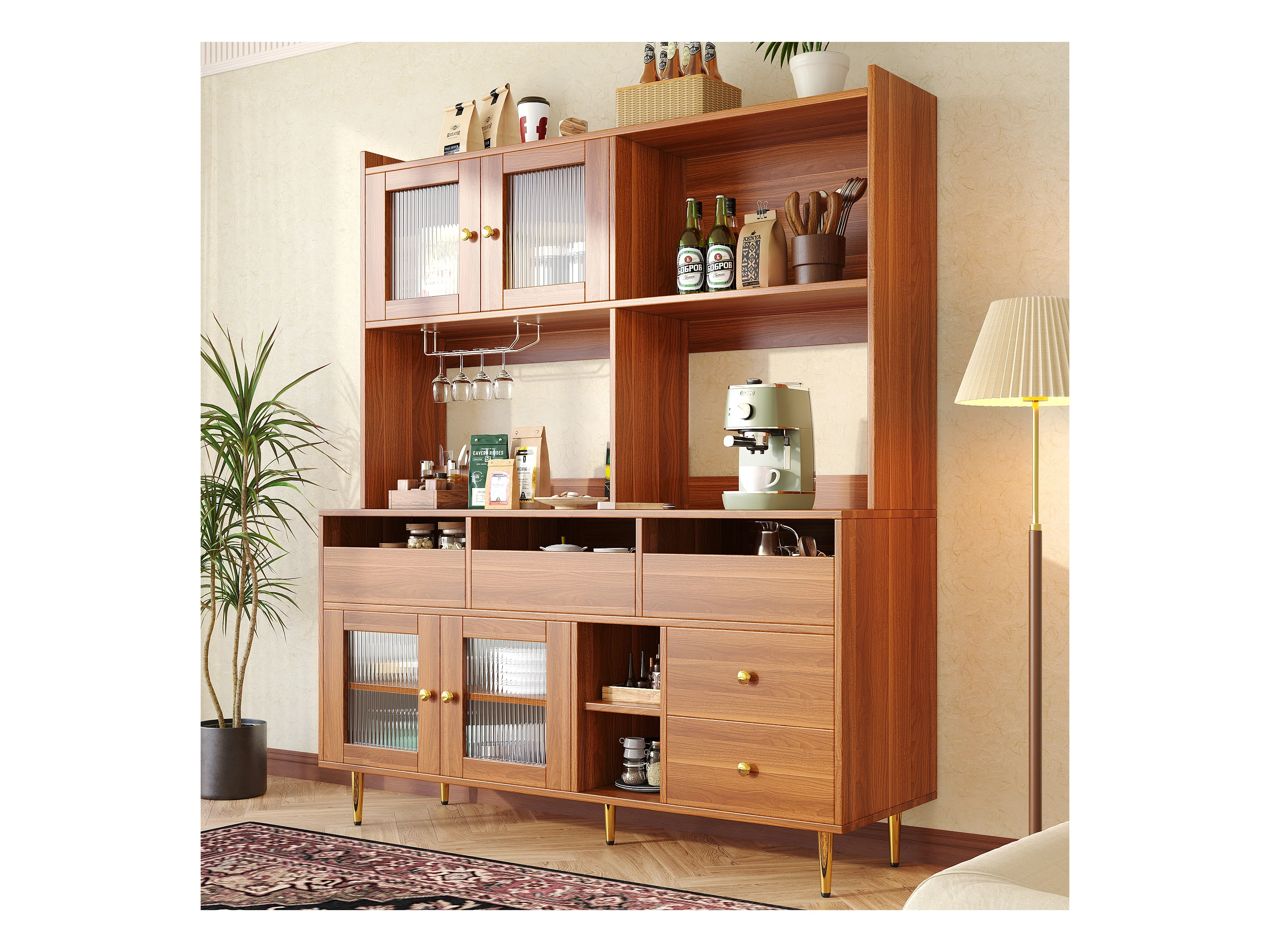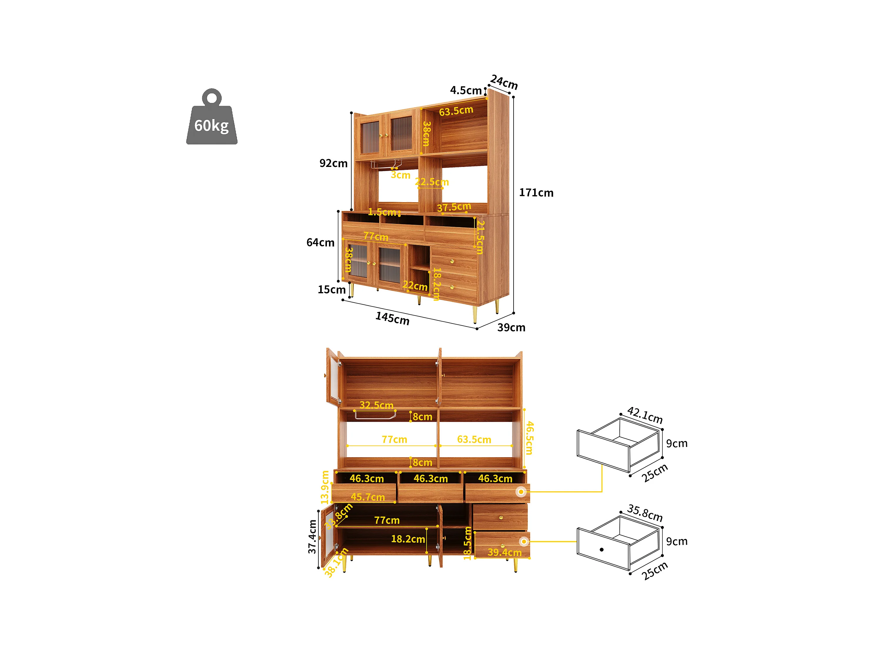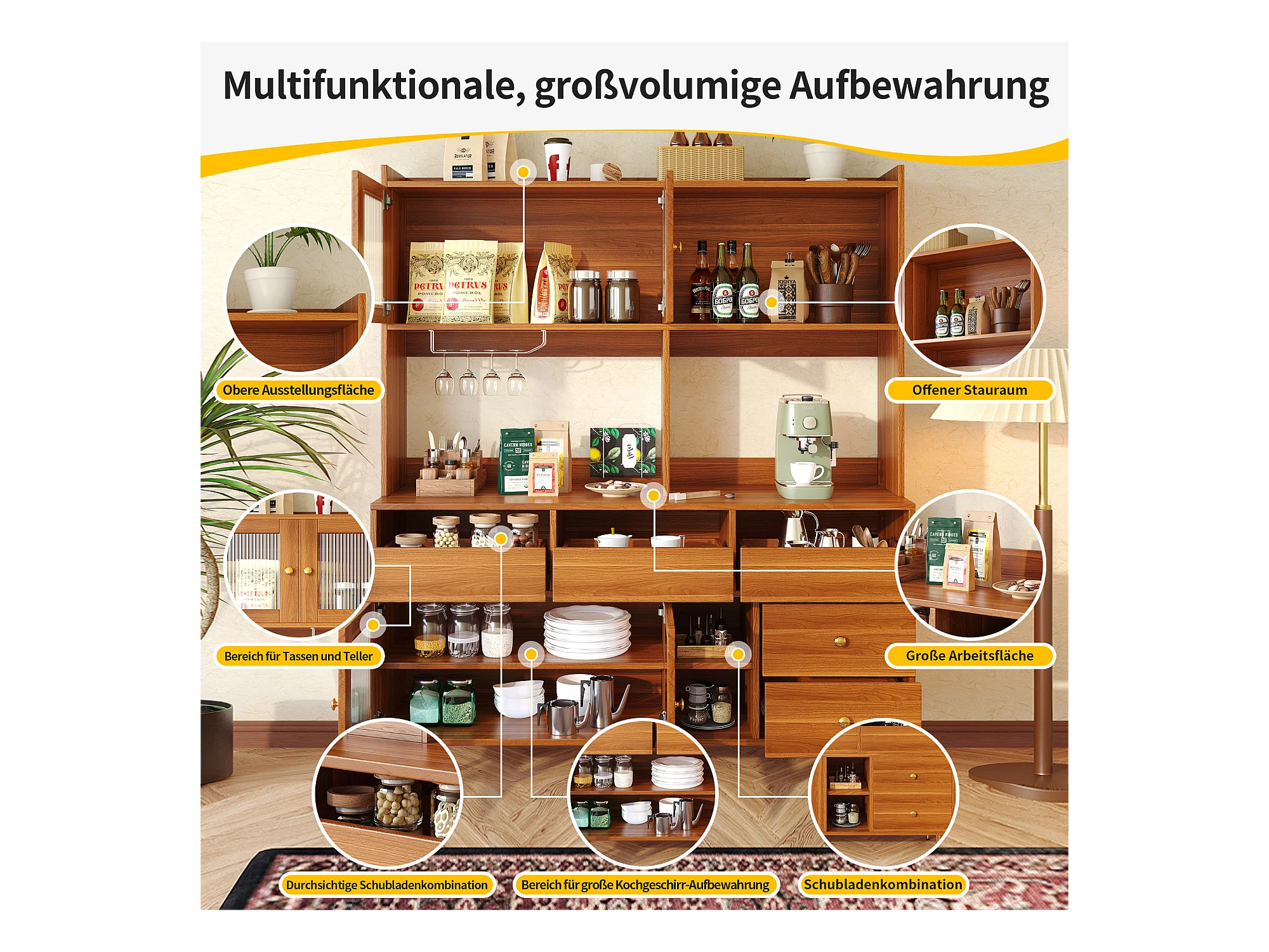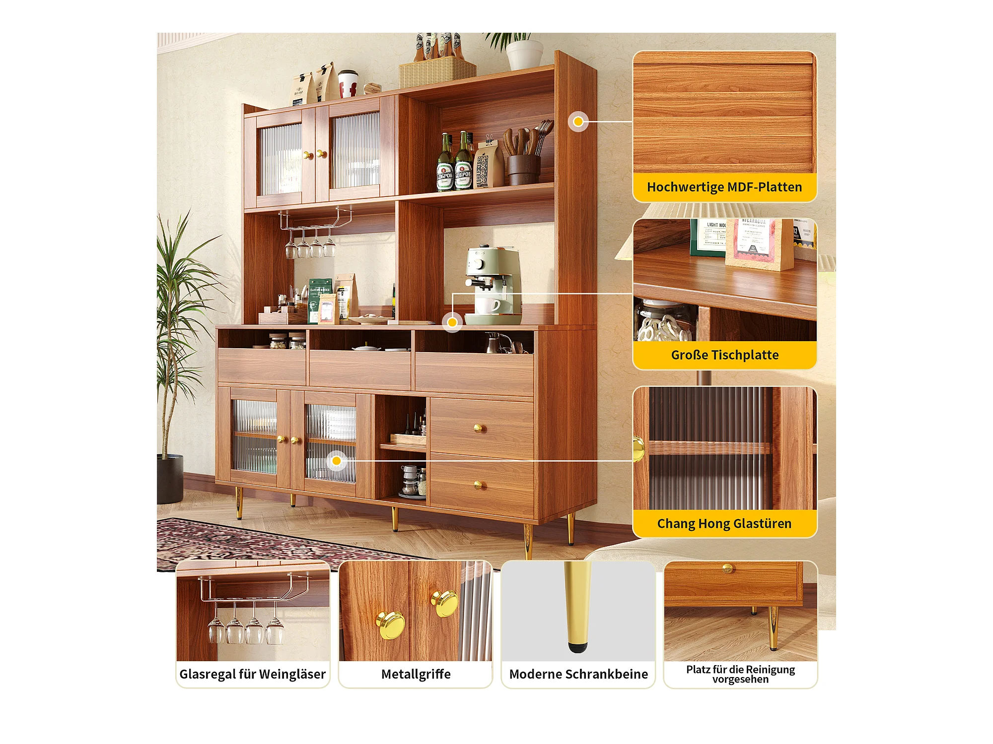 Kredens kuchenny z 4 drzwiami szklanymi, 5 szufladami i otwartą przegrodą - 145 x 39 x 171 cm - drewno MDF - orzech