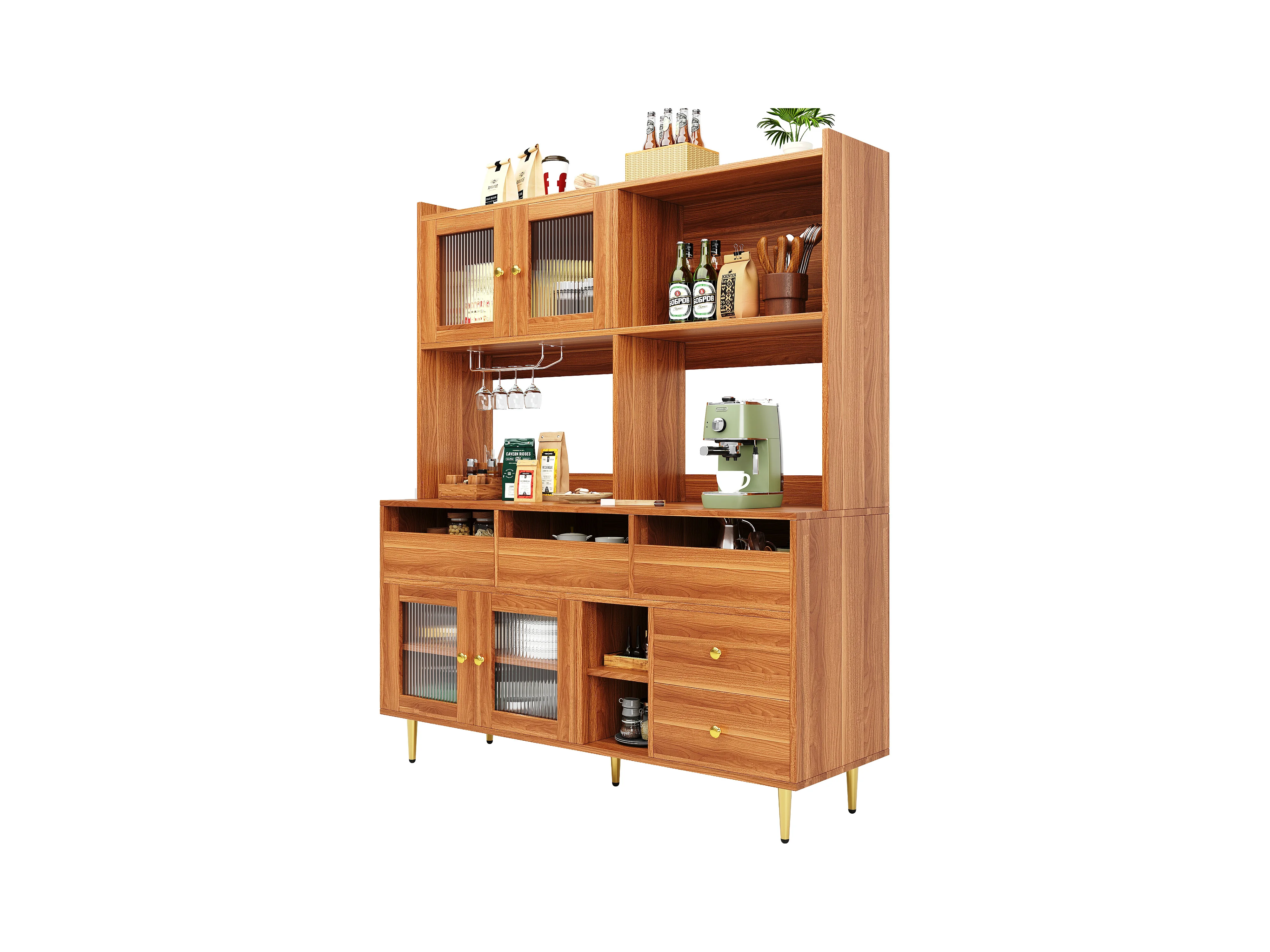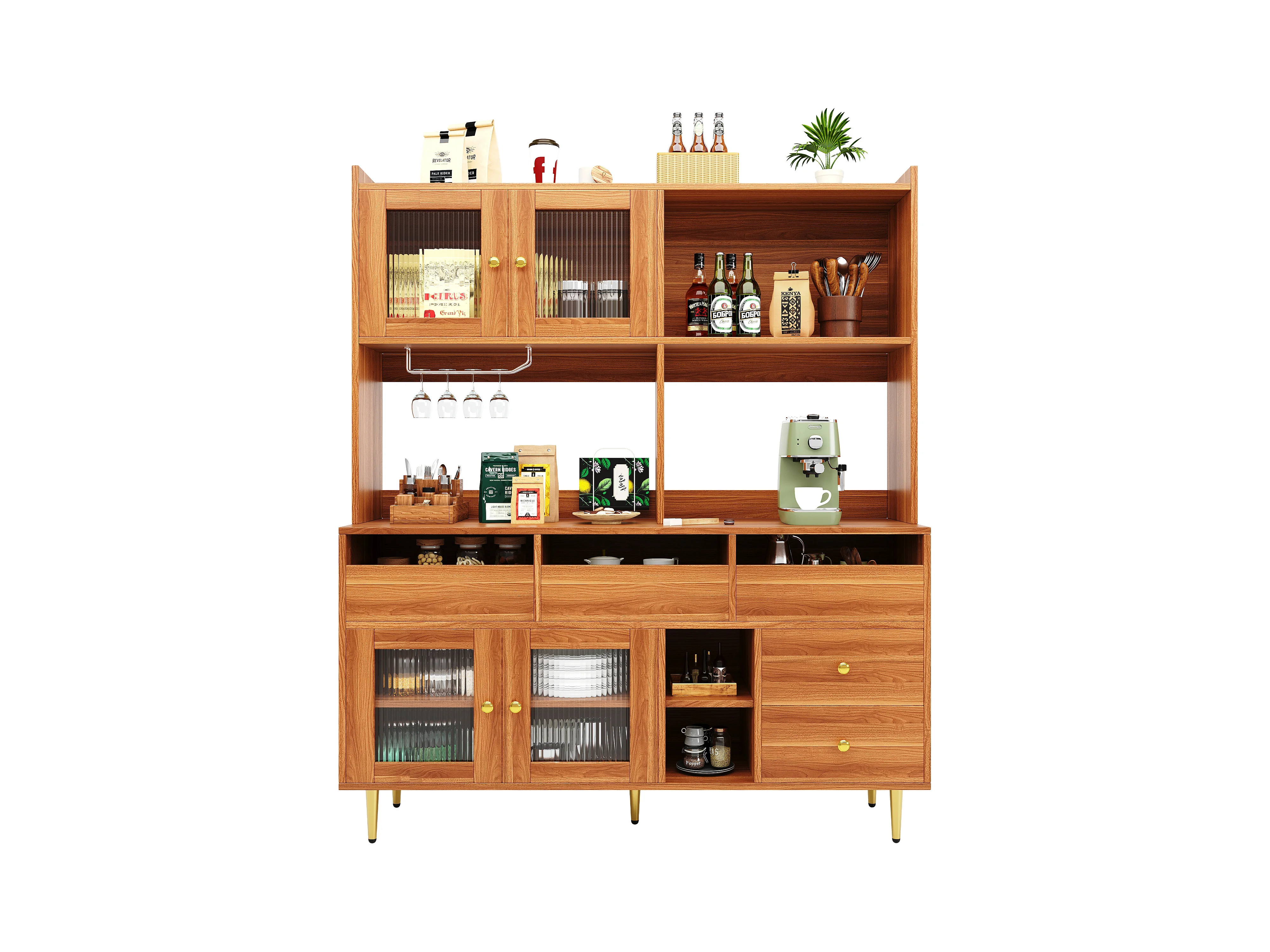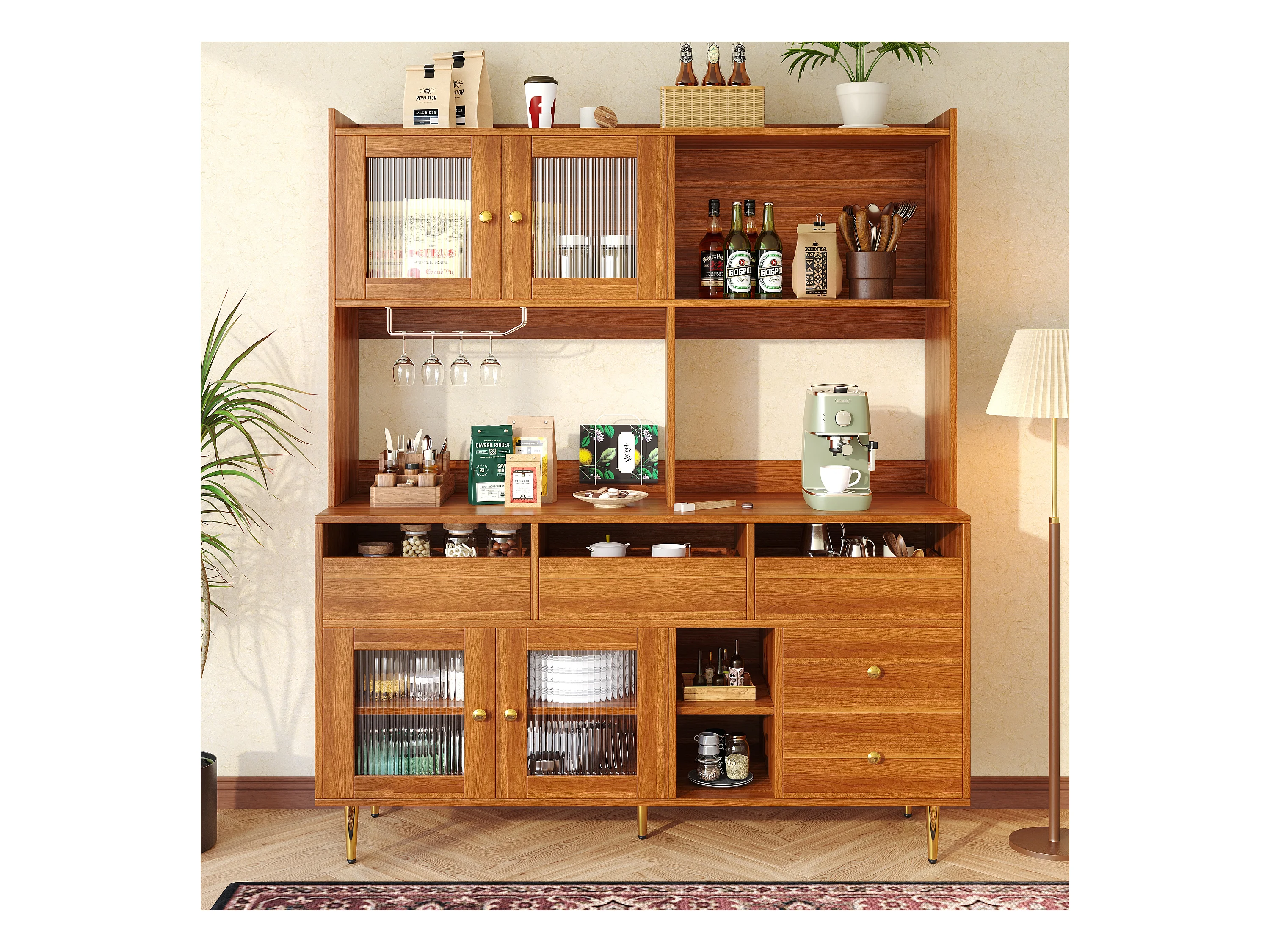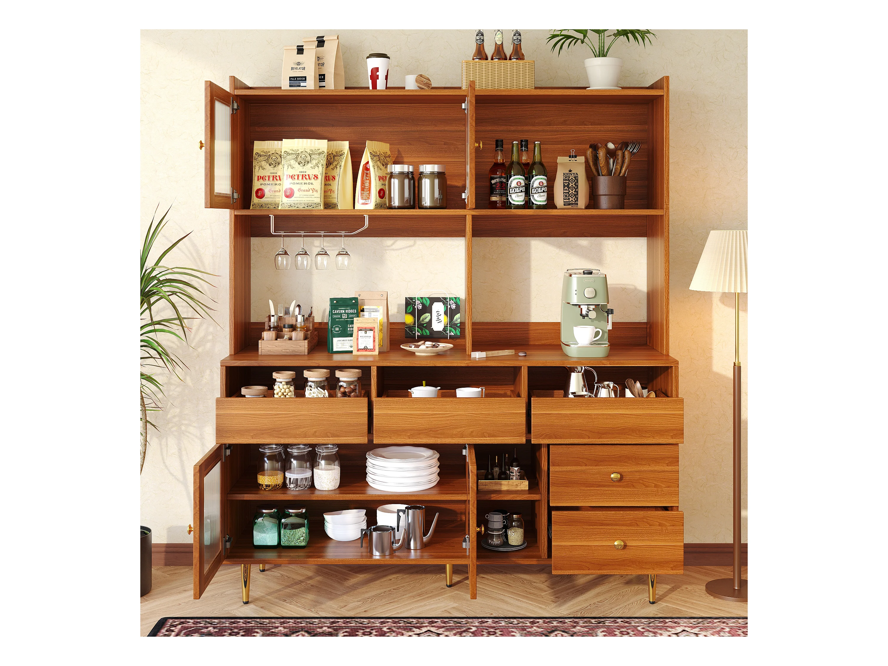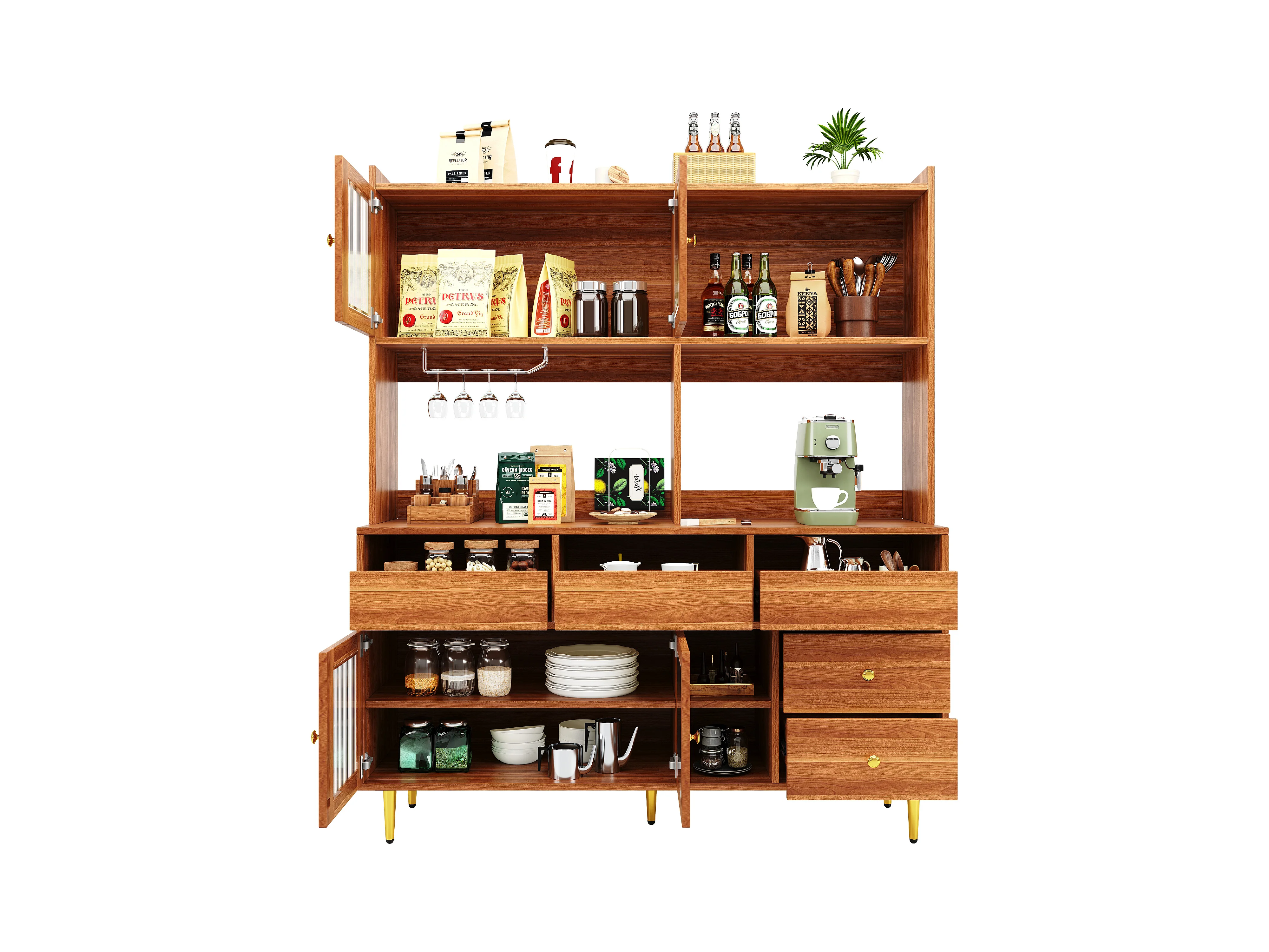 Kredens kuchenny z 4 drzwiami szklanymi, 5 szufladami i otwartą przegrodą - 145 x 39 x 171 cm - drewno MDF - orzech