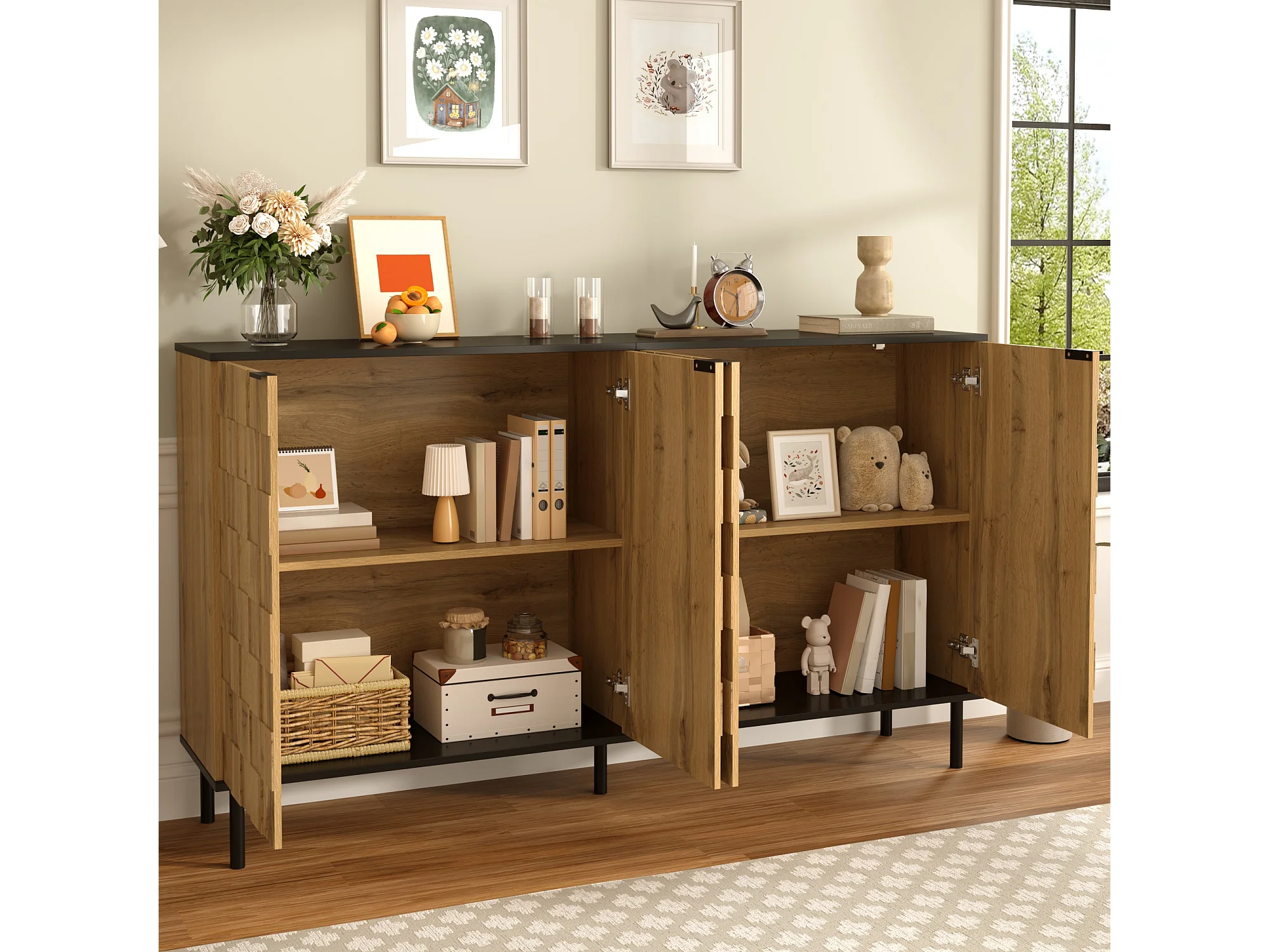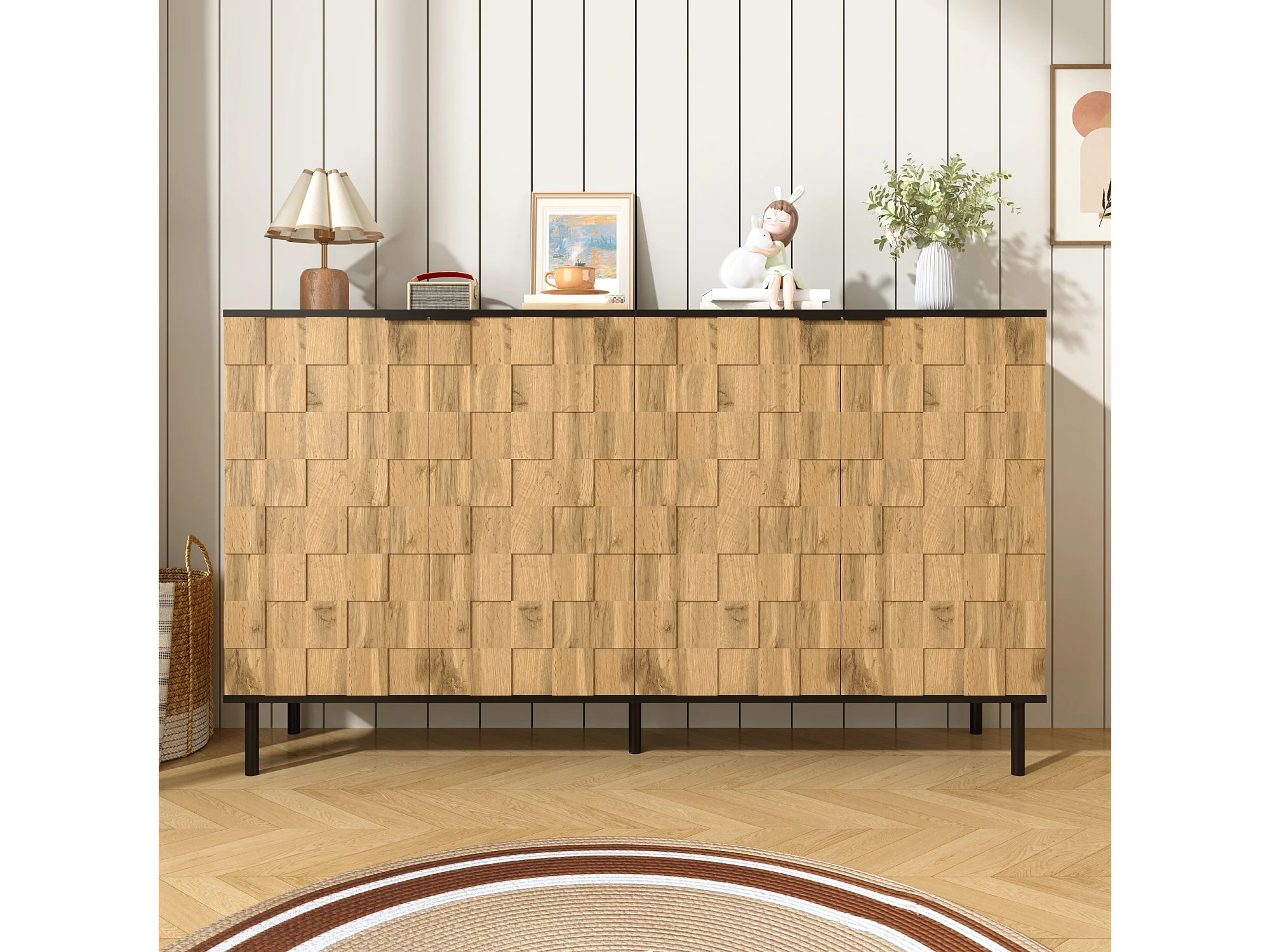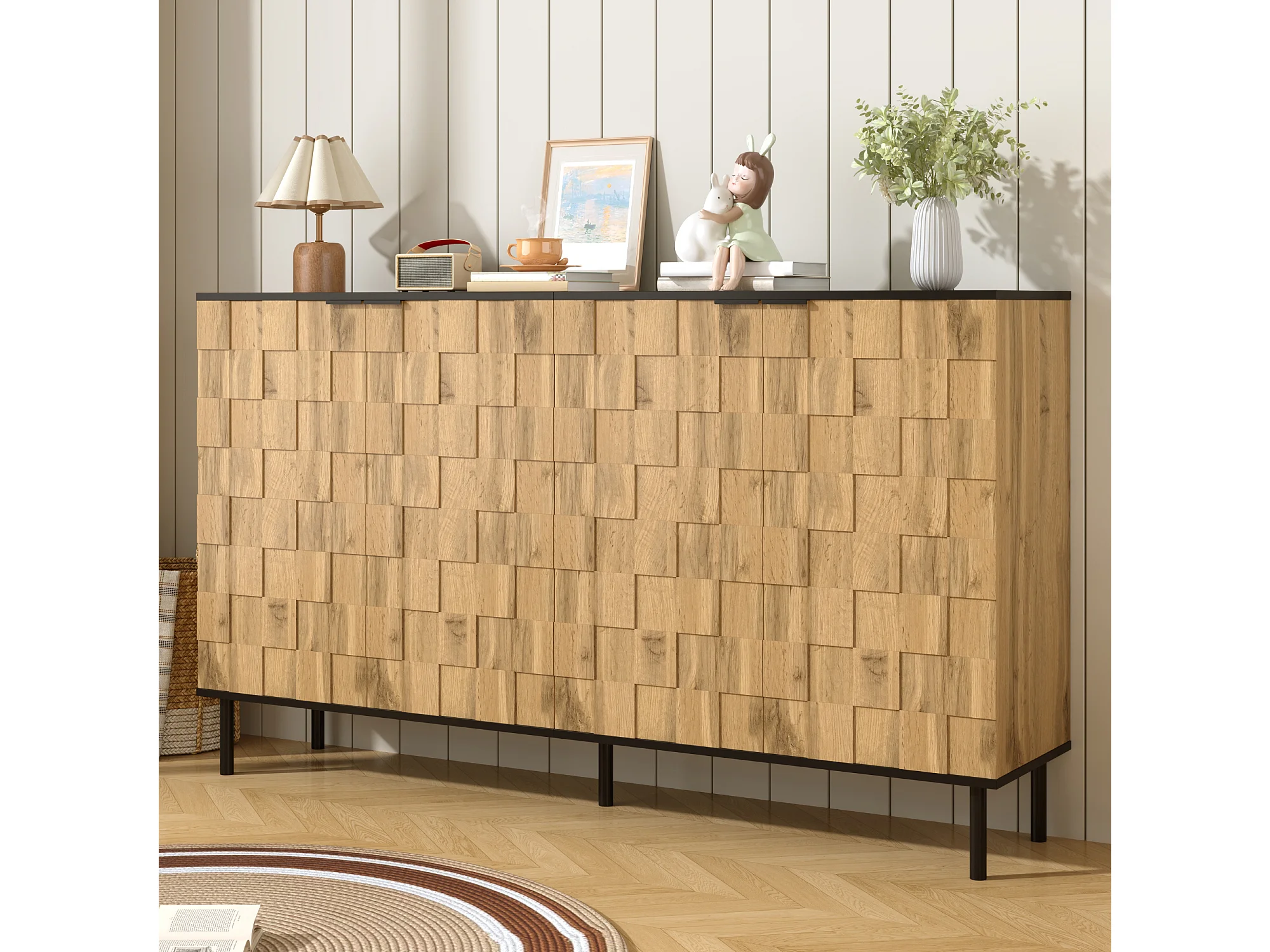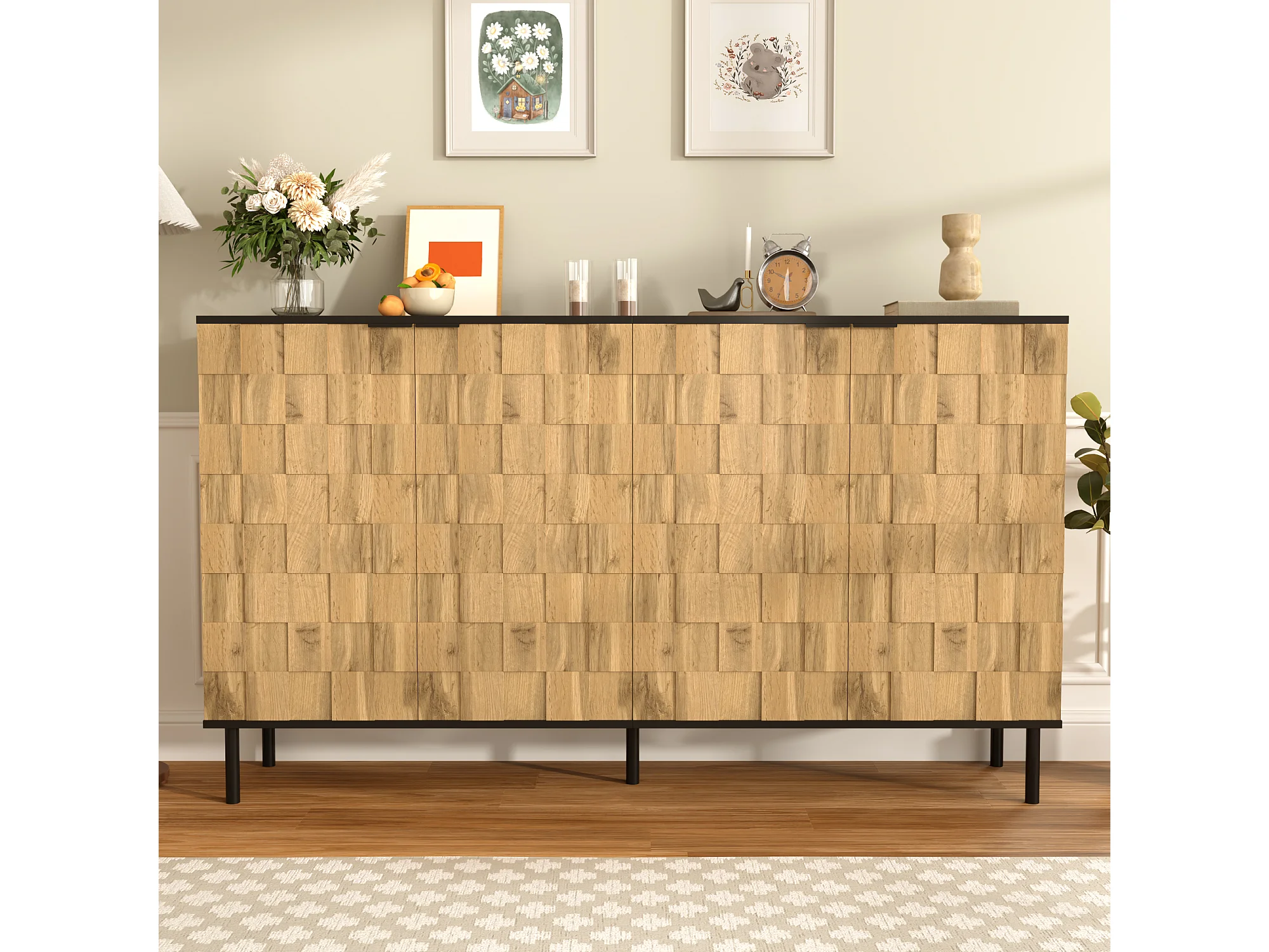 Kredens mozaika 160x35x80,5 cm - 4 drzwi - Wykończenie imitujące drewno - Nogi metalowe - Płyta wiórowa - Naturalny