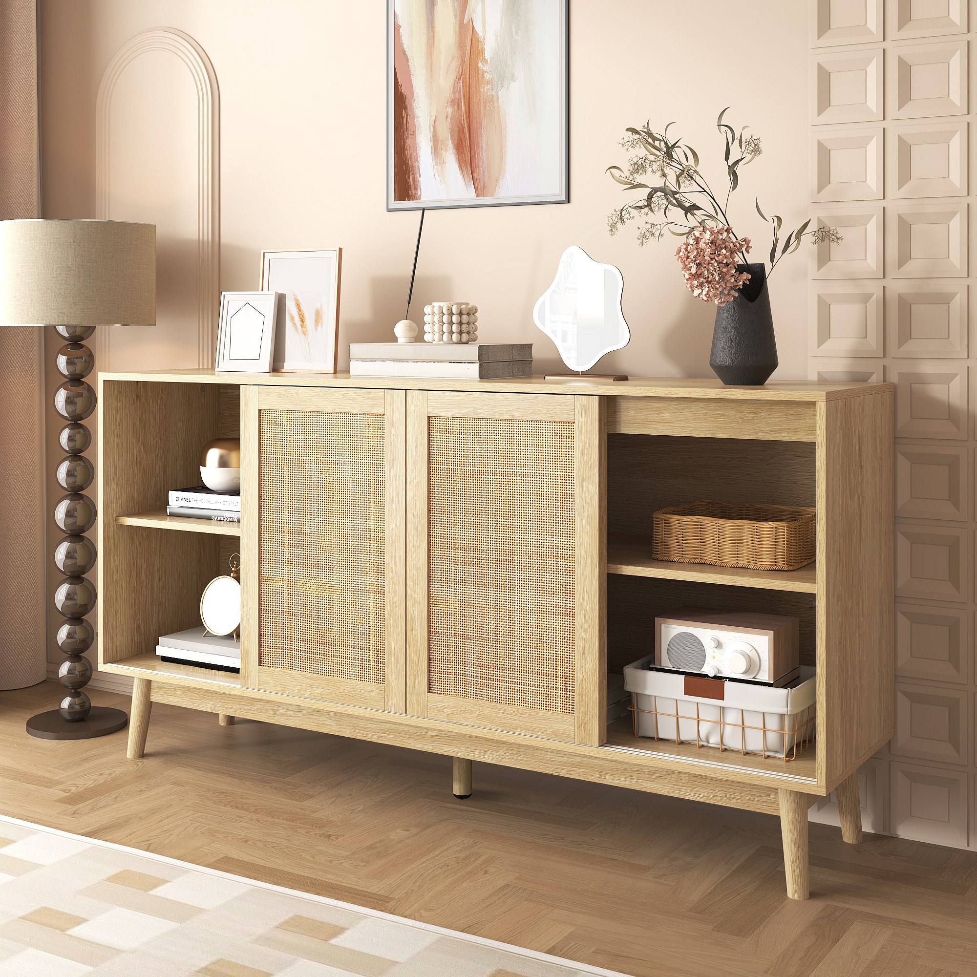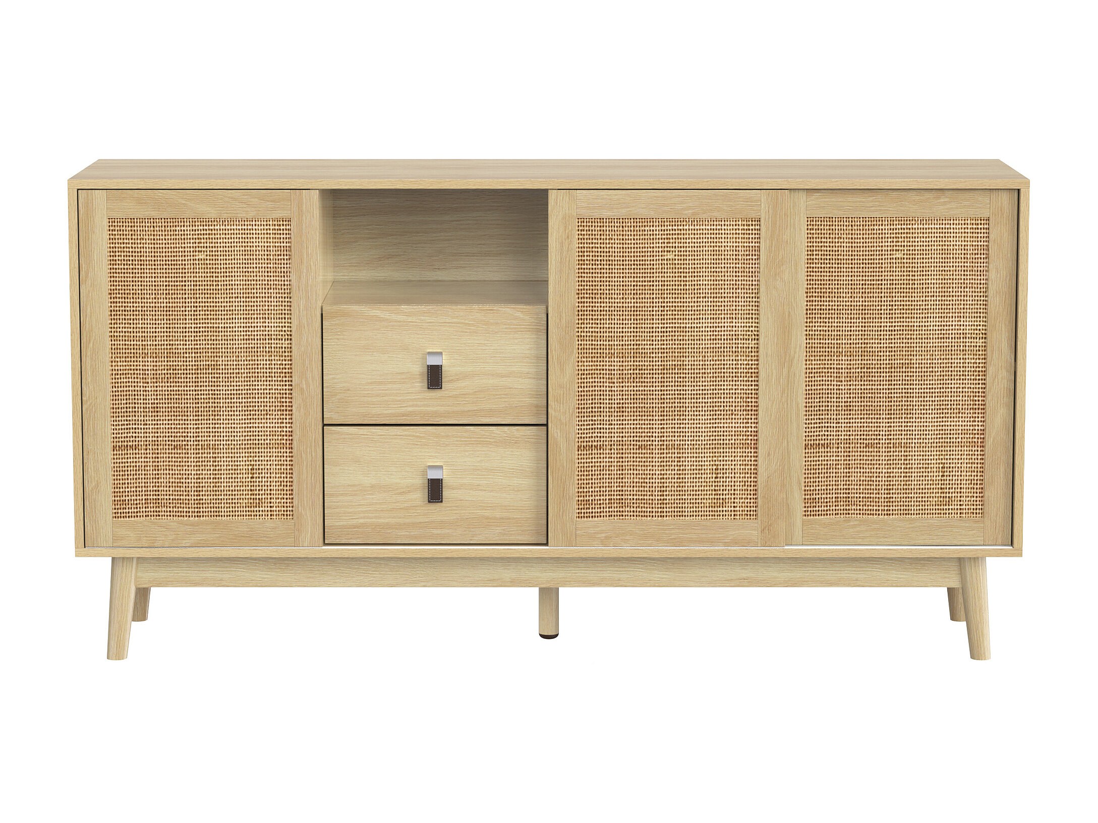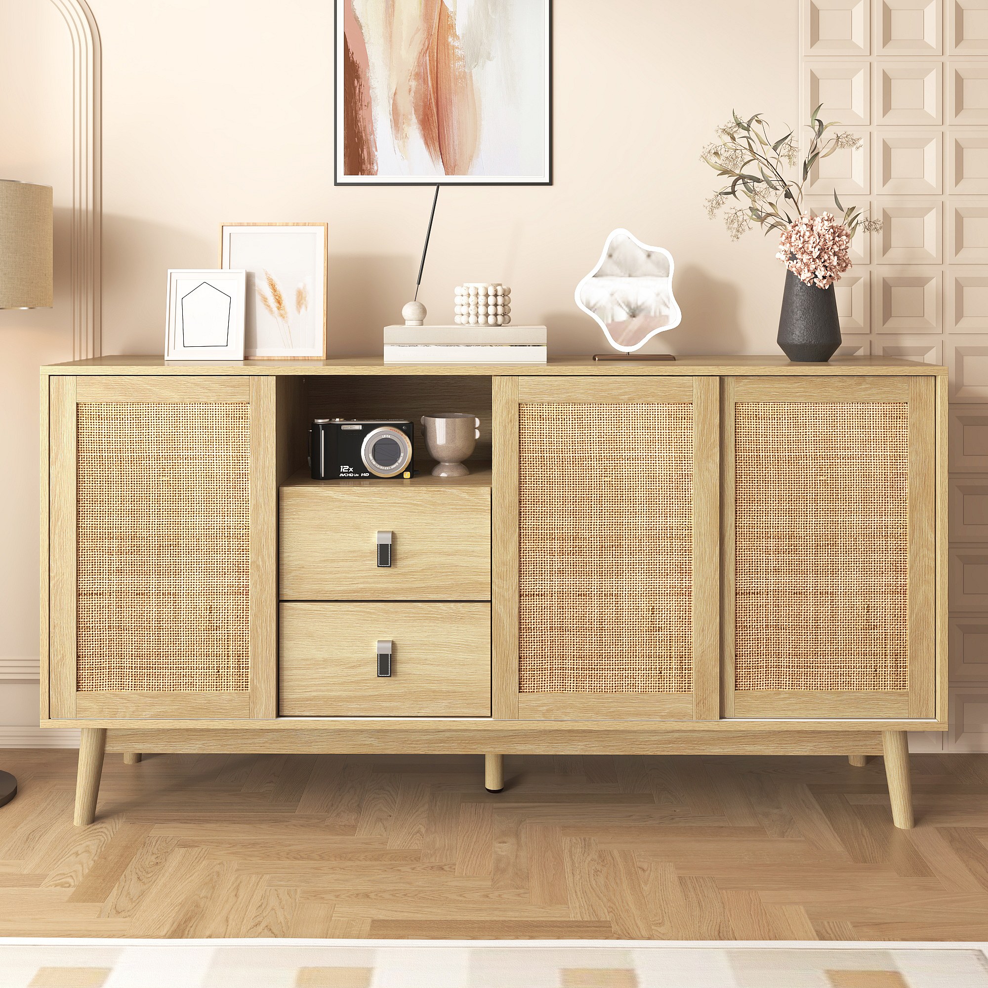 Kredens w jasnym naturalnym kolorze z 3 drzwiami rattanowymi i 2 szufladami do przechowywania - do salonu