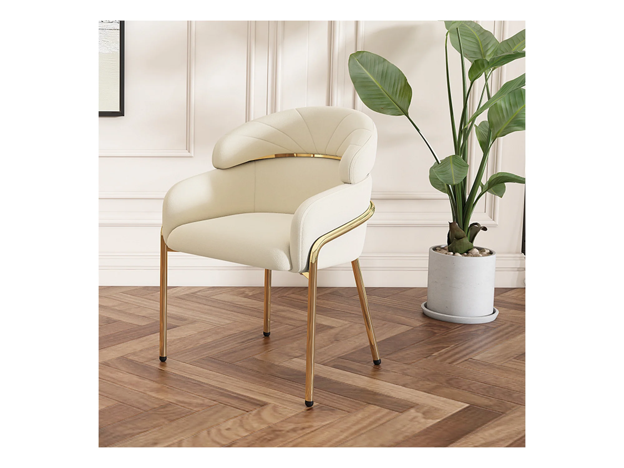 1 krzesło do jadalni z beżowego aksamitu z tapicerowanym oparciem i złotymi metalowymi nogami
