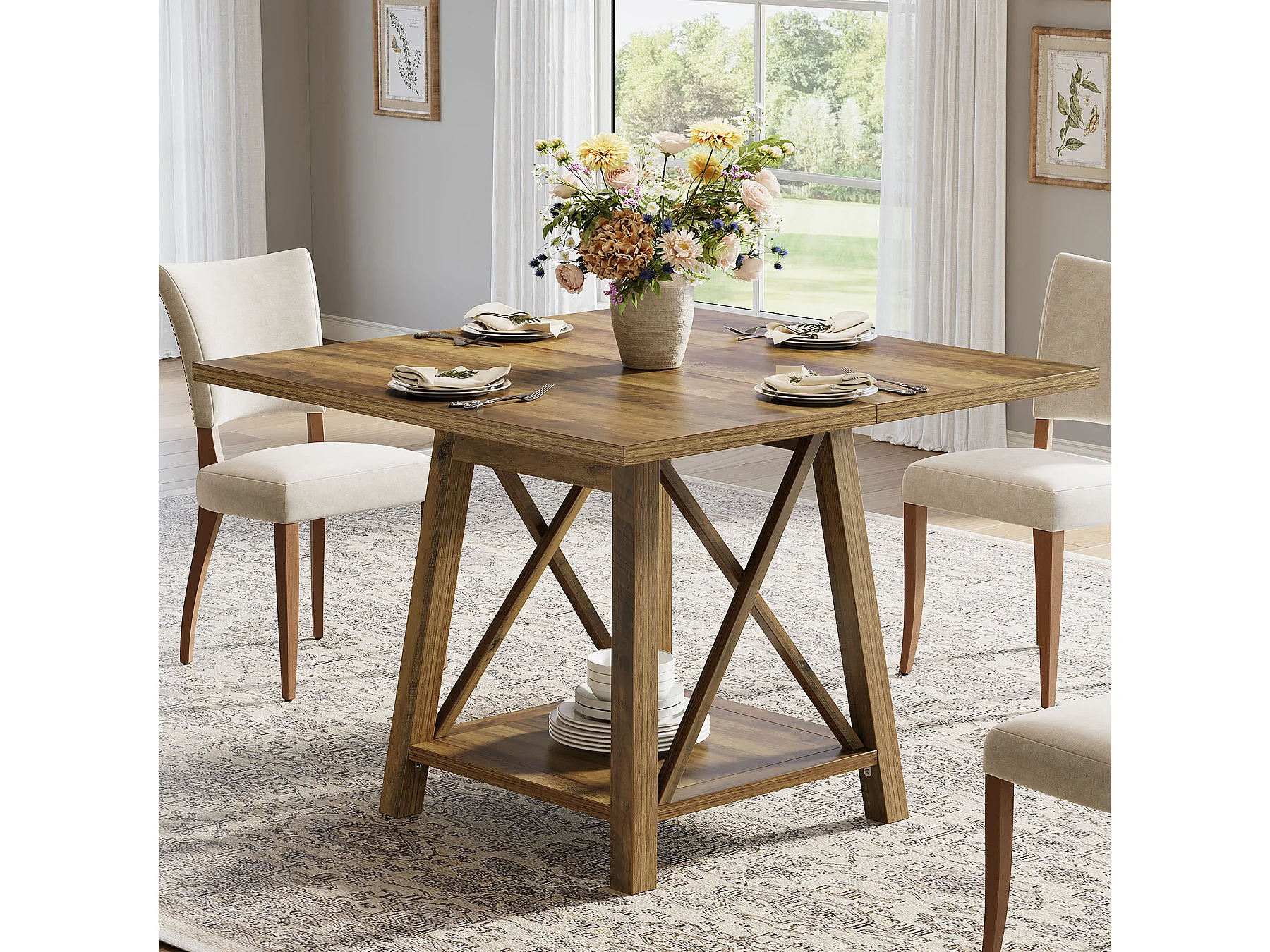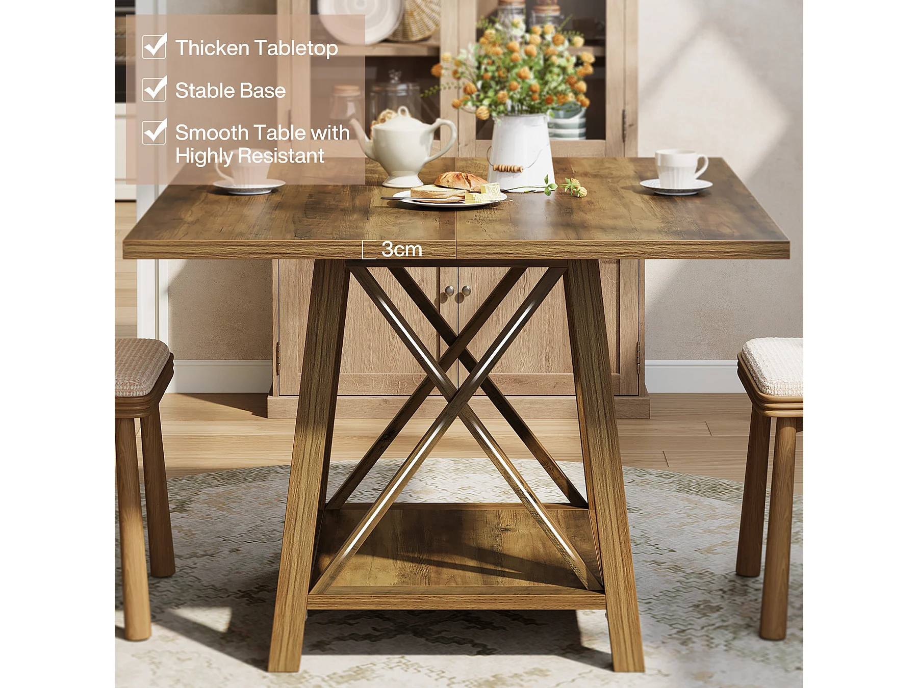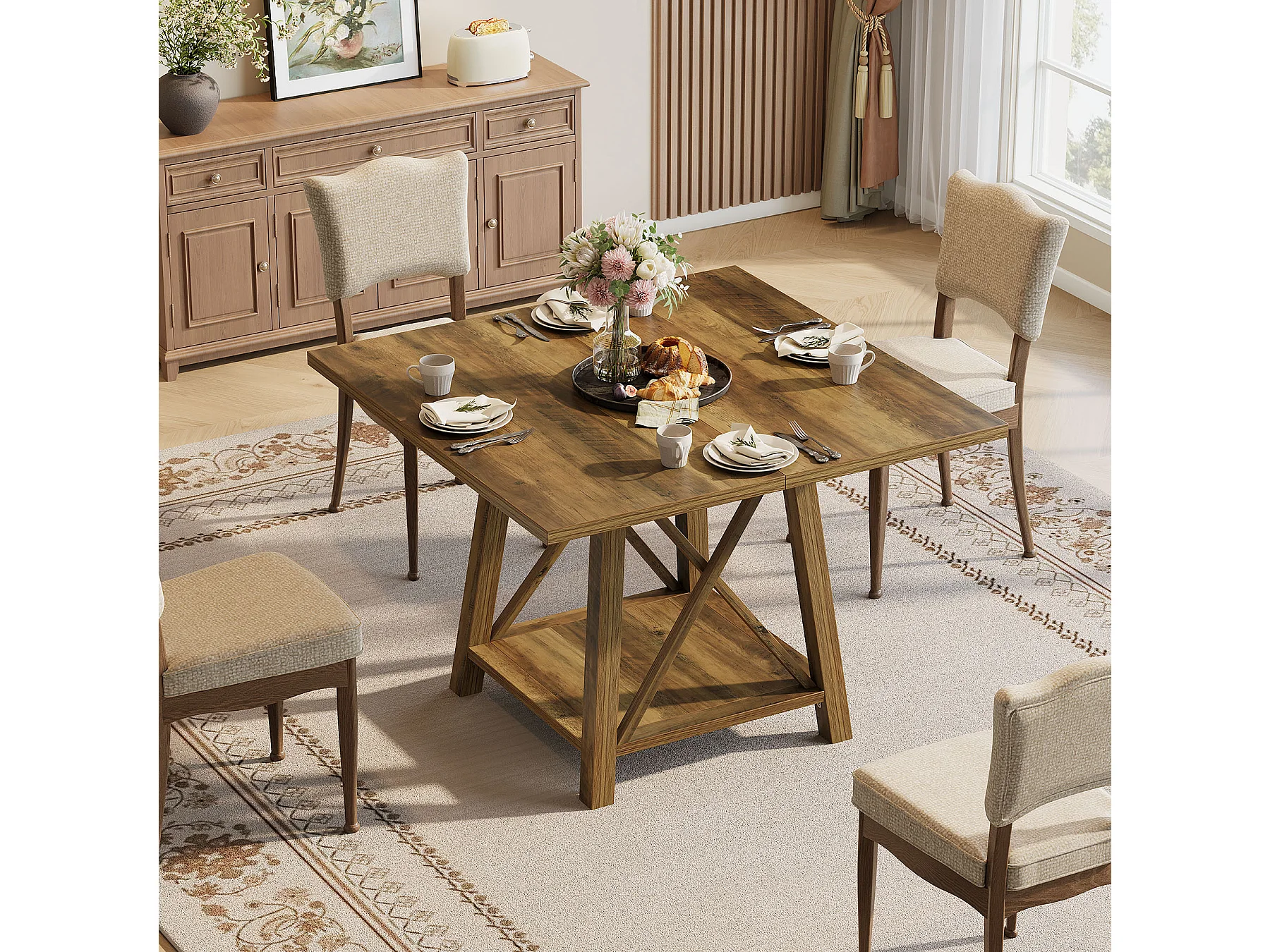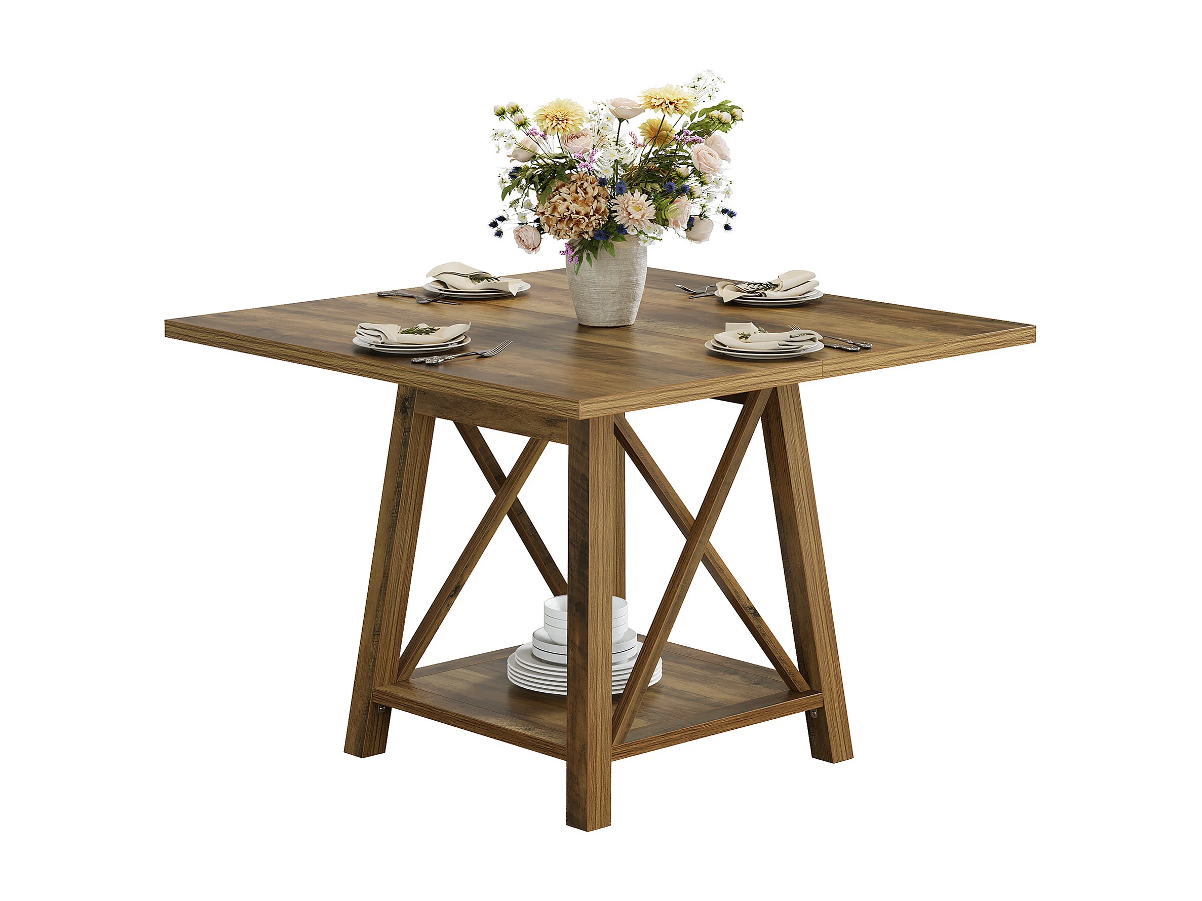 Kwadratowy stół jadalny dla 4 osób, stół kuchenny w stylu rustykalnym z półkami do przechowywania