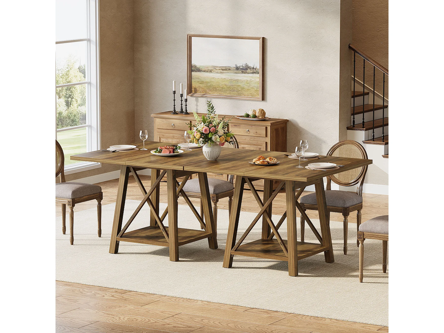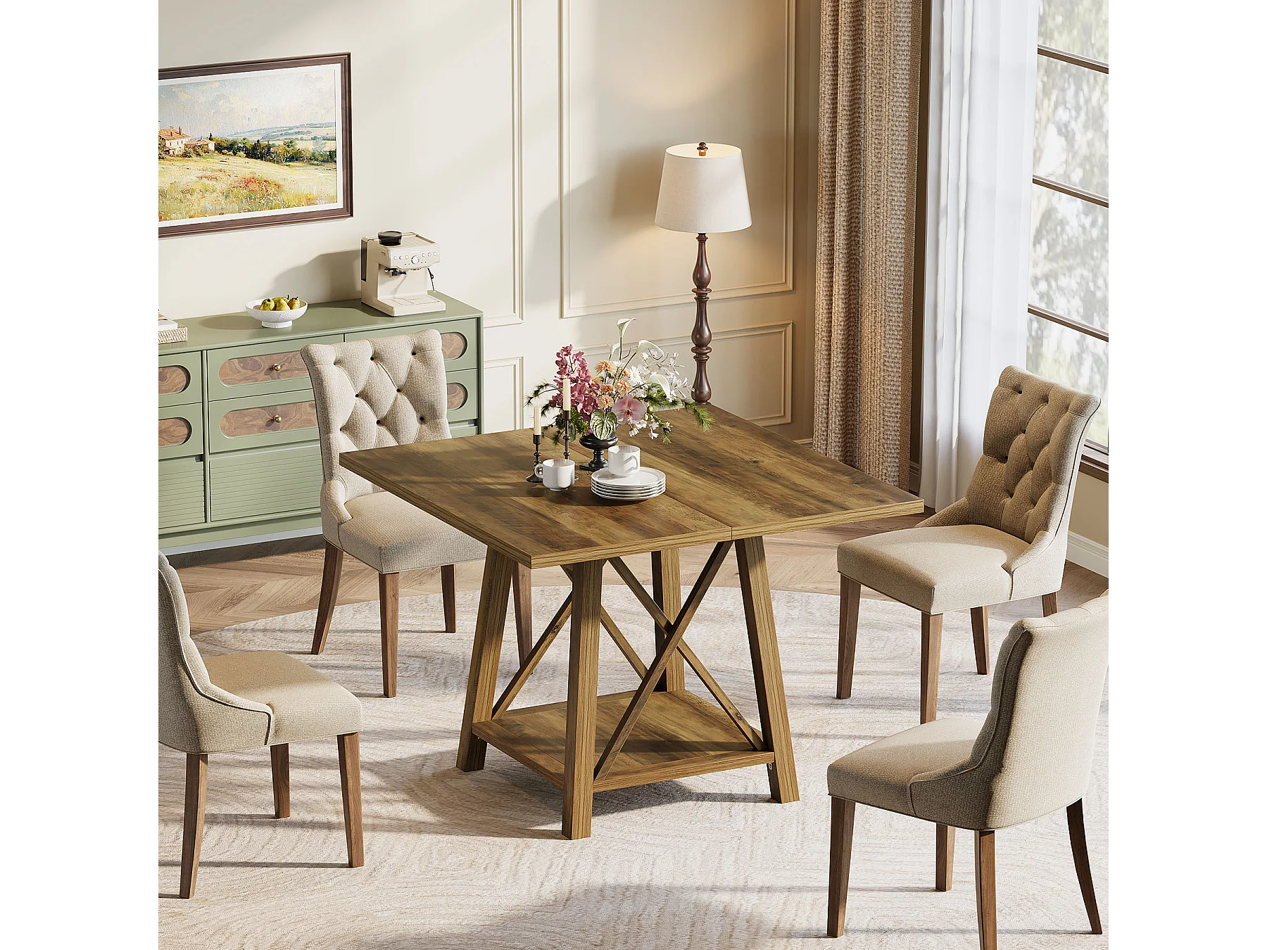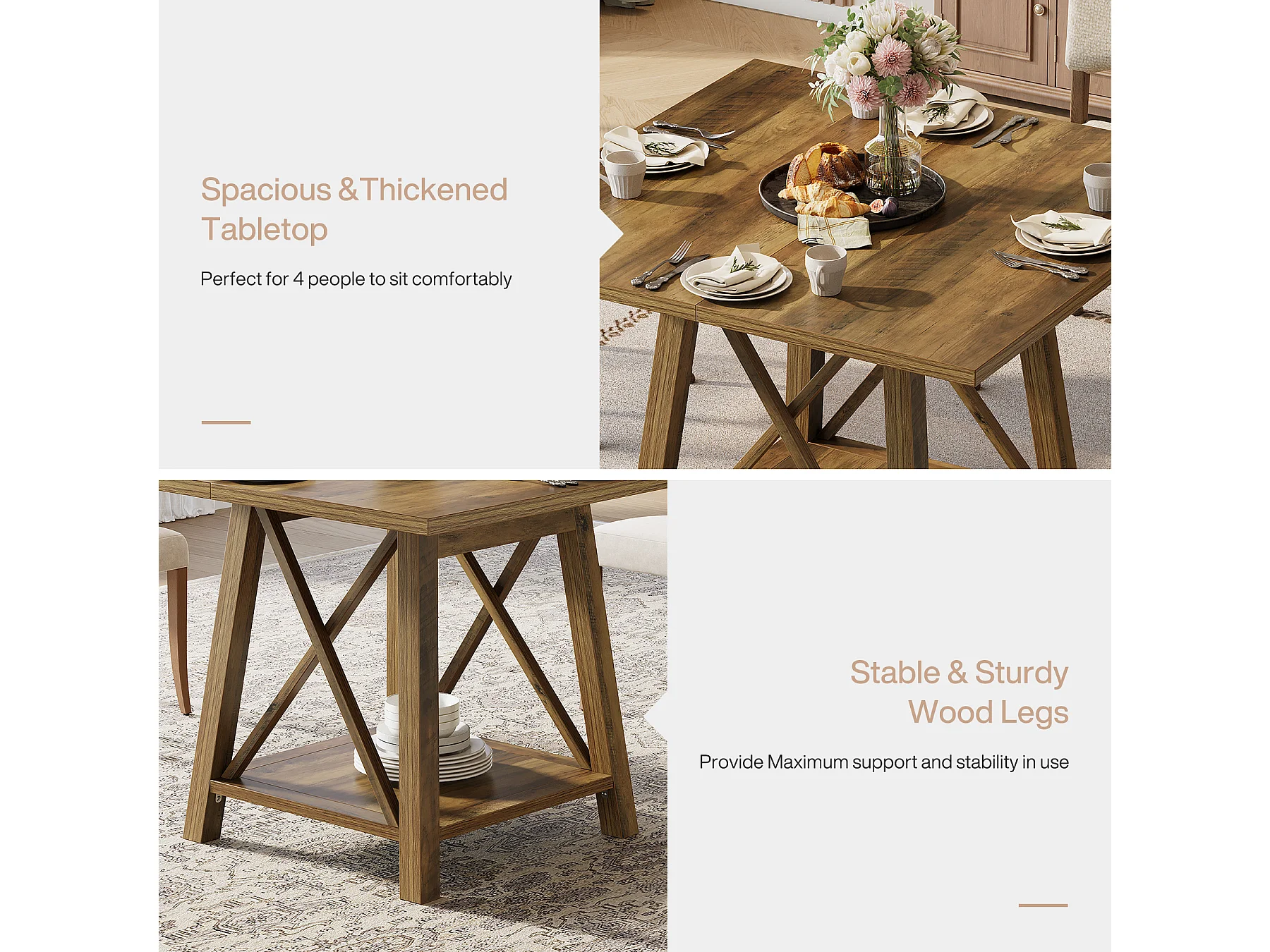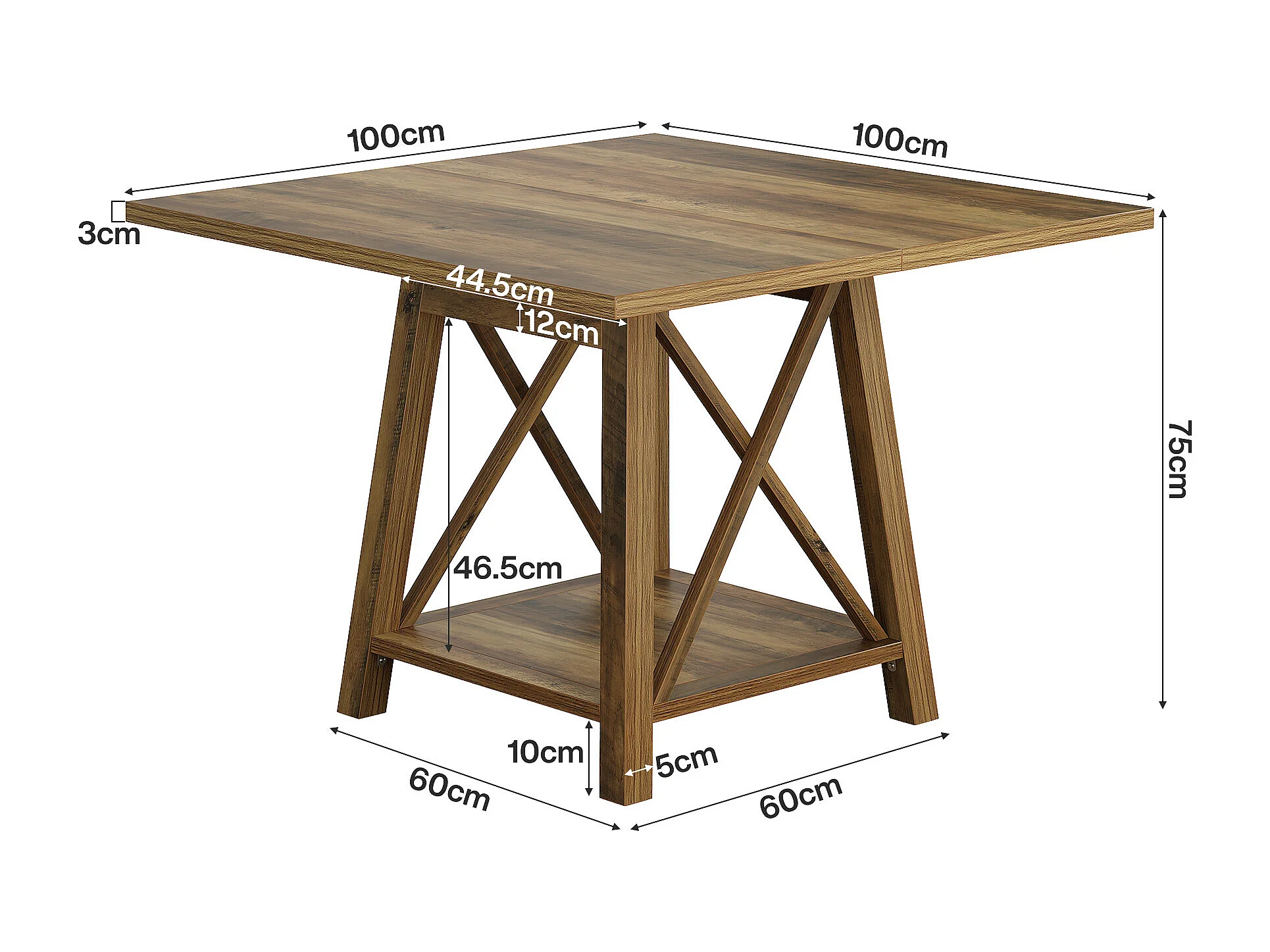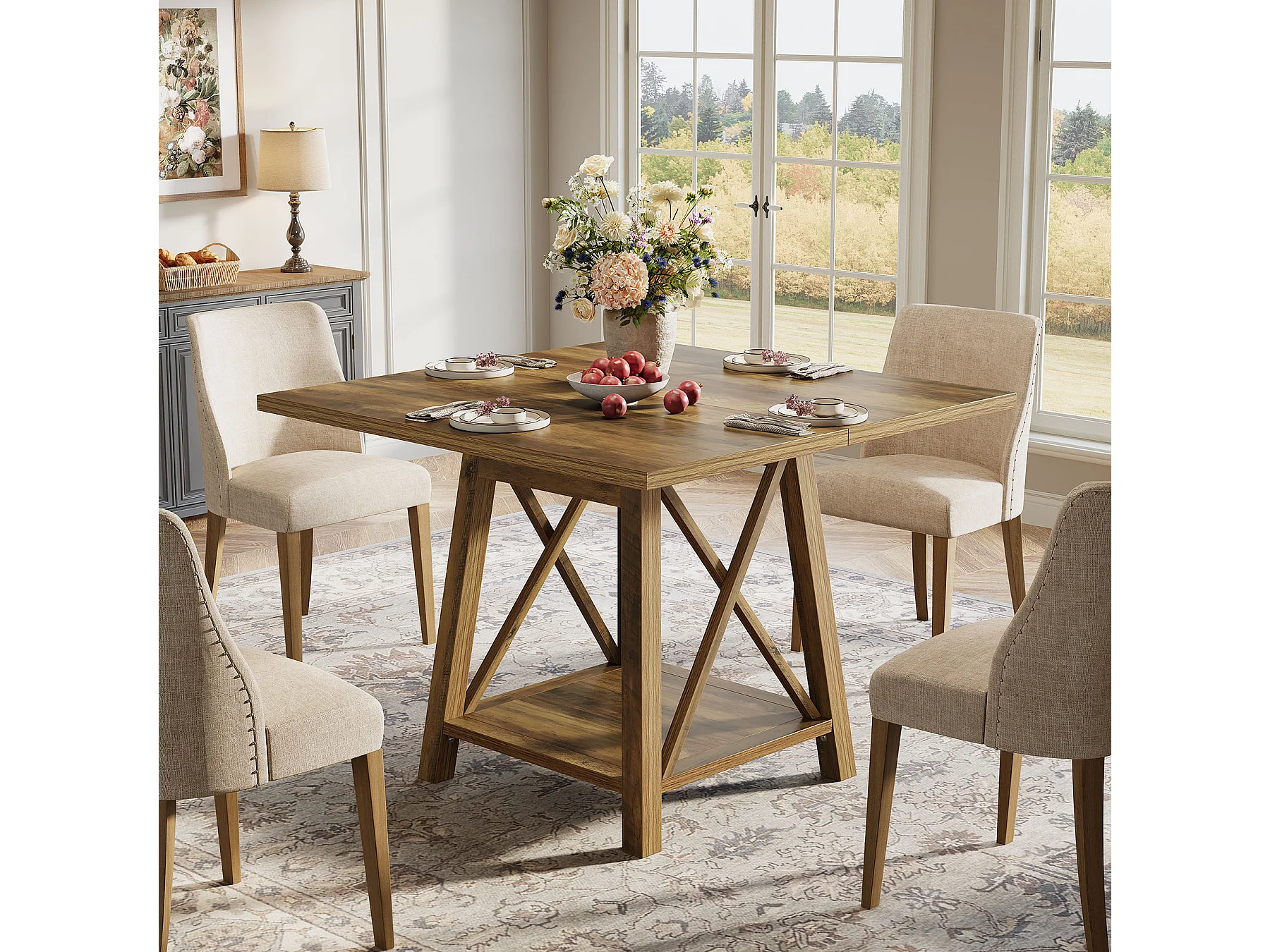 Kwadratowy stół jadalny dla 4 osób, stół kuchenny w stylu rustykalnym z półkami do przechowywania