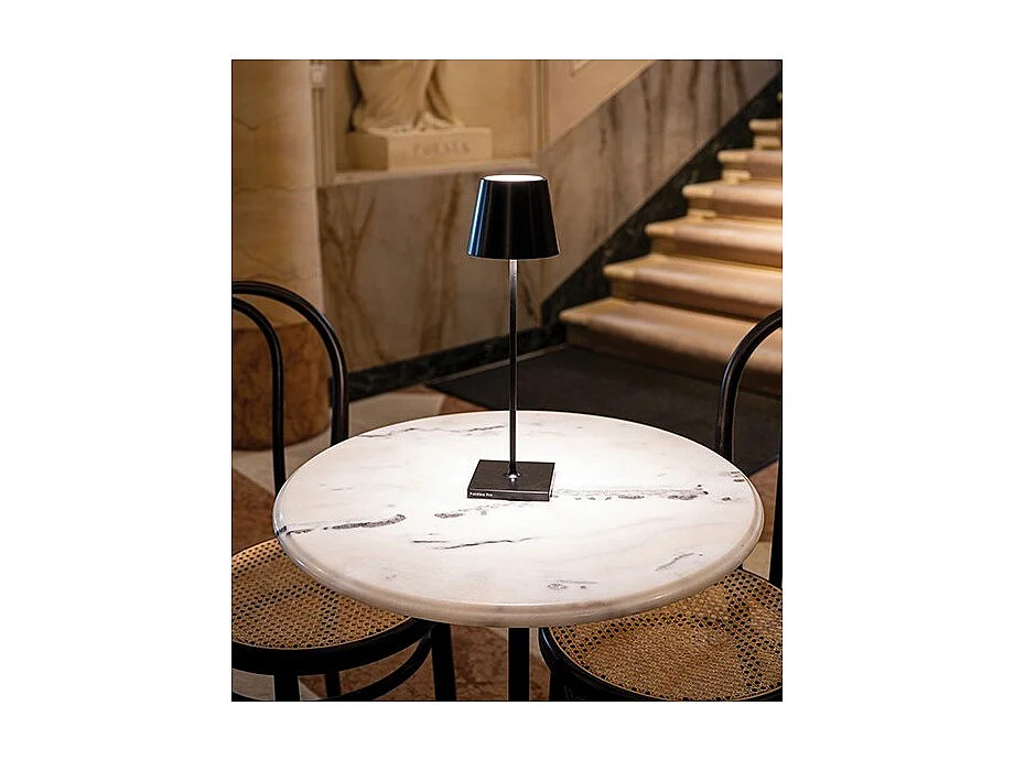 Lampa stołowa LED Zafferano Poldina Pro Black, akumulatorowa i ściemnialna, z czasem pracy baterii do 12 godzin. Nadaje się do użytku na zewnątrz