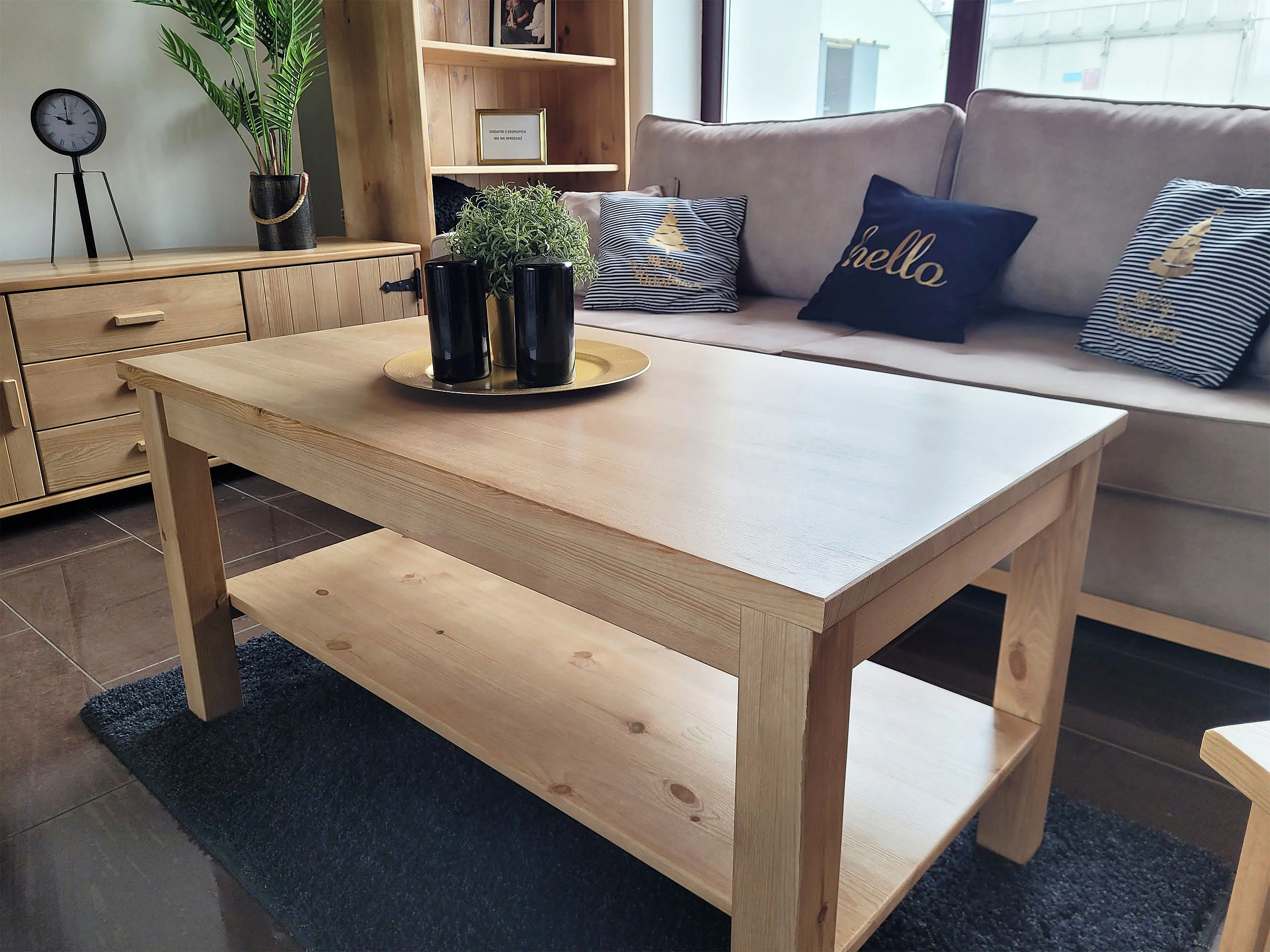 Stolik kawowy z szufladą przesuwną i pustym miejscem, drewno lite, długość 110 cm.