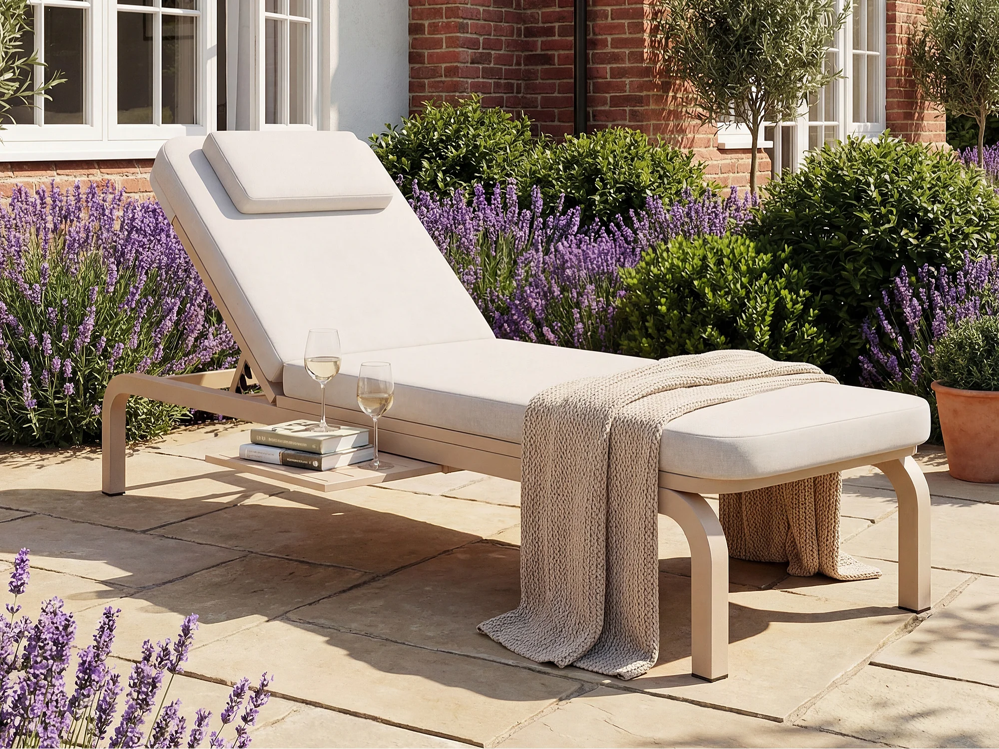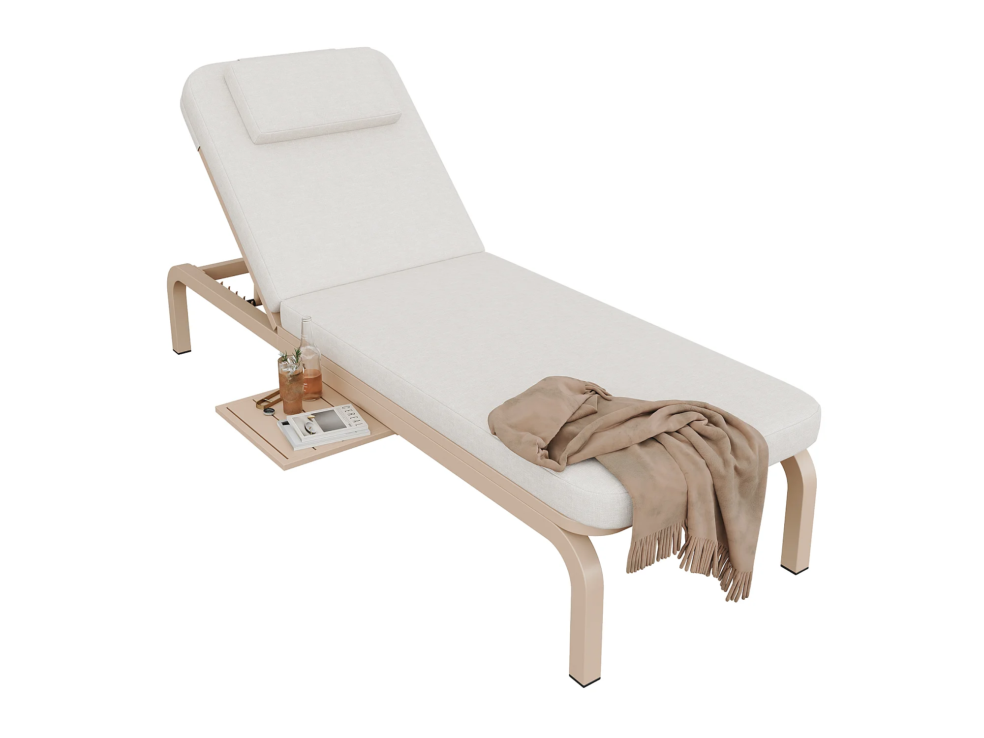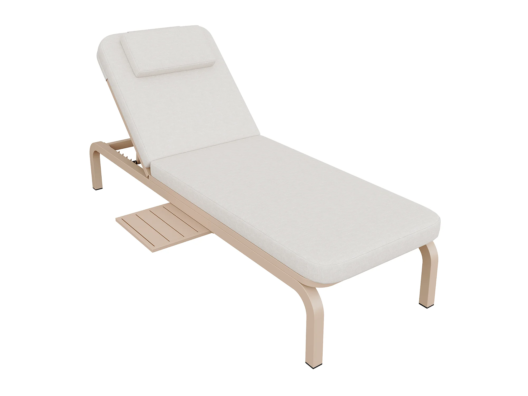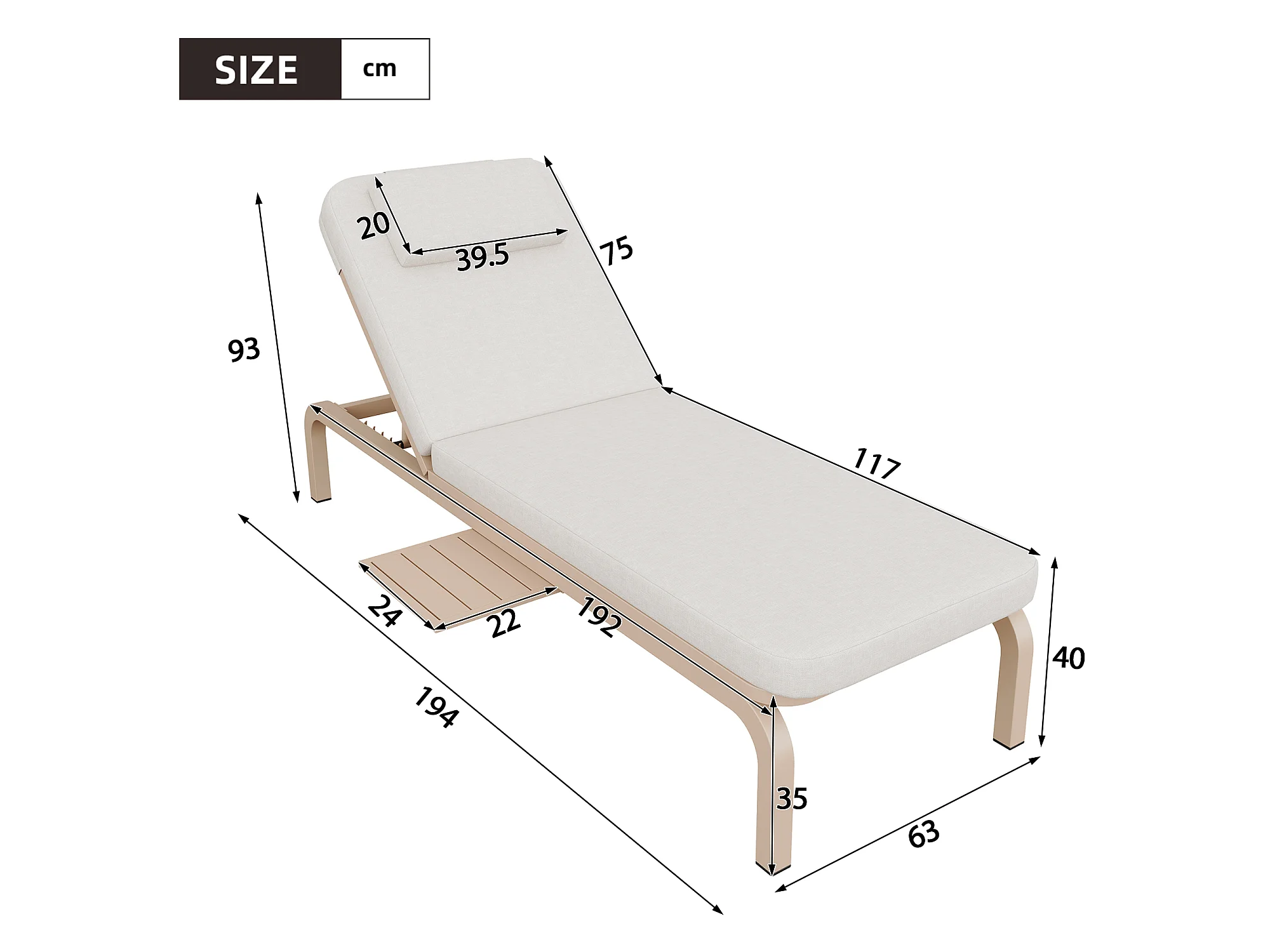 Leżak ogrodowy pojedynczy - regulowane oparcie (5 pozycji), z rozsuwanym stolikiem bocznym i zagłówkiem - Beżowy