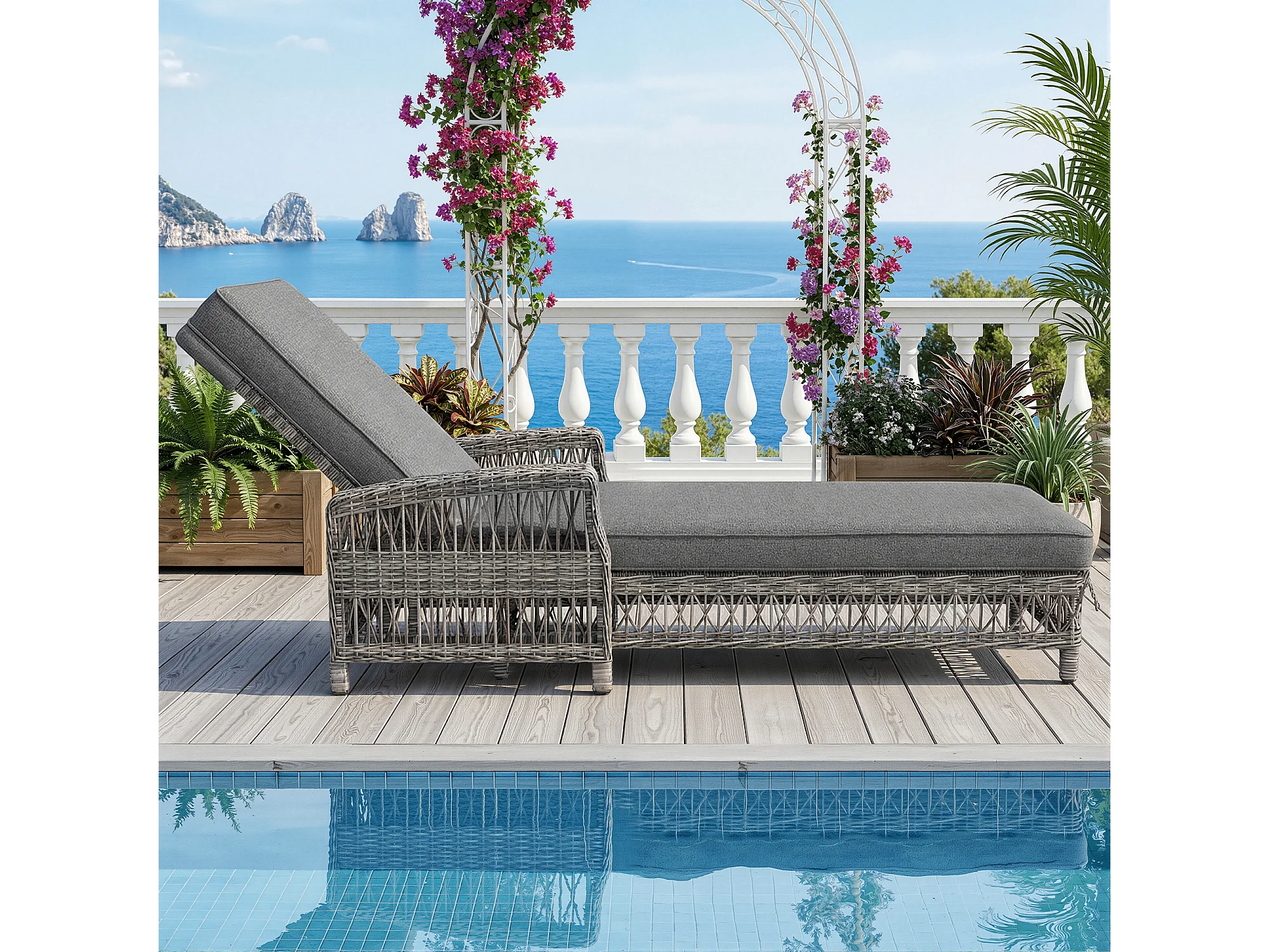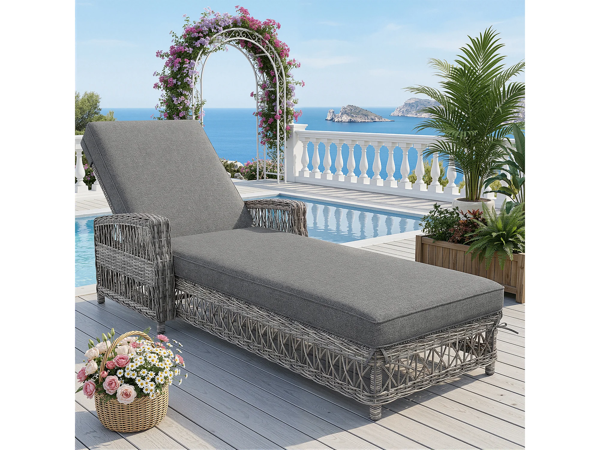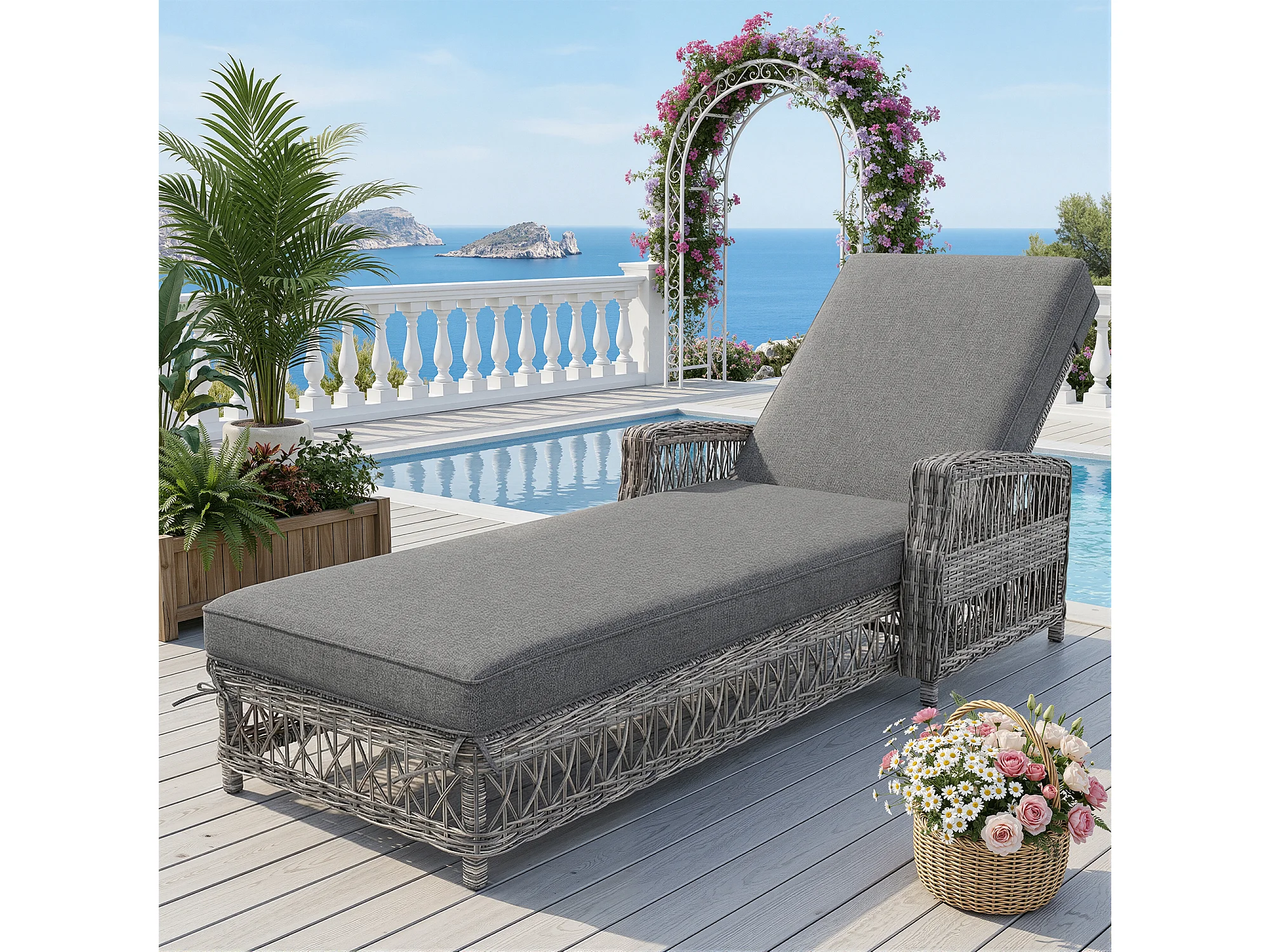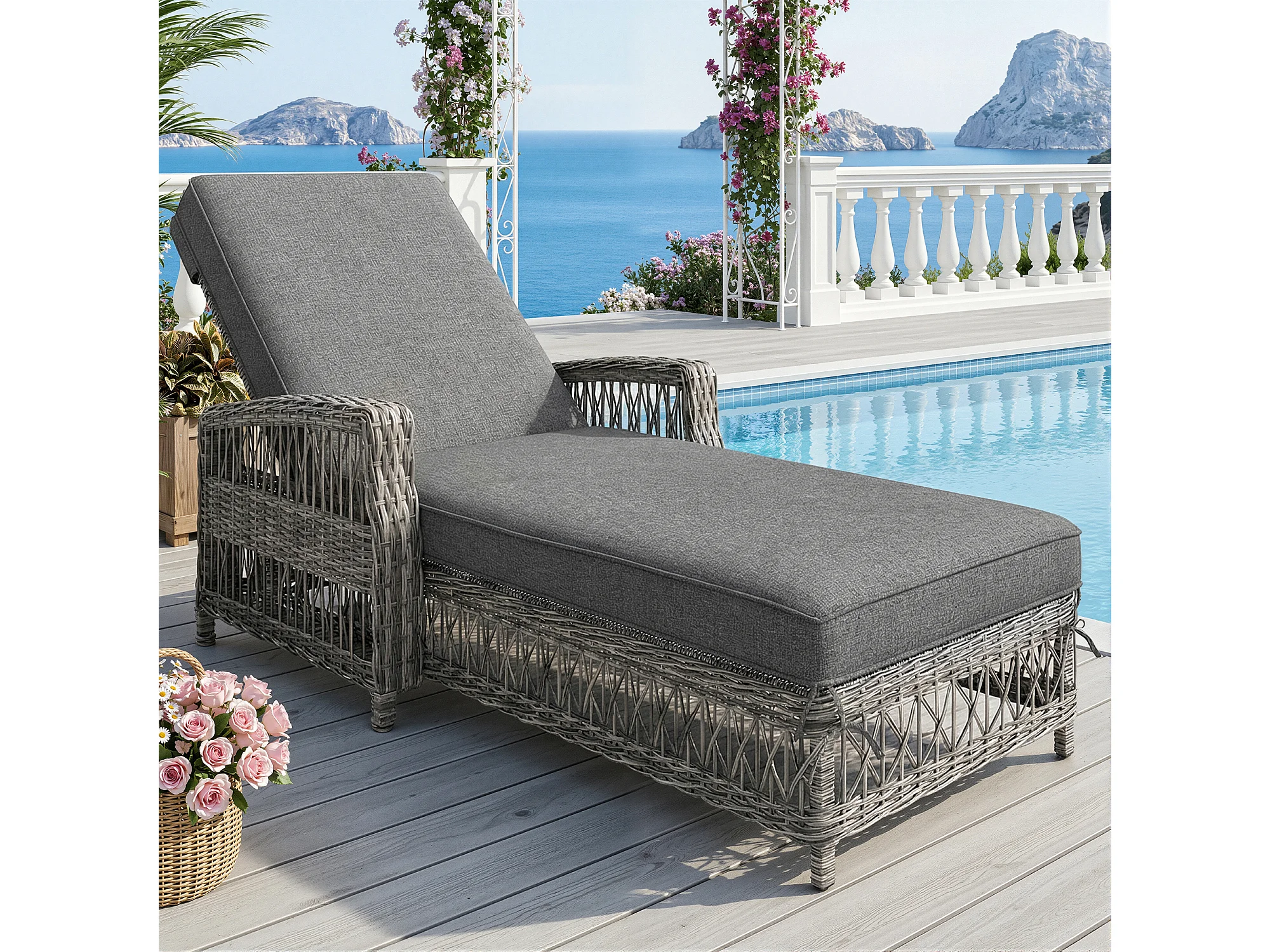 Leżak rattanowy (1 szt.) - 192 x 70 x 58 cm - z regulowanym oparciem + zdejmowana poduszka - metal + tworzywo sztuczne - szary