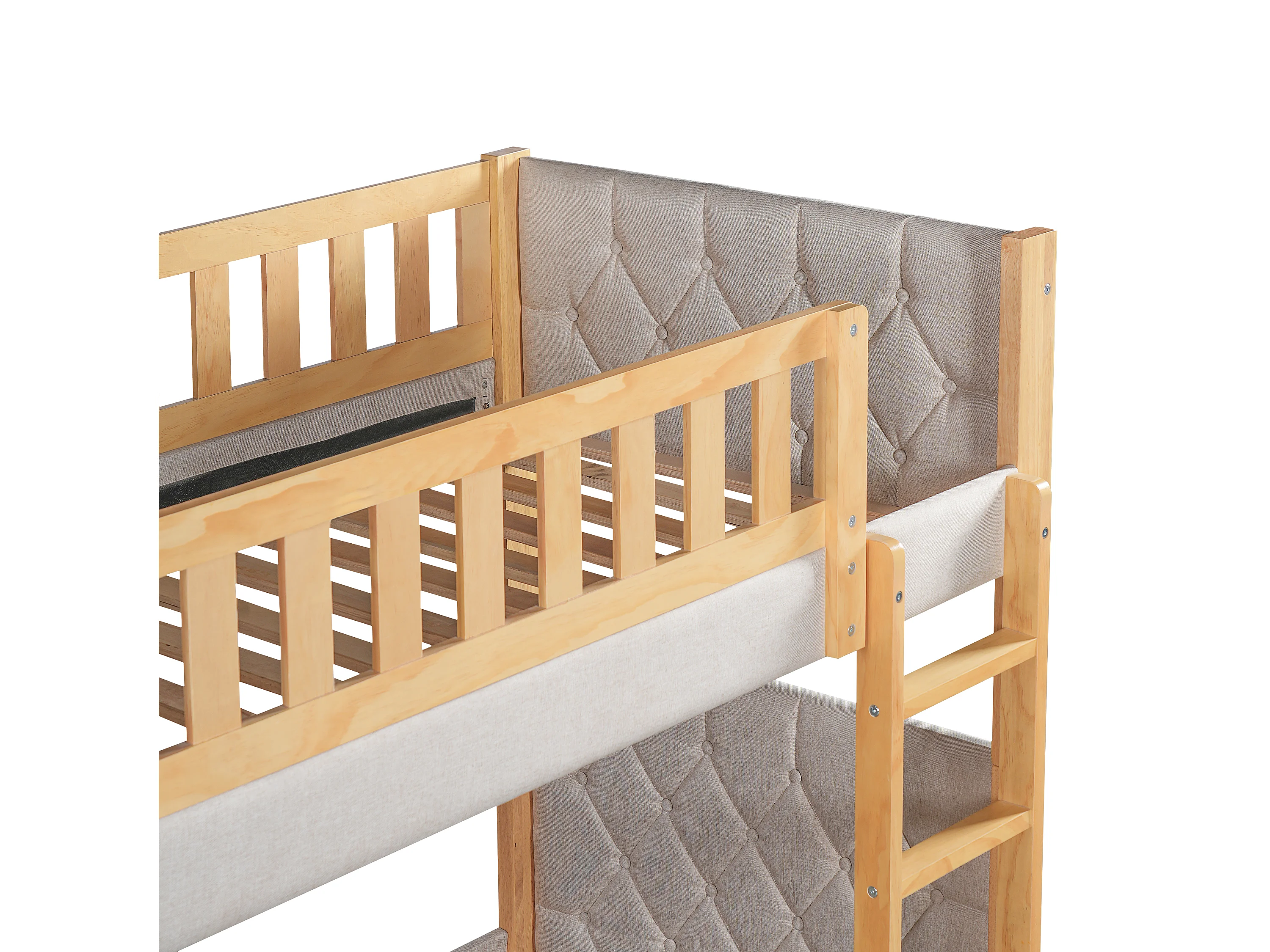 Łóżka piętrowe dla dzieci 90x200cm - tapicerowany zagłówek - z 4-stopniową drabiną - drewno hevea + MDF - Naturalny+Szary (bez materaca)