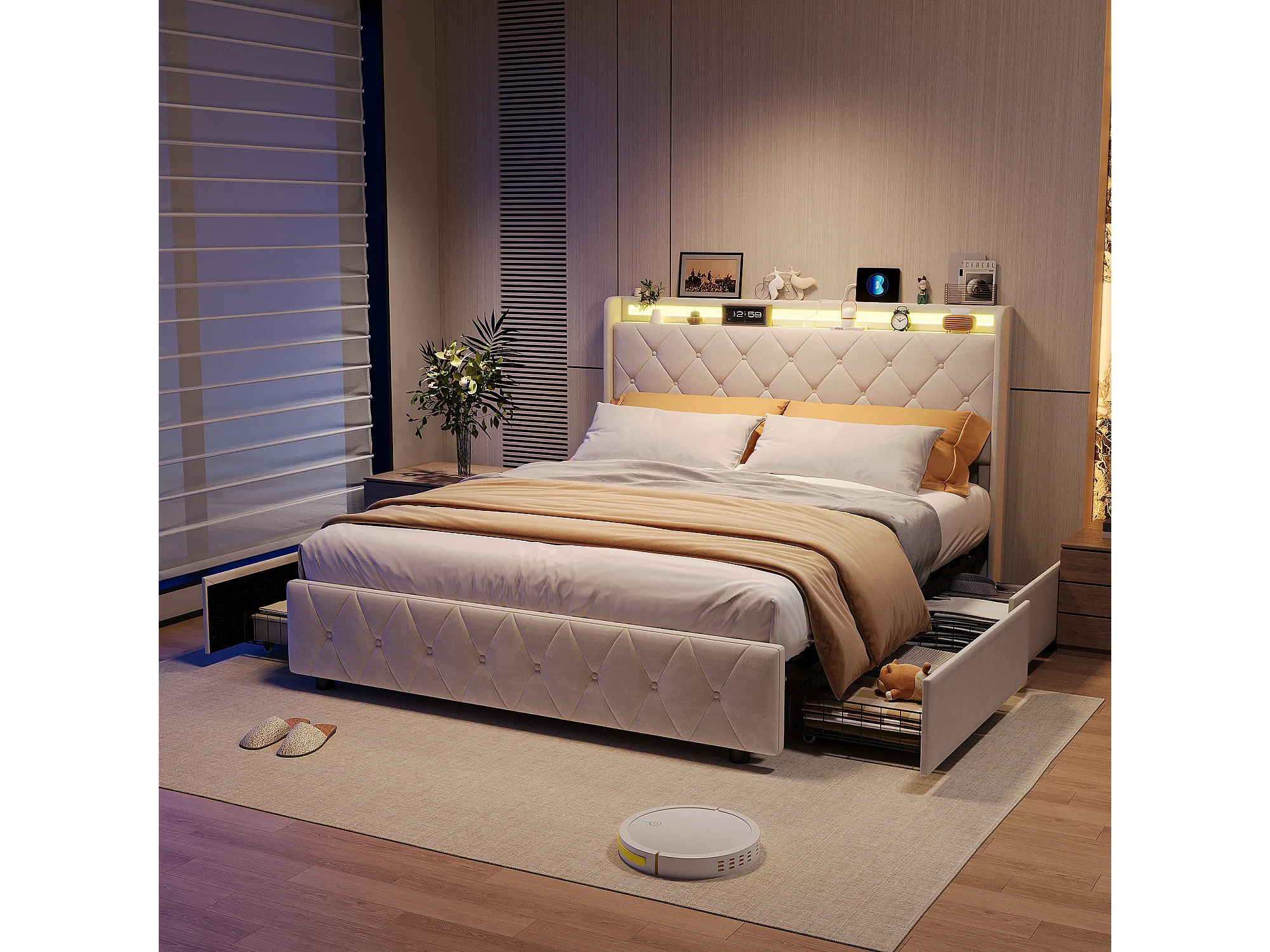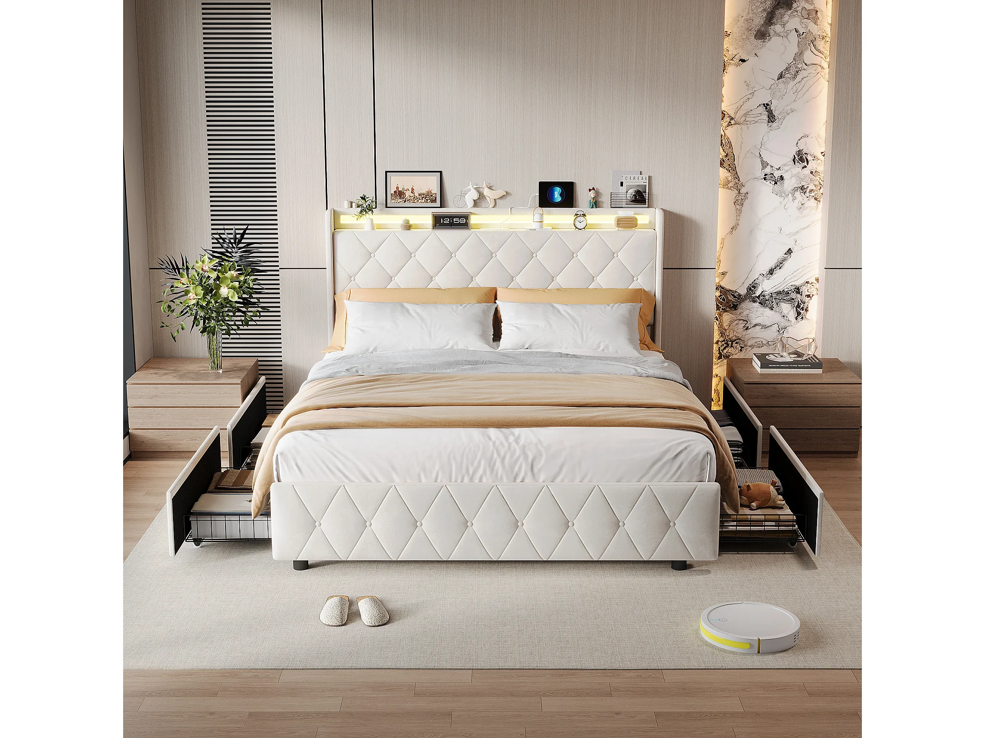 Łóżko 140x200 cm z 4 szufladami, oświetleniem LED, szafkami nocnymi ze schowkiem, otwartymi przegrodami, podstawą z listew, ładowarkami USB i typu C - beżowe