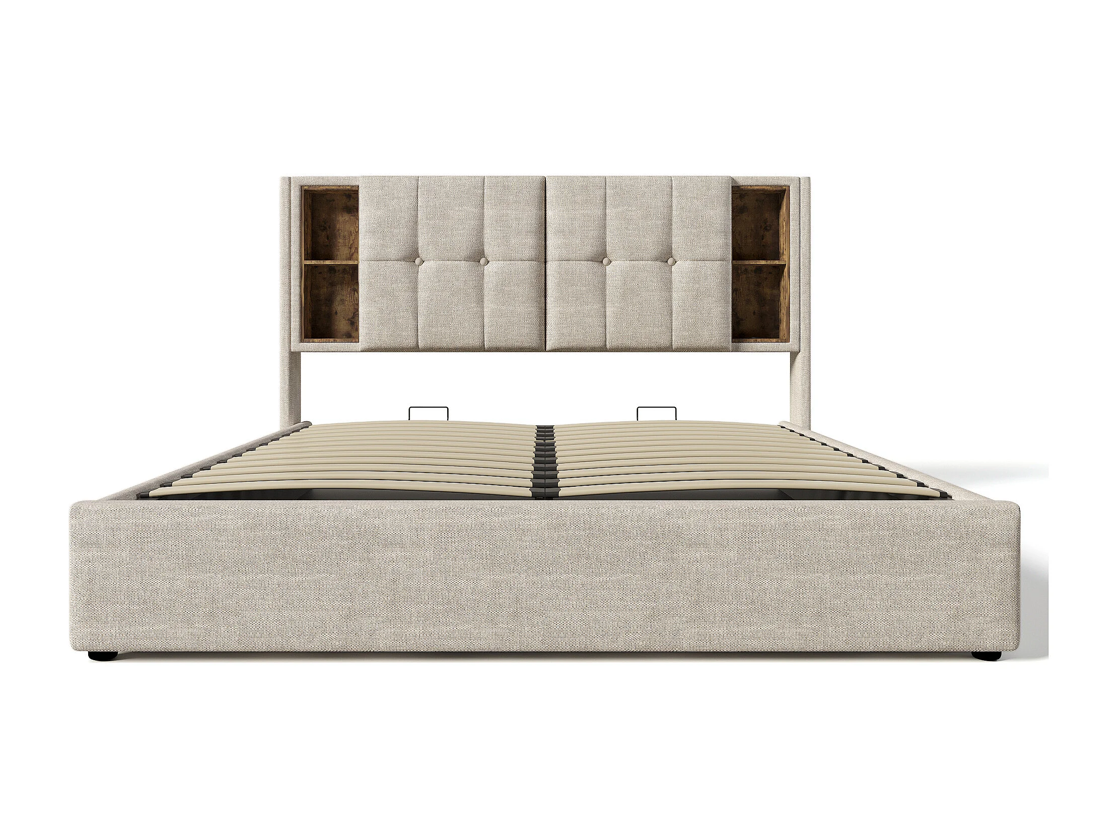 Łóżko 160x200 cm z pojemnikiem na pościel - z zagłówkiem i schowkiem, USB, typ C, stelaż - len - naturalny - materac wliczony w cenę