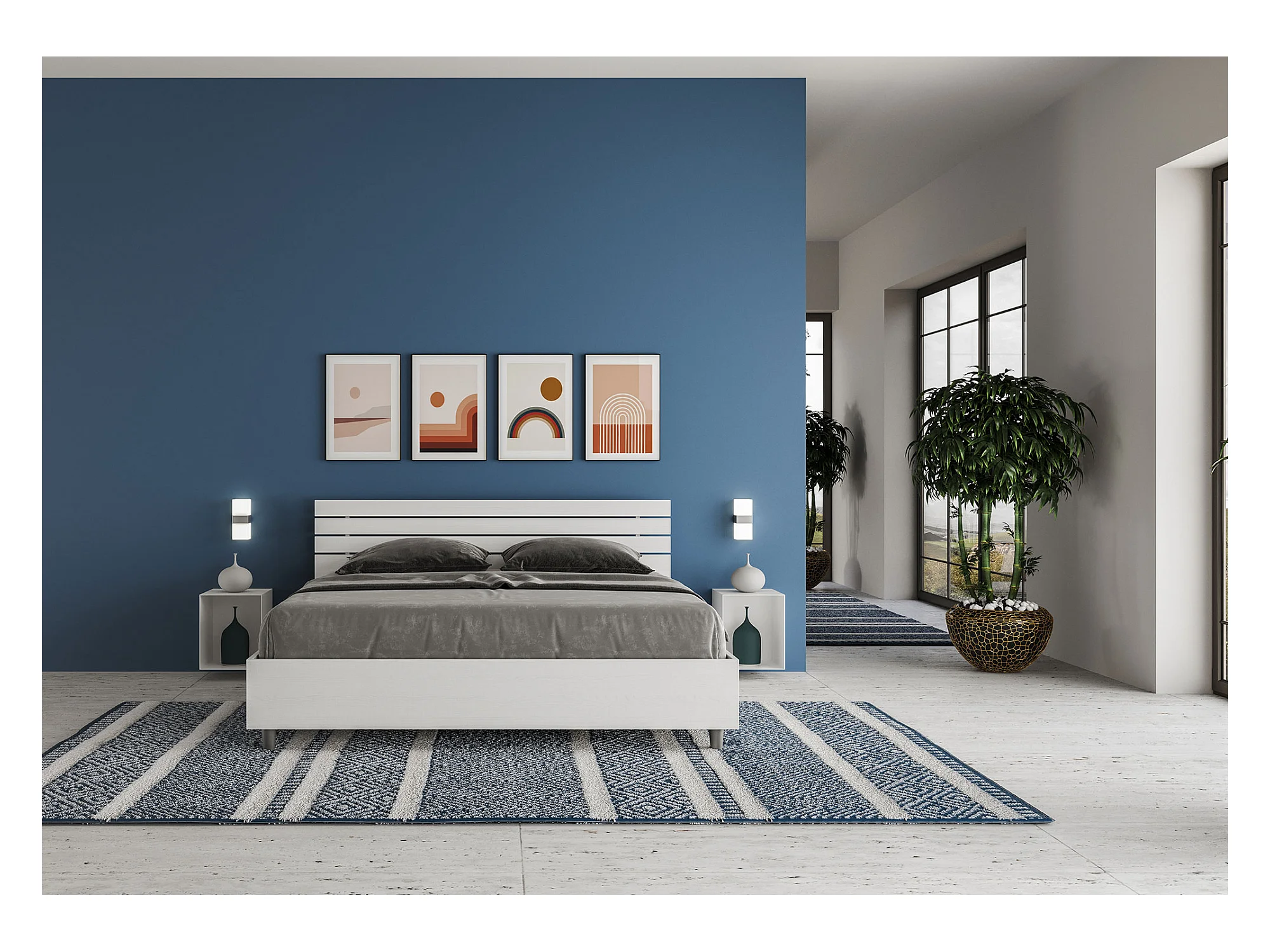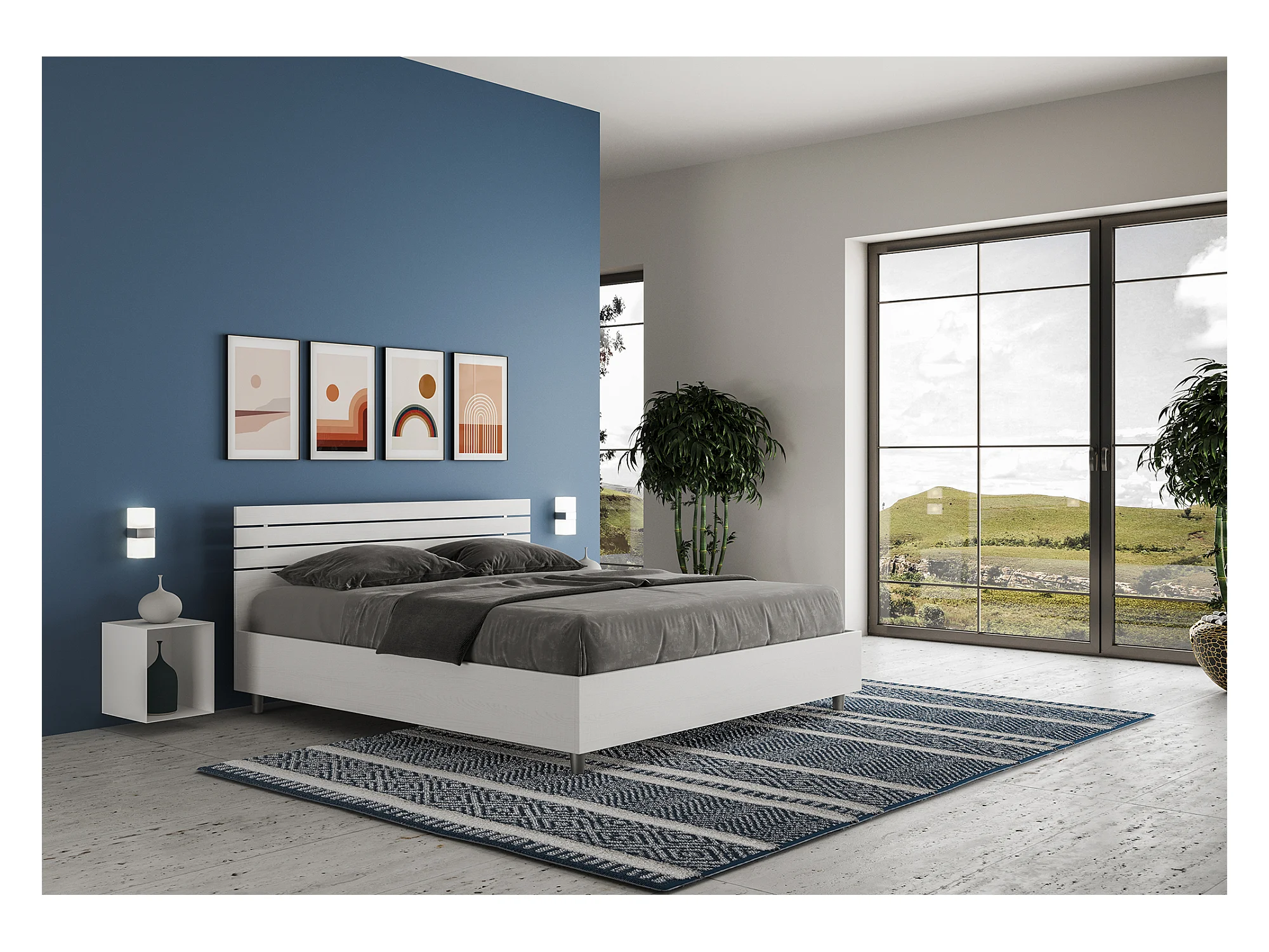 Łóżko podwójne z pojemnikiem na pościel, podnoszone podwójnie, 160x190 cm, drewno jesionowe białe, poduszki z białej skóry ekologicznej, Egos Appia