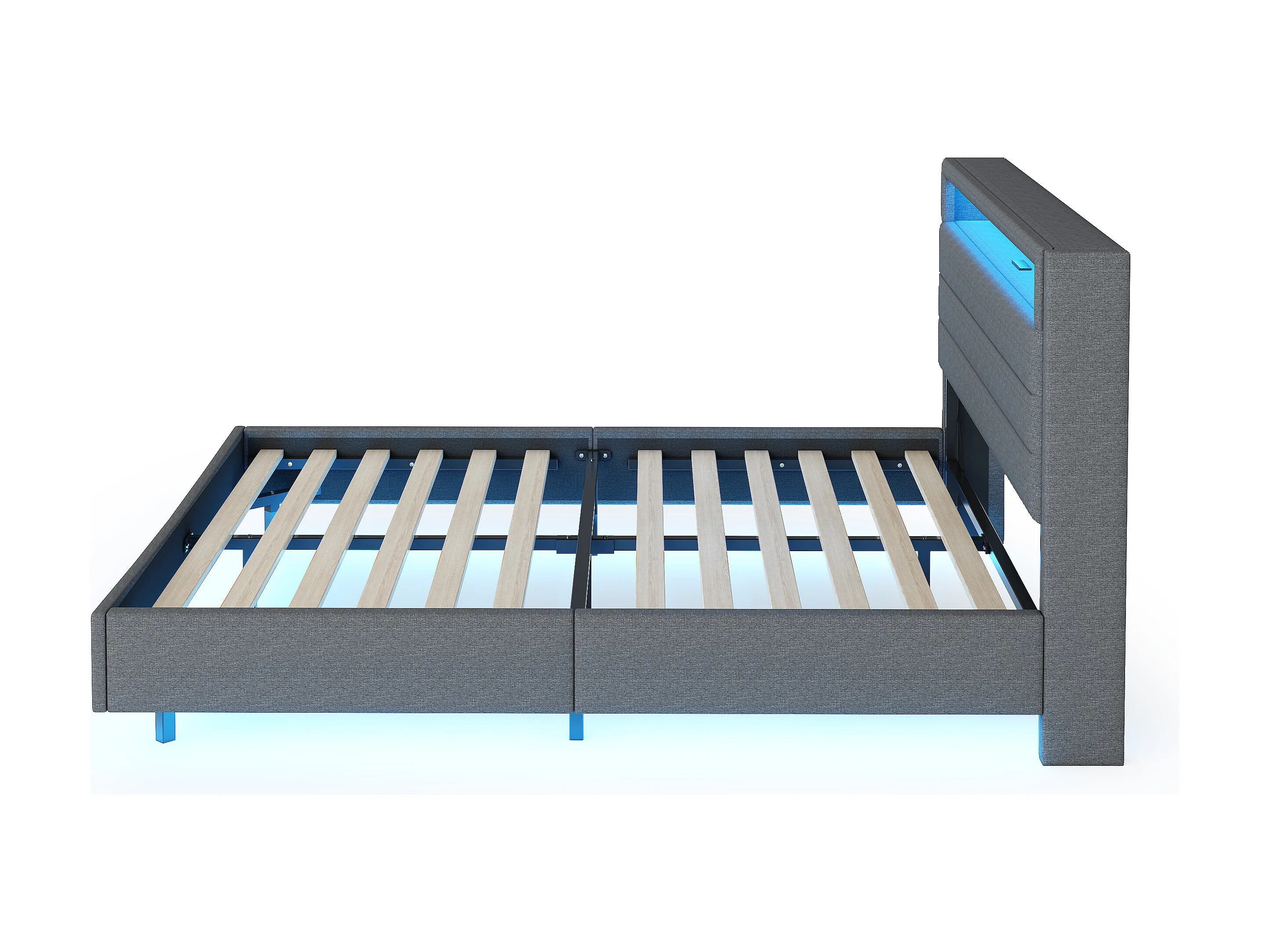 Łóżko dla dorosłych 140x200 cm, łóżko małżeńskie z USB i LED, zagłówek ze schowkiem - len szary (bez materaca)