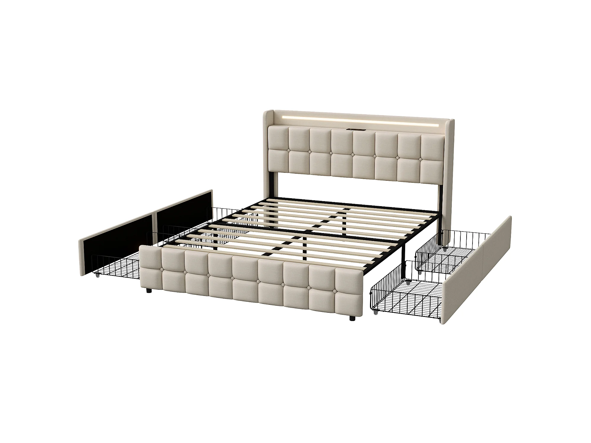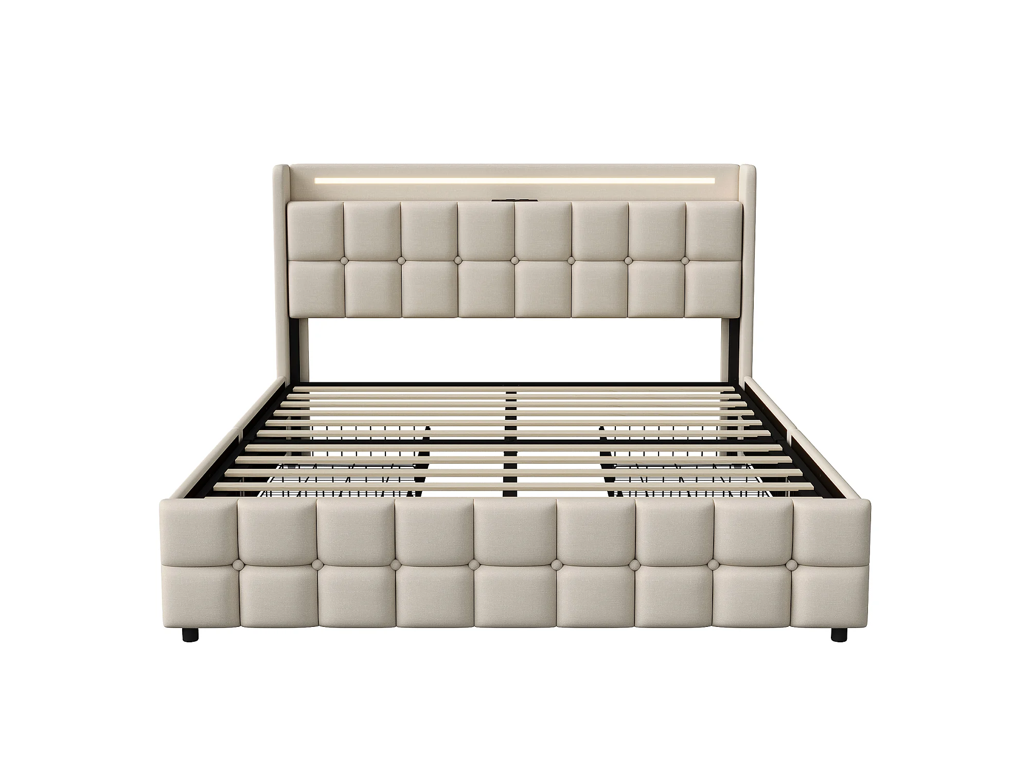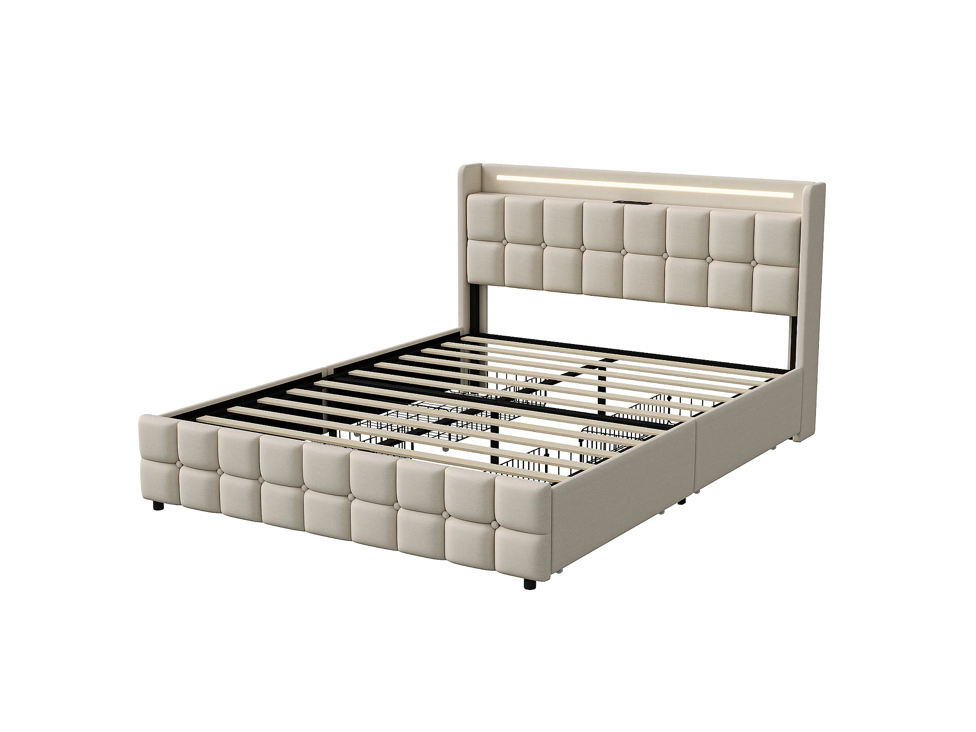 Łóżko dla Dorosłych 160x200 cm z Stelażem, Zagłówkiem z USB, Wielokolorowym Oświetleniem LED i 4 Szufladami do Przechowywania Beżowe