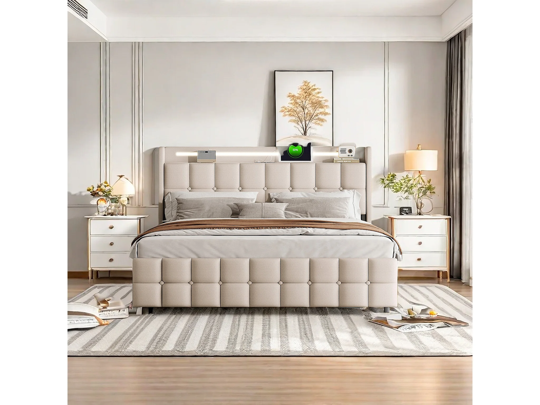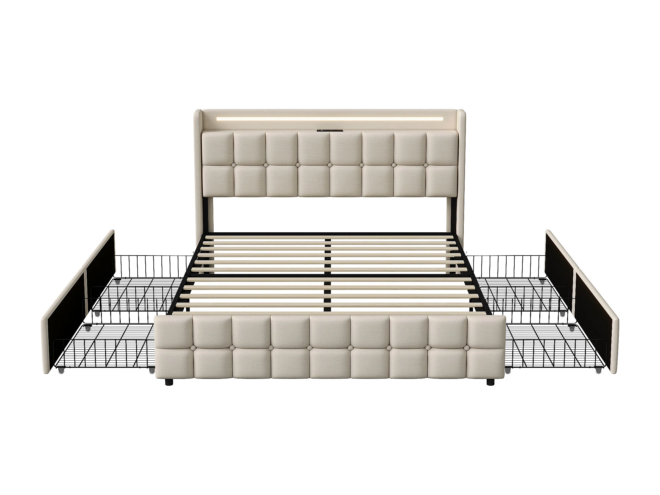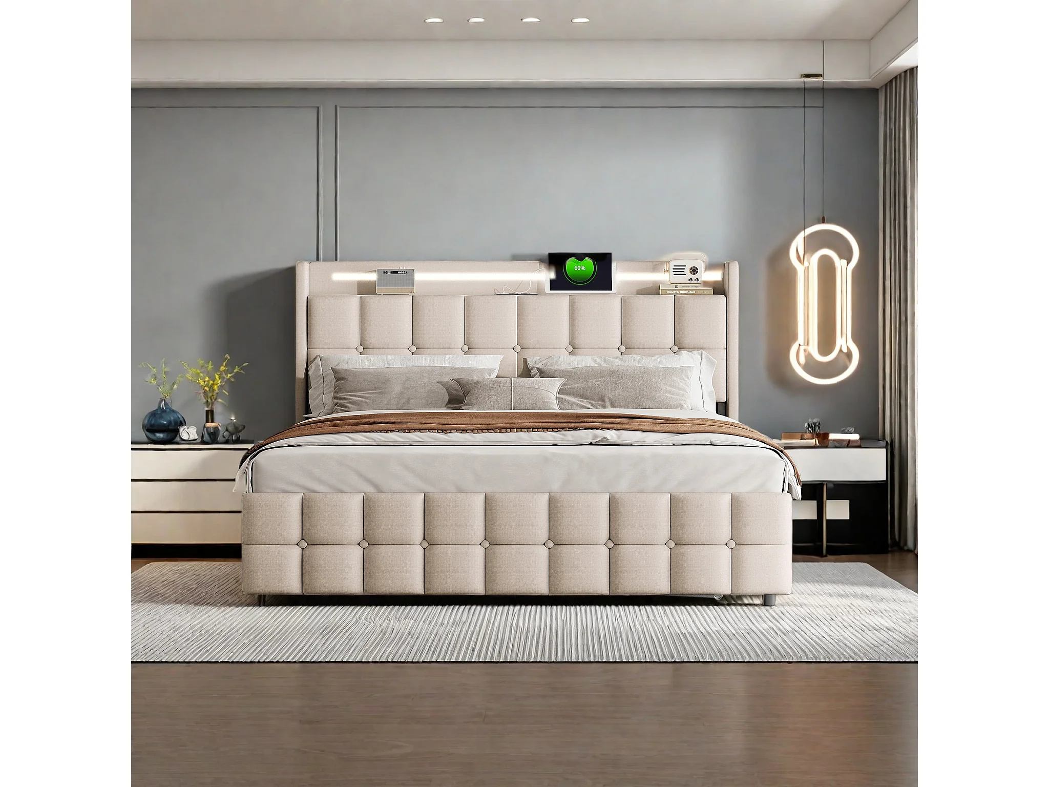 Łóżko dla Dorosłych 160x200 cm z Stelażem, Zagłówkiem z USB, Wielokolorowym Oświetleniem LED i 4 Szufladami do Przechowywania Beżowe