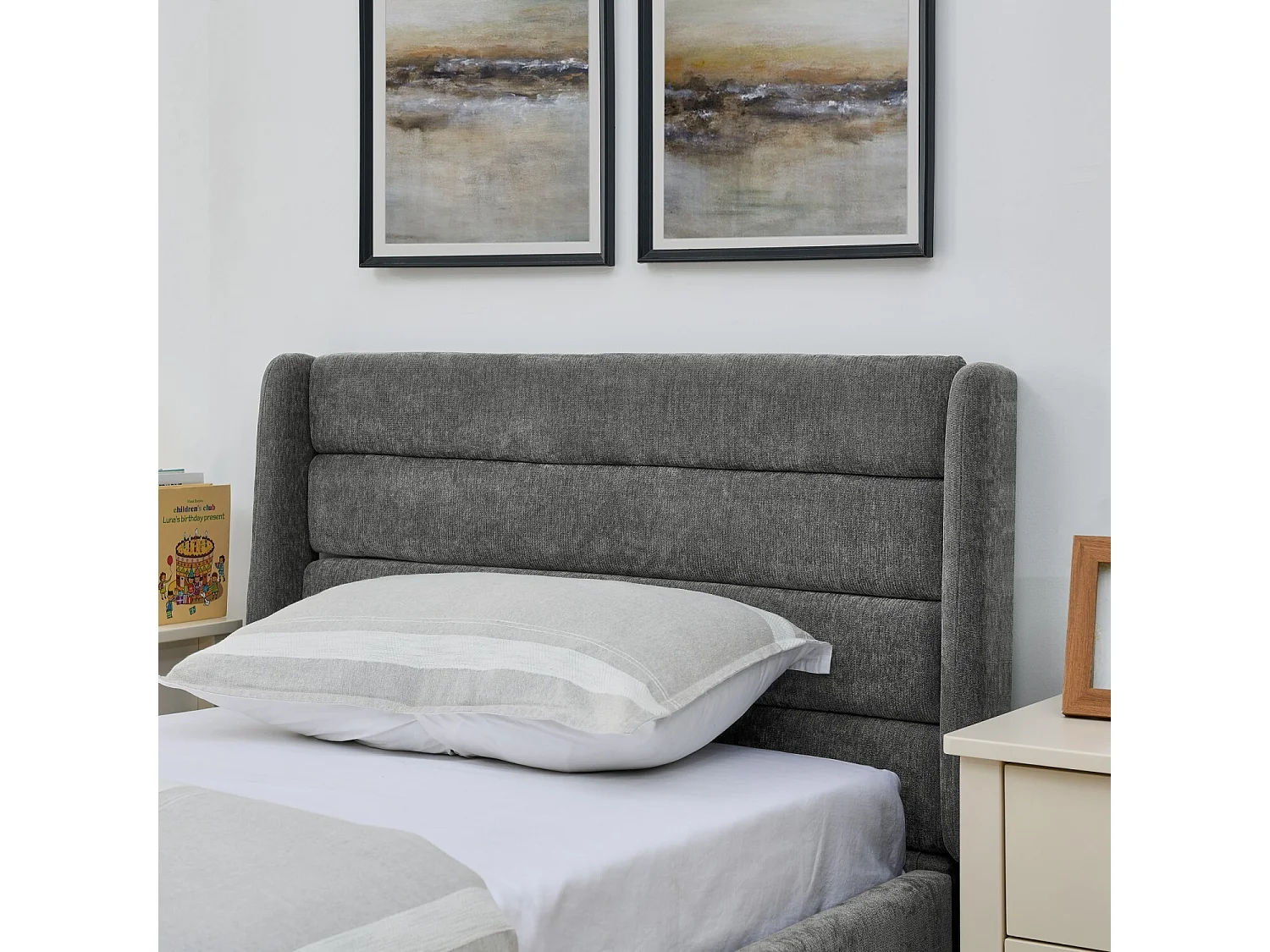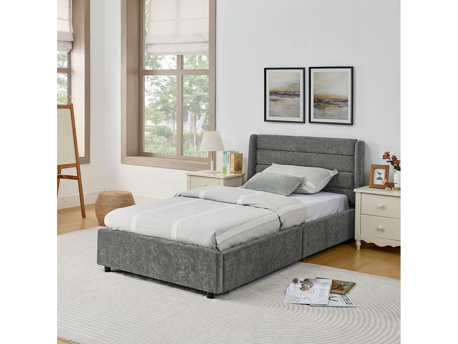 Łóżko dziecięce 90x200 cm, łóżko pojedyncze z zagłówkiem i stelażem z listew, 1 szuflada - szary szenil (bez materaca)