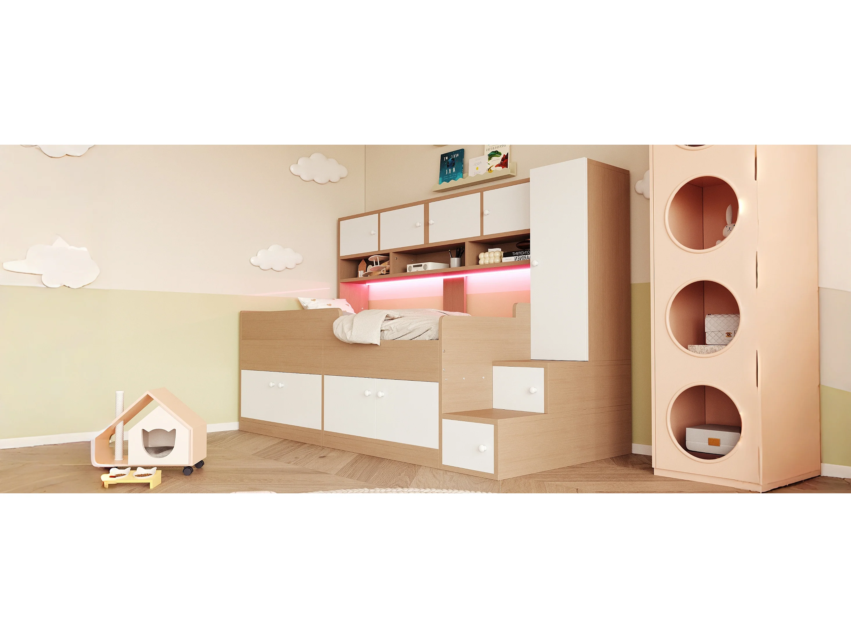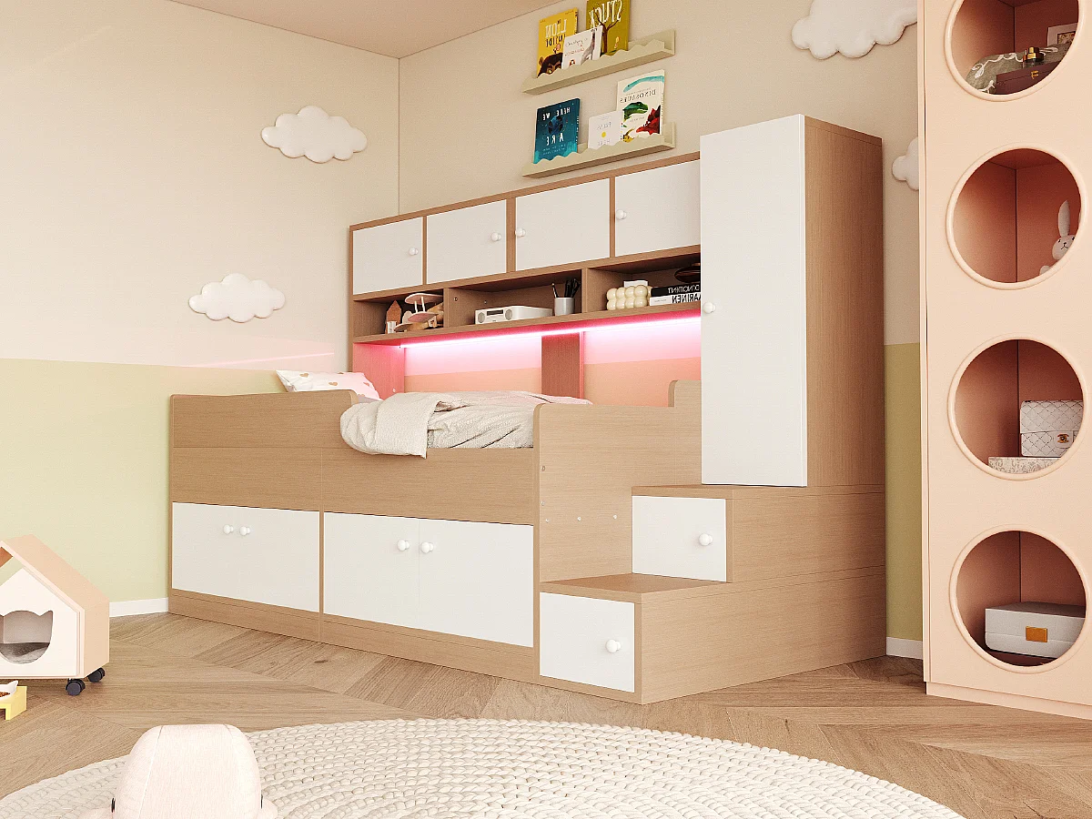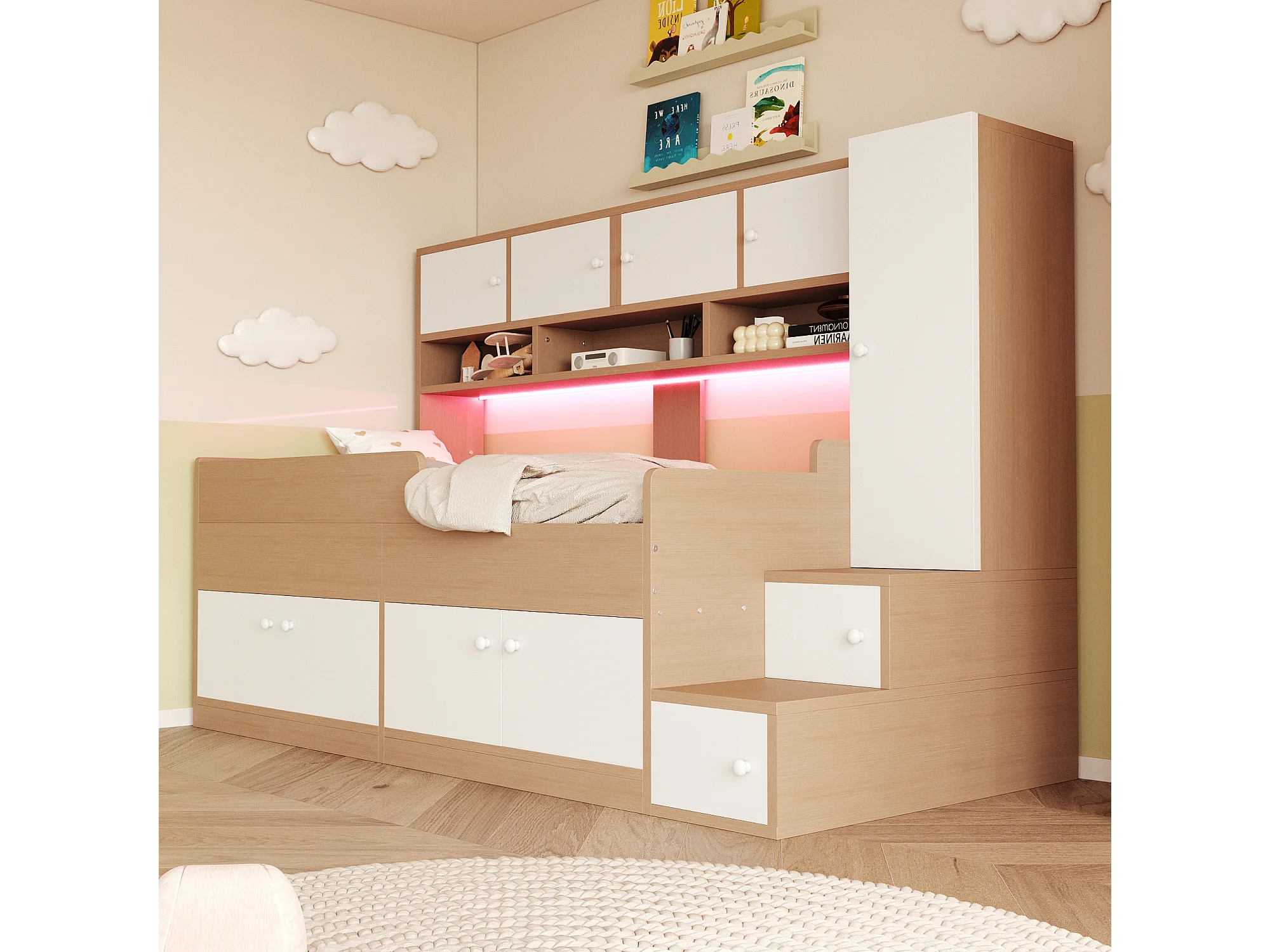 Łóżko dziecięce drewniane - 90 x 200 cm - z pojemnikiem + półki + szafa + oświetlenie LED + barierka ochronna - naturalne