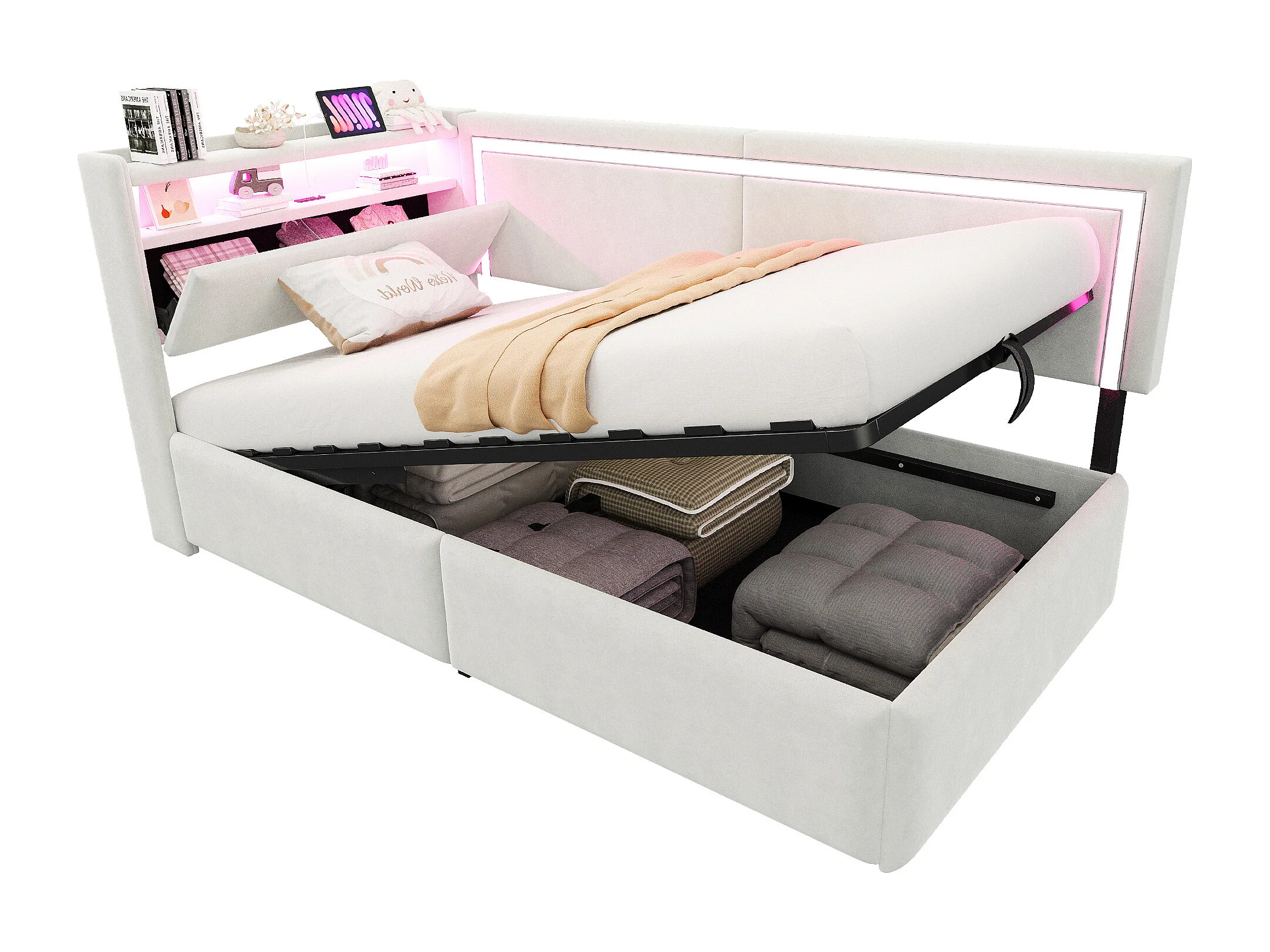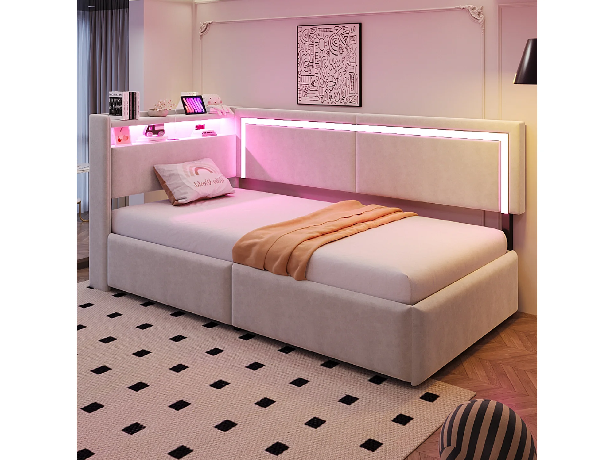 Łóżko dziecięce z pojemnikiem - 90 x 200 cm - z diodami LED + USB + otwierany zagłówek + hydrauliczny schowek - welur - beż