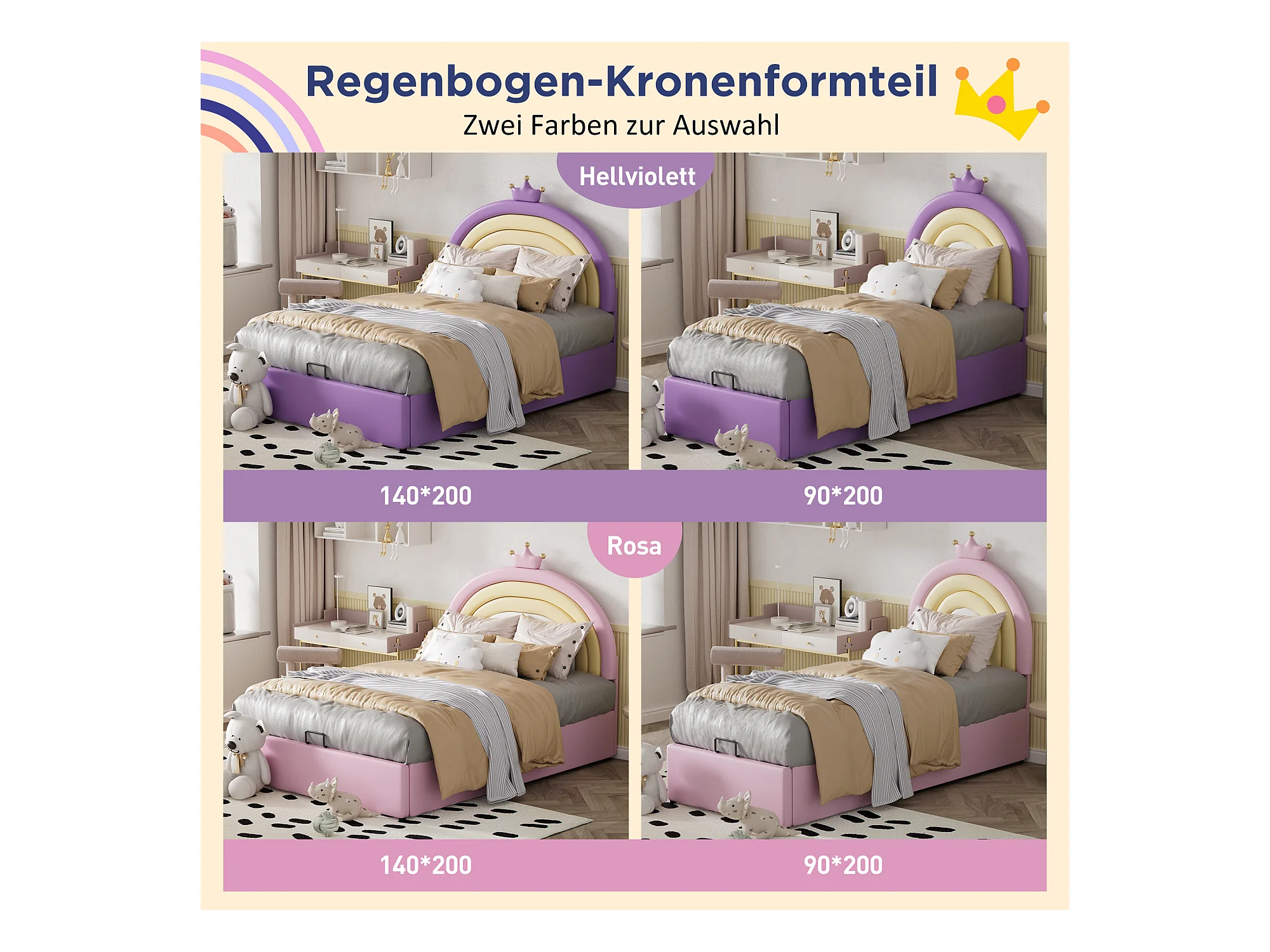 Łóżko dziecięce tapicerowane 90×200 cm - łóżko ze schowkiem - z taśmą LED - regulowane zagłówek - różowe (materac nie jest zawarty)
