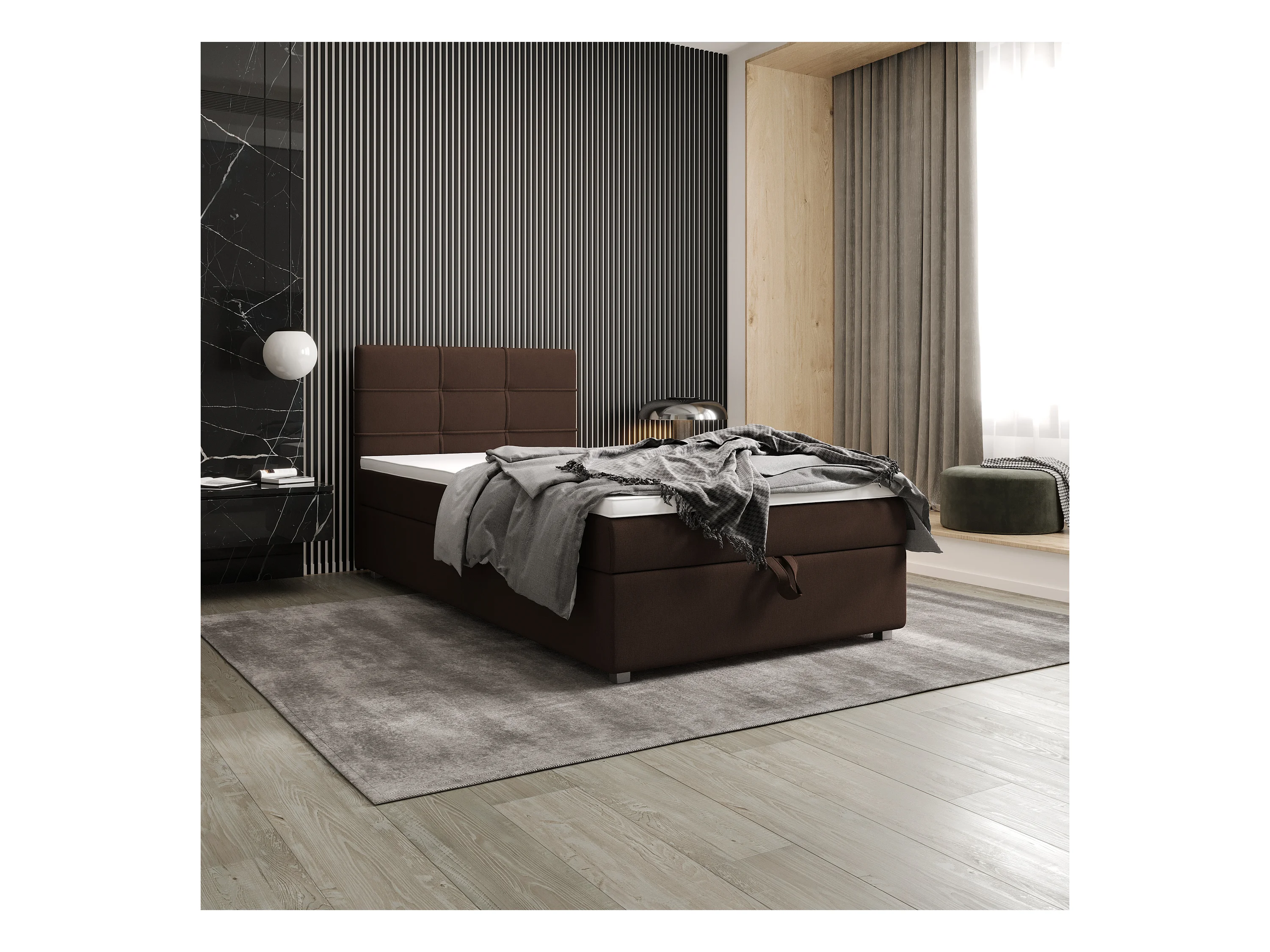 BEDANTE łóżko kontynentalne CHESTER PLUS 100x200 brązowy z materacem H3 i topperem łóżko z pojemnikiem, pojedyncze, hotelowe, do sypialni, ze schowkiem