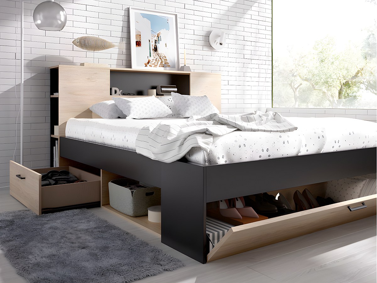 Łóżko LEANDRE z zagłówkiem, skrzyniami i szufladami - 160x200 cm - Kolor: Dąb i antracyt