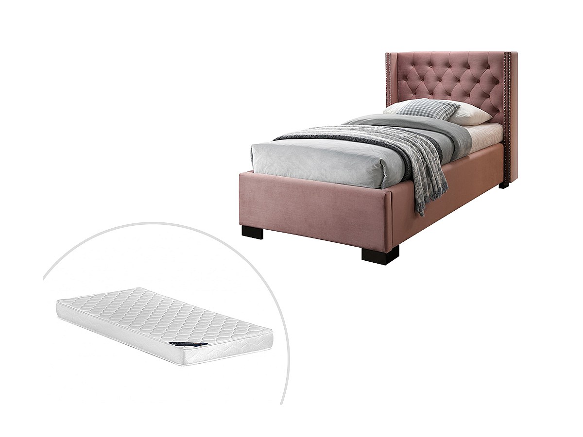 Łóżko MASSIMO z pikowanym zagłówkiem – 90 × 200 cm – welur w kolorze różowym, materac w zestawie