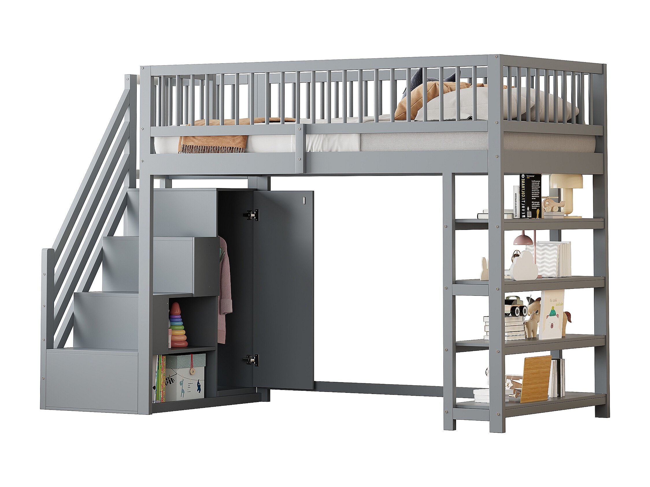Łóżko dziecięce 90x200 cm - z szafą + półkami - z drabiną - szare (bez materaca)