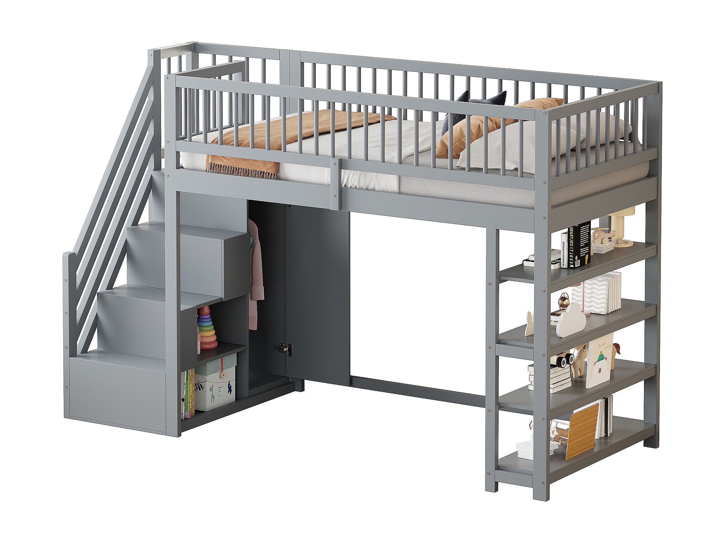 Łóżko typu mezzanine 90x200cm - ze schodami do przechowywania - z komorami do przechowywania - szare (materac nie wliczony)