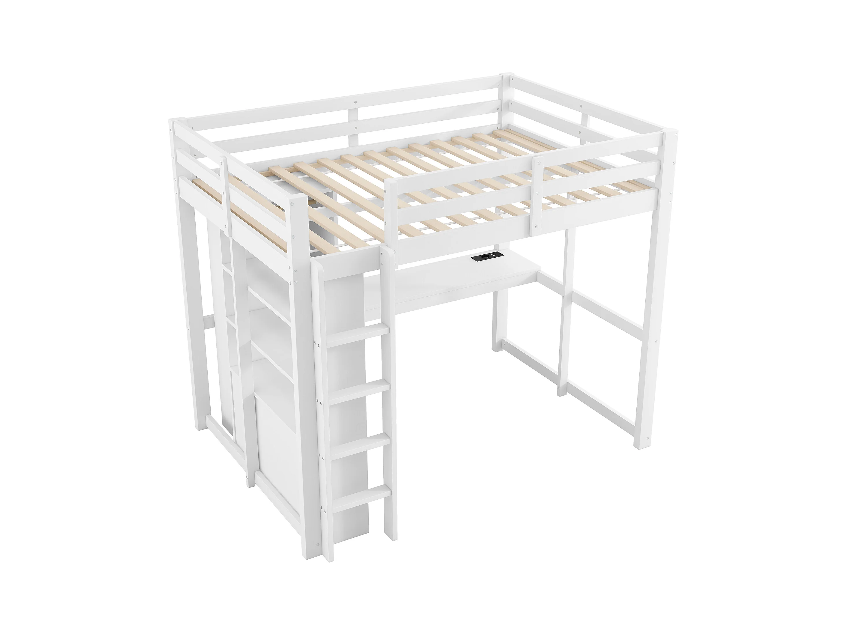 Łóżko mezzanine 140x200 cm - z barierkami - z drabiną - z USB i gniazdkami - z oświetleniem LED - z biurkiem + półkami wielopoziomowymi - białe (bez materaca)