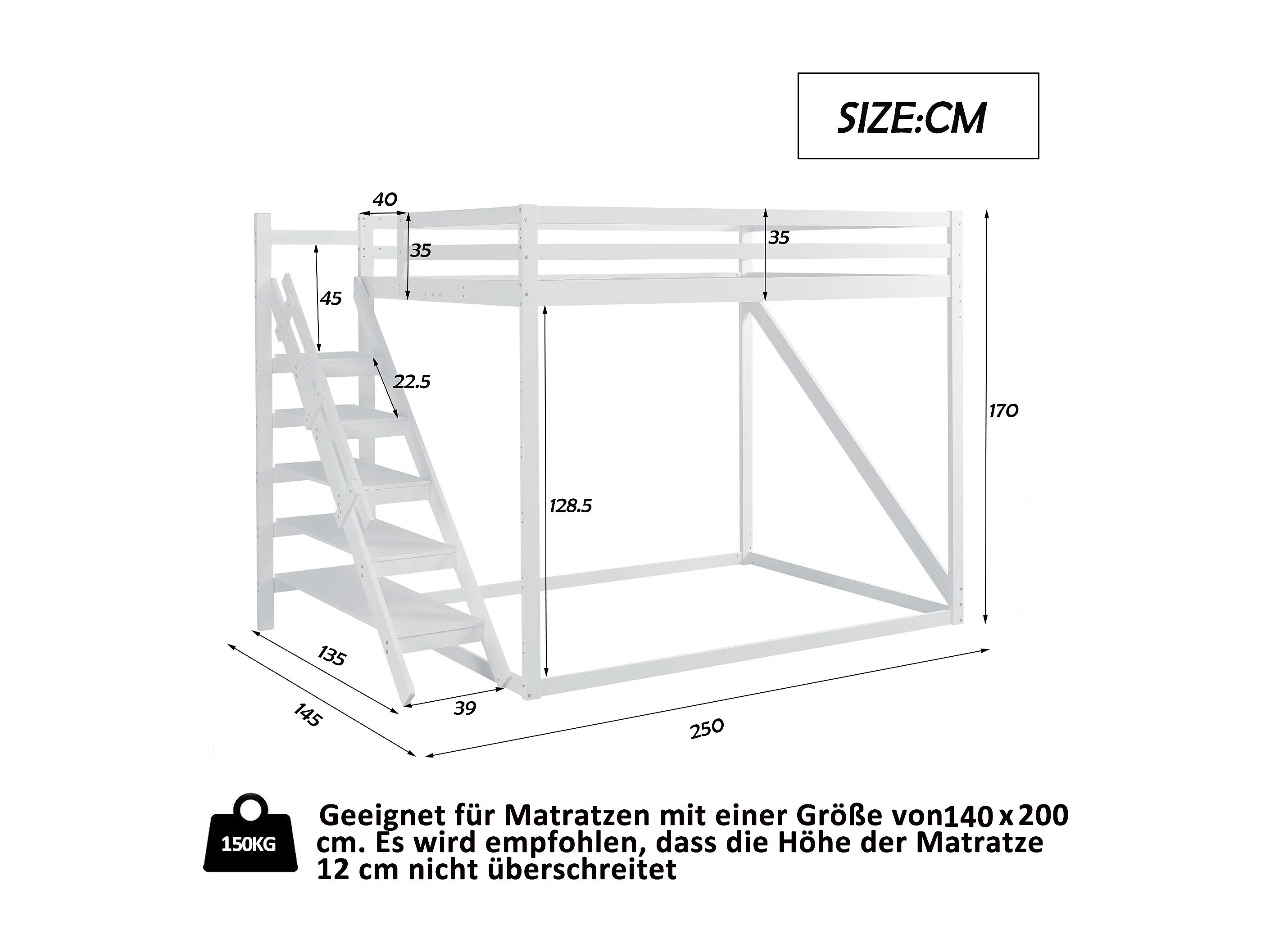 Łóżko piętrowe - 2 x 140 x 200 cm - stopnie i stelaż - drewno lite + płyta MDF - kolor biały