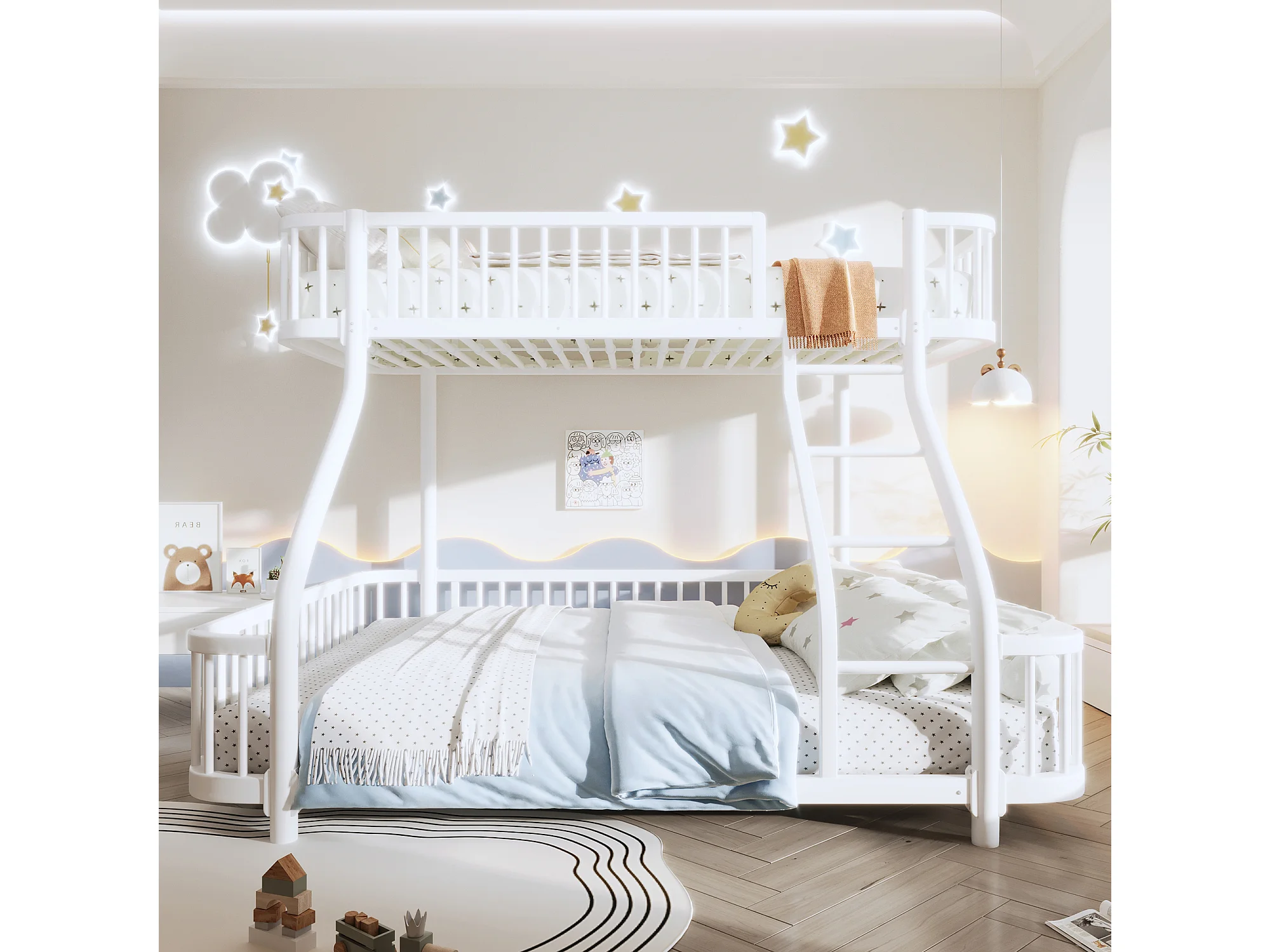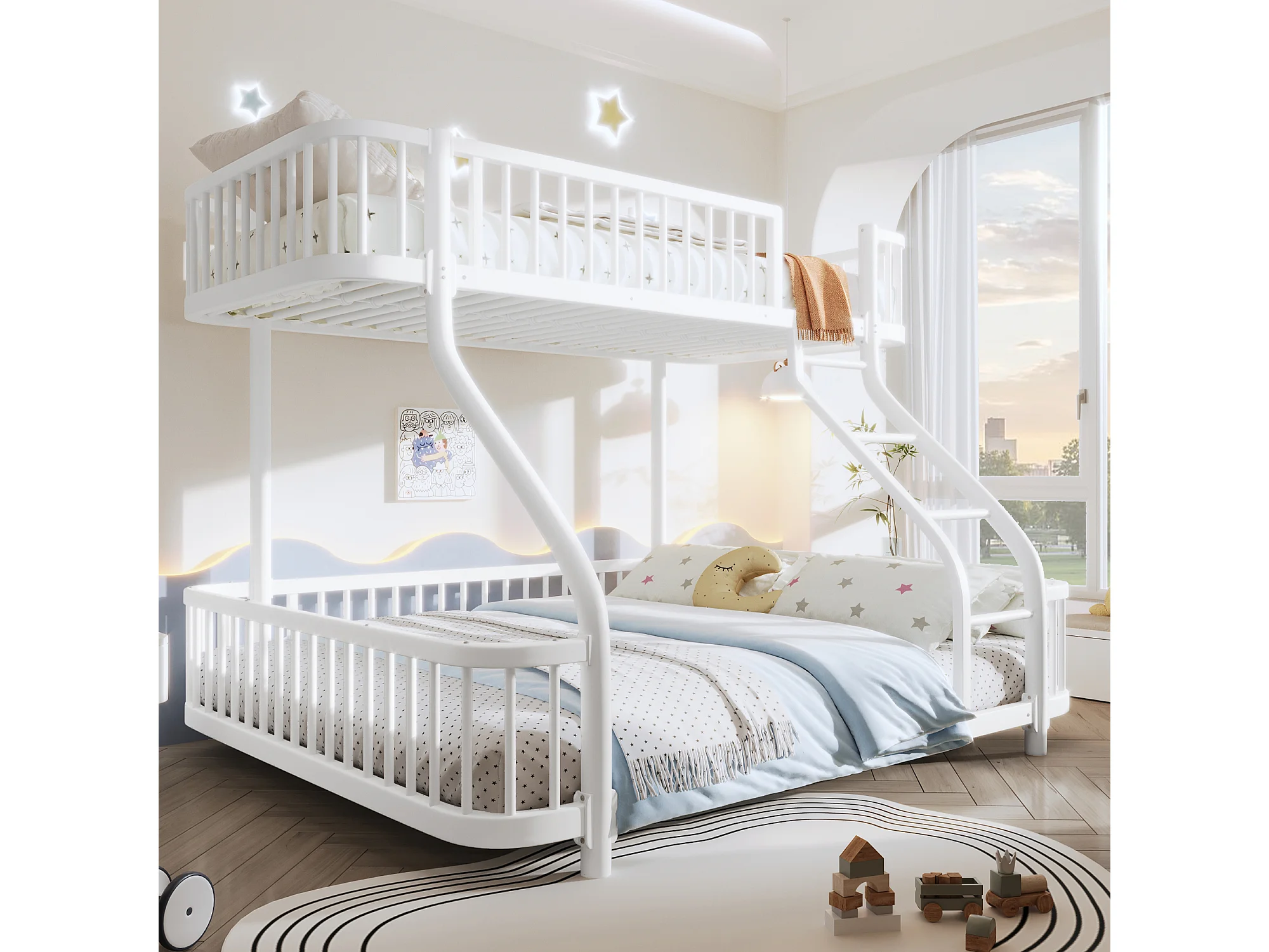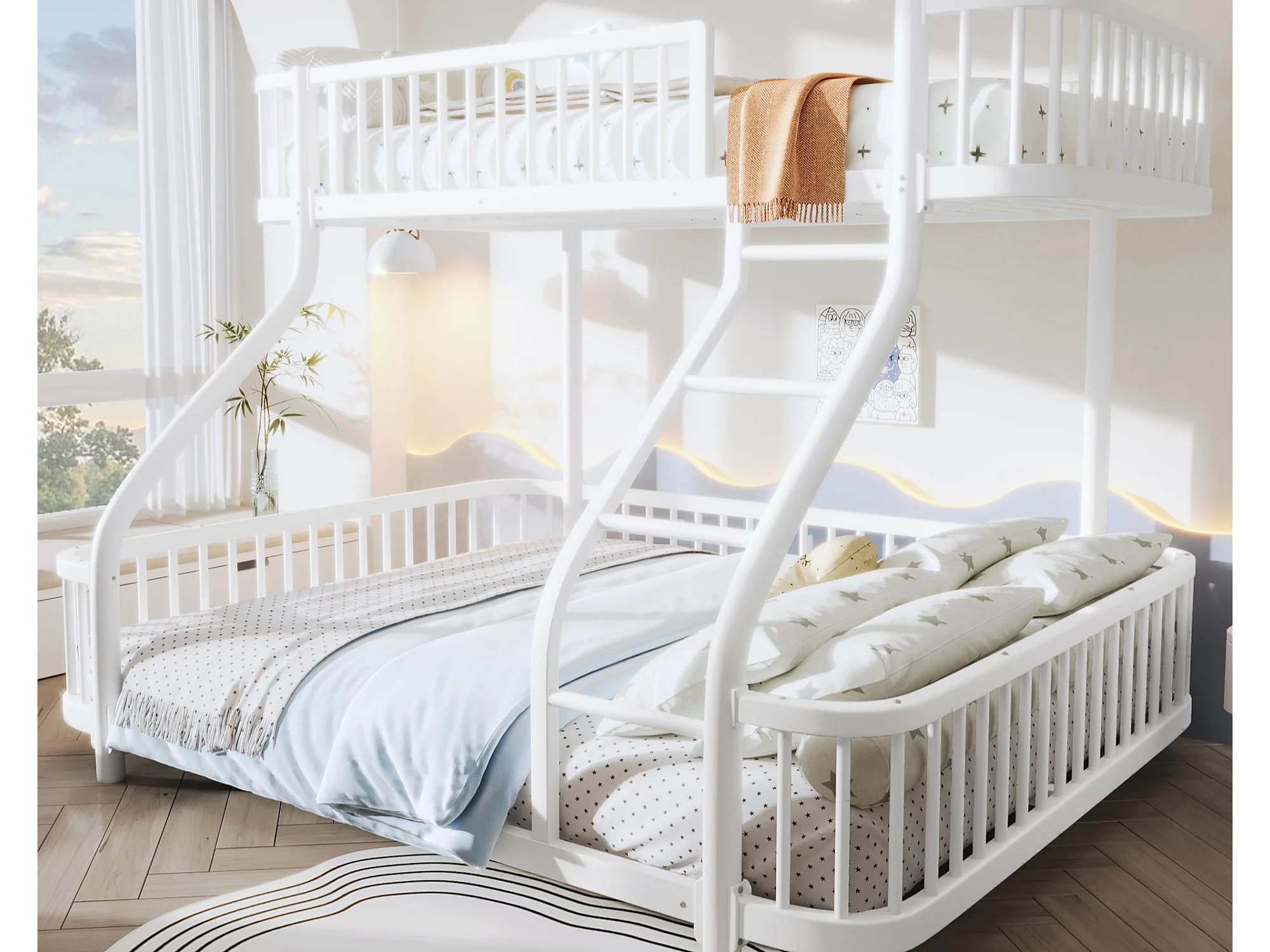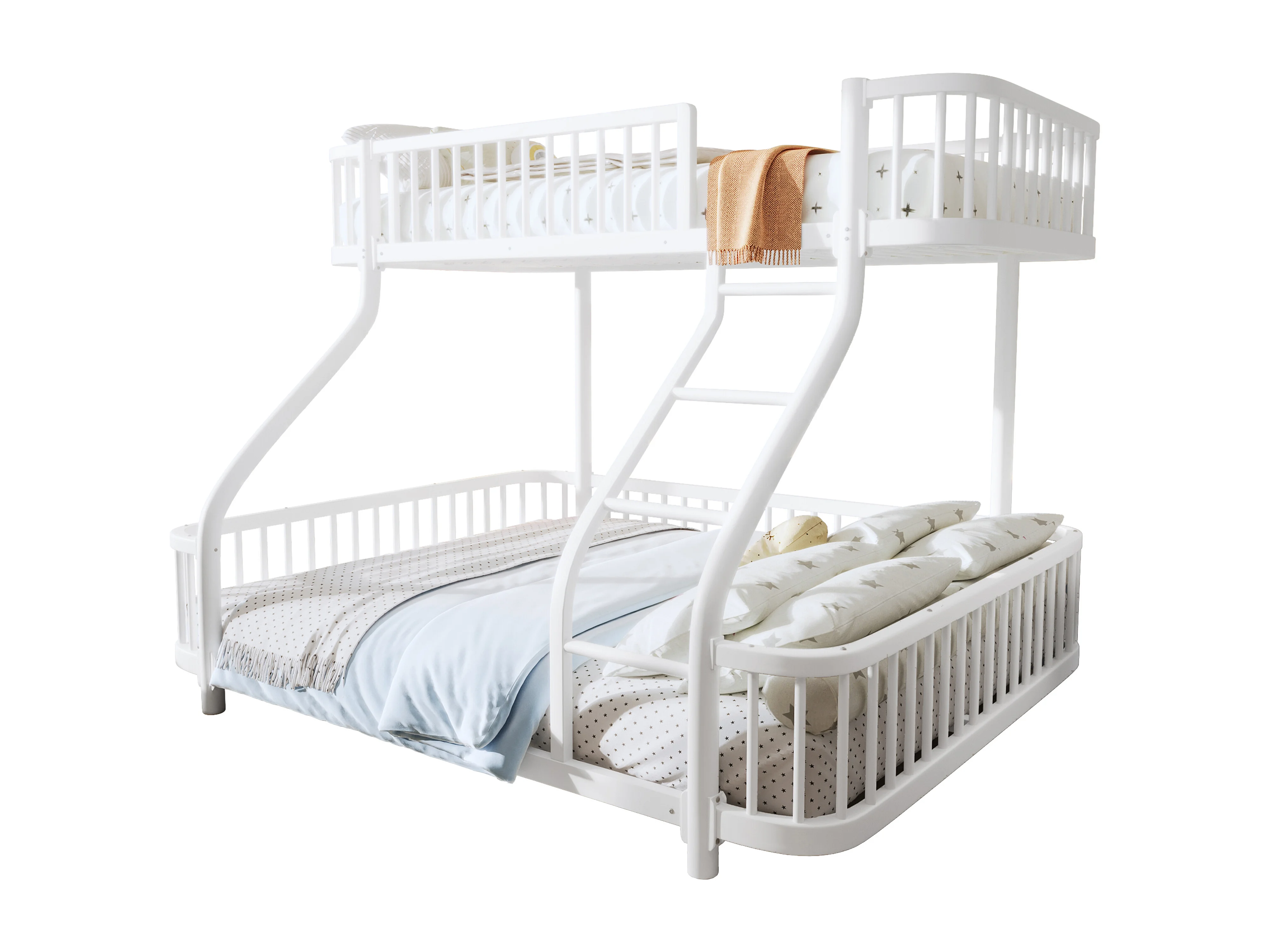 Łóżko piętrowe 90x200 cm + 140x200 cm - konstrukcja żelazna - z barierkami bezpieczeństwa - z drabiną - biały (materac nie jest wliczony w cenę)