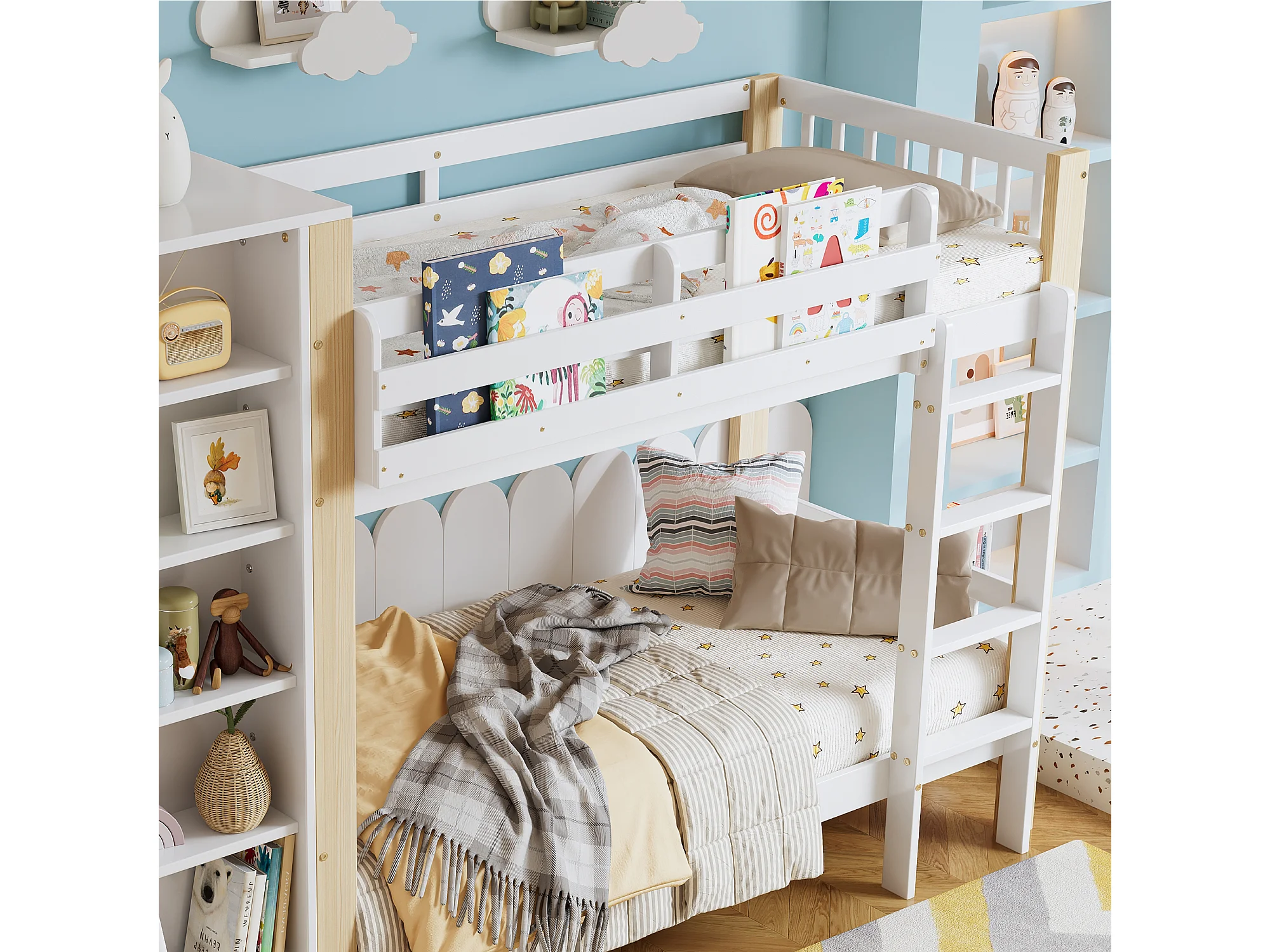 Łóżko piętrowe 90x200 cm - z szafą i 6 otwartymi półkami - Drewno lite + MDF - Białe+Naturalny (bez materaca)