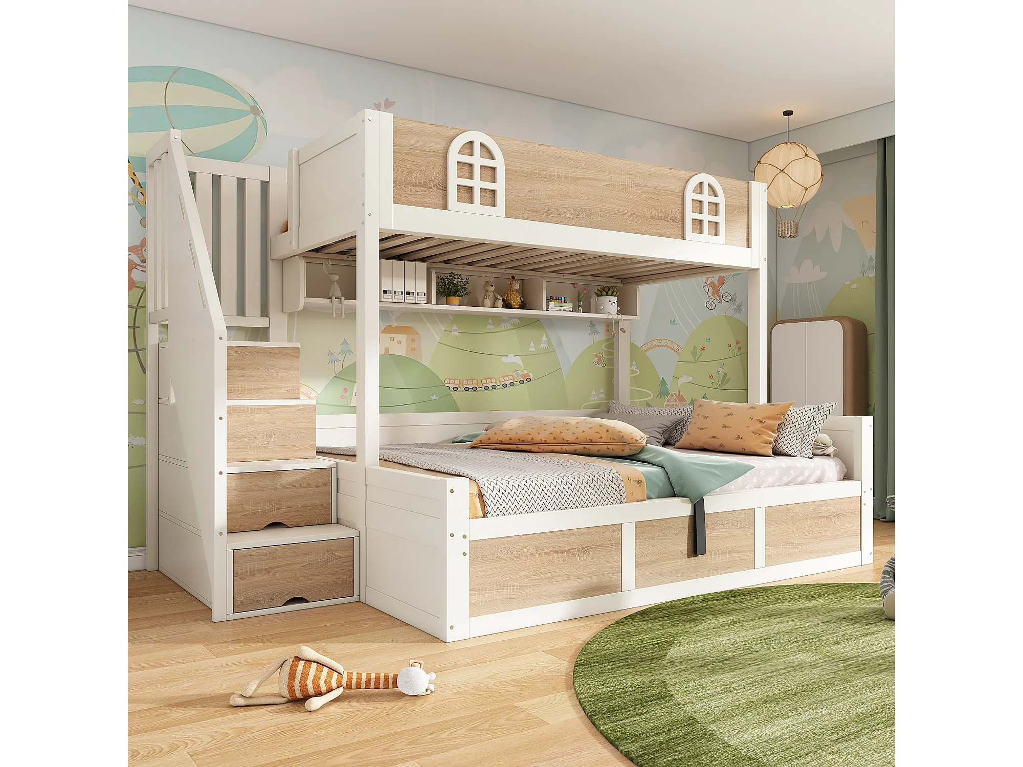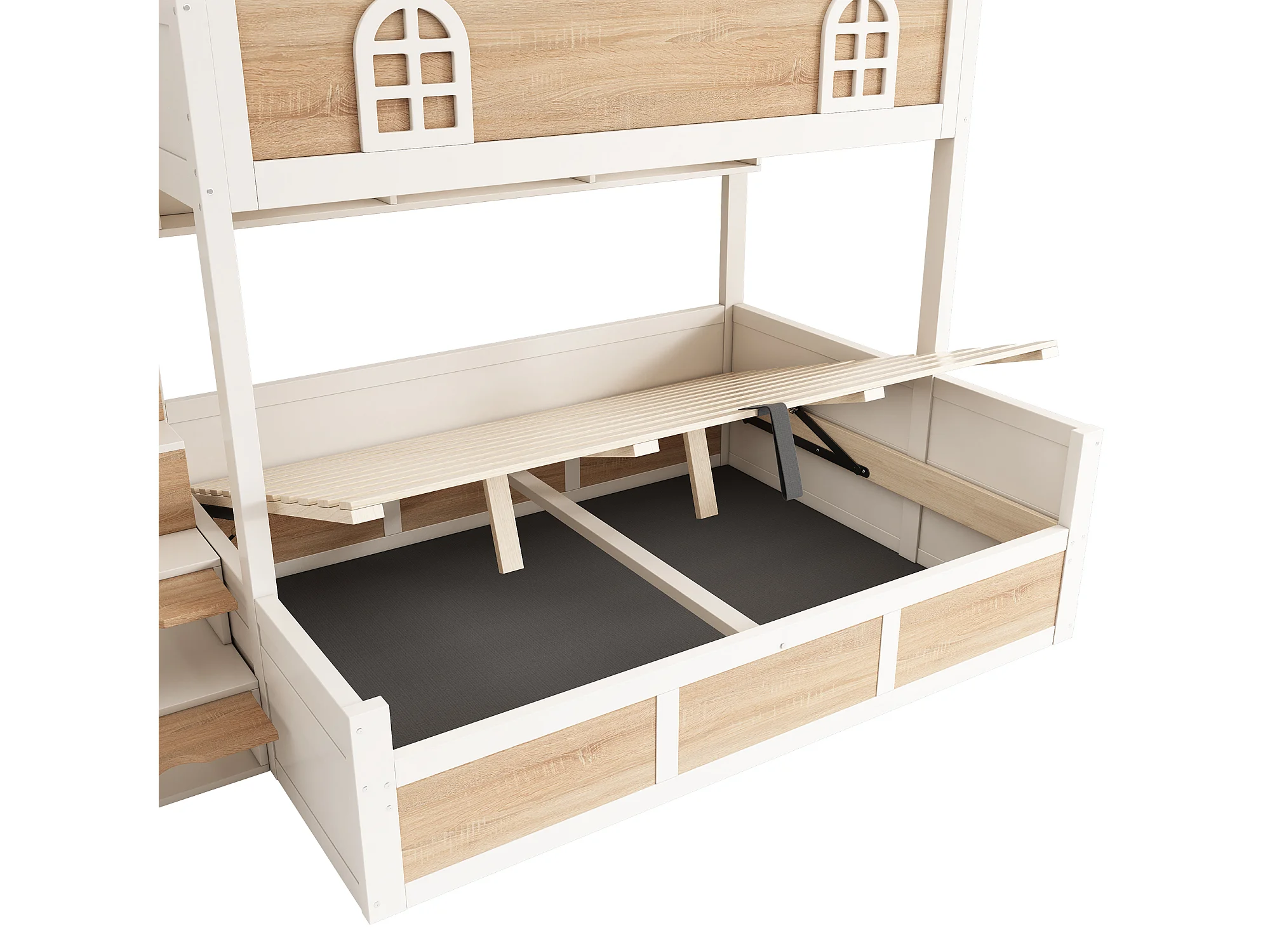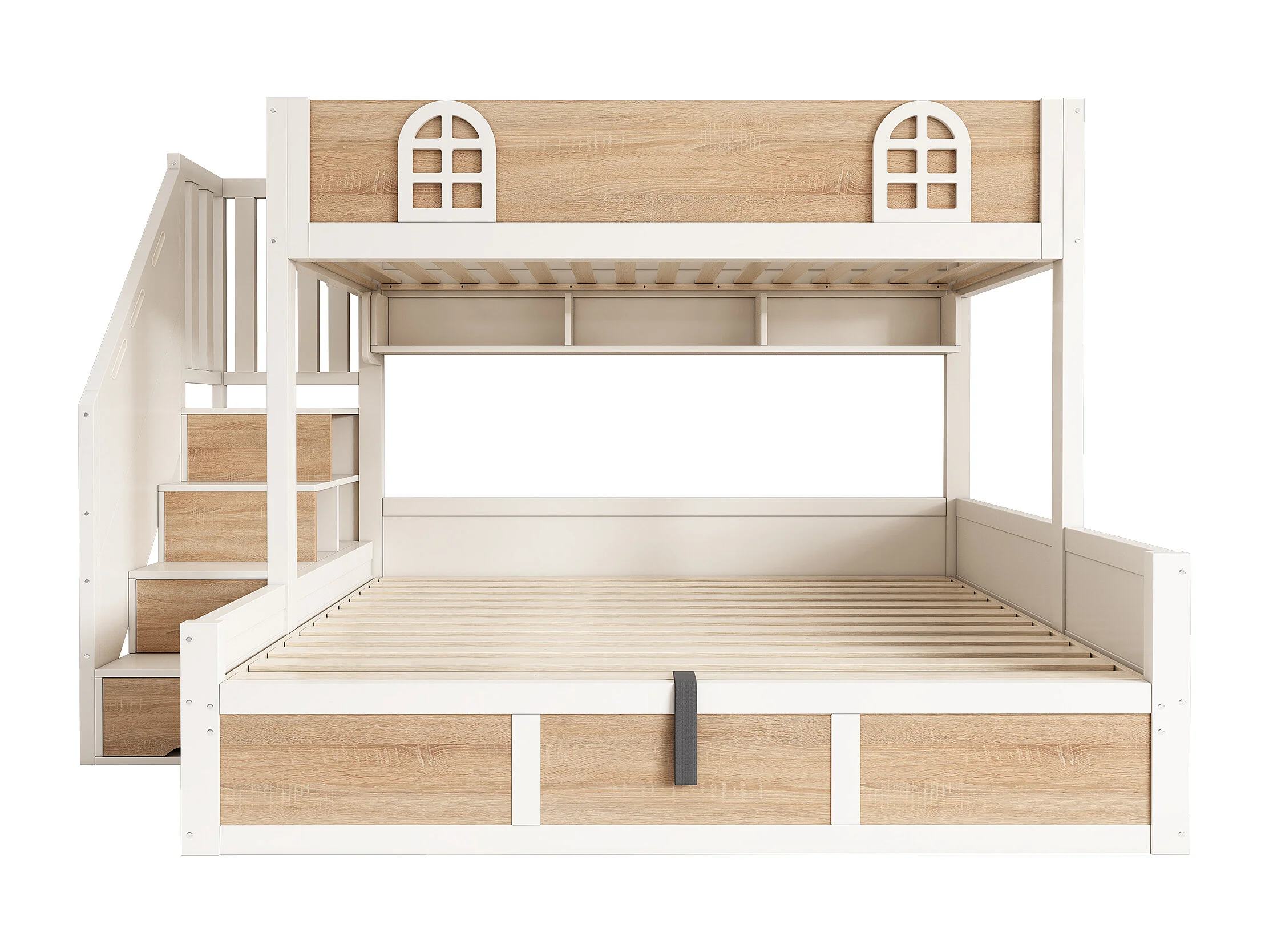 Łóżko piętrowe 90x200cm + 140x200cm - projekt domku - z drabiną z pojemnikami i półkami - Lite drewno + MDF - Naturalny (bez materaca)