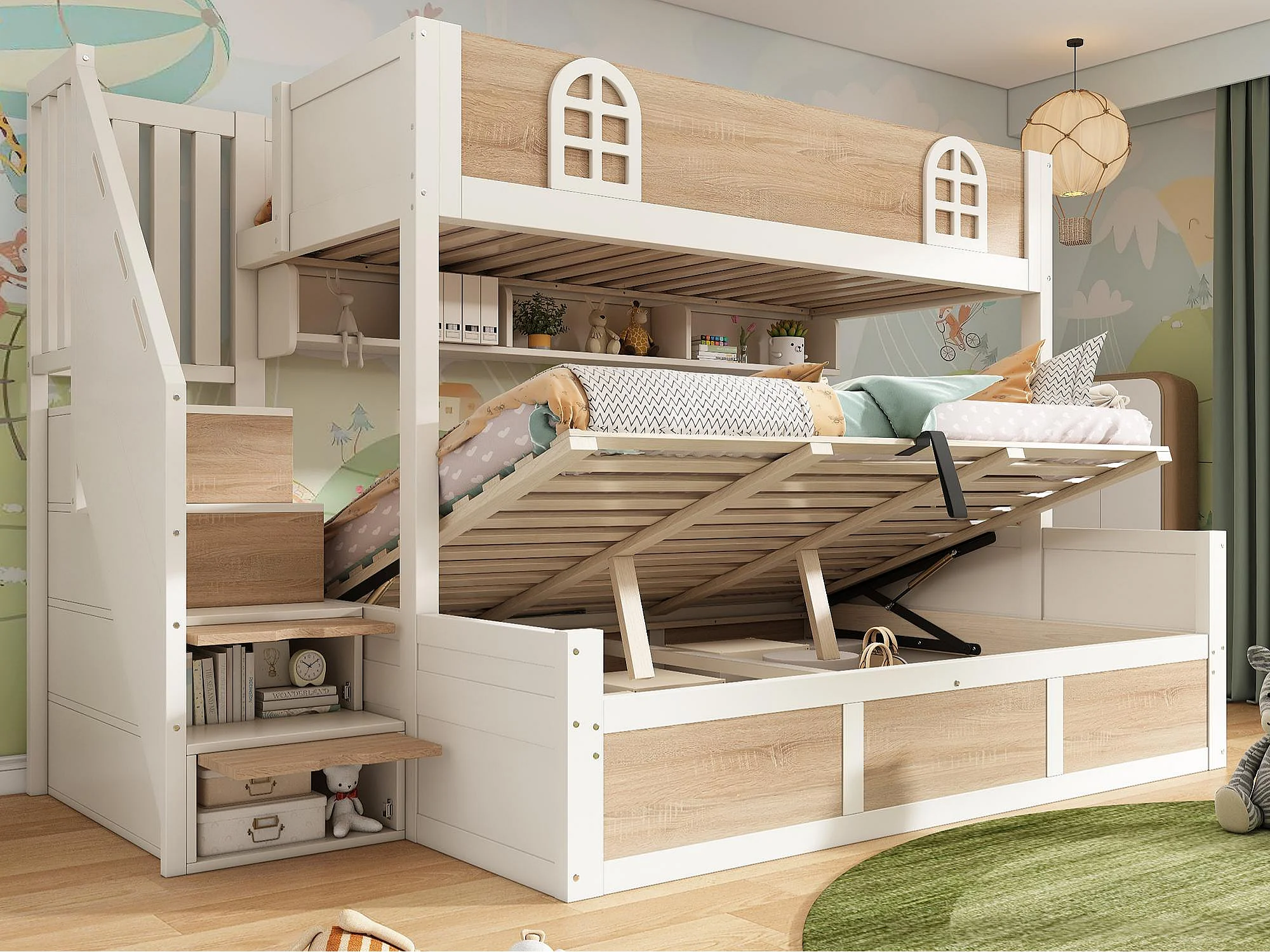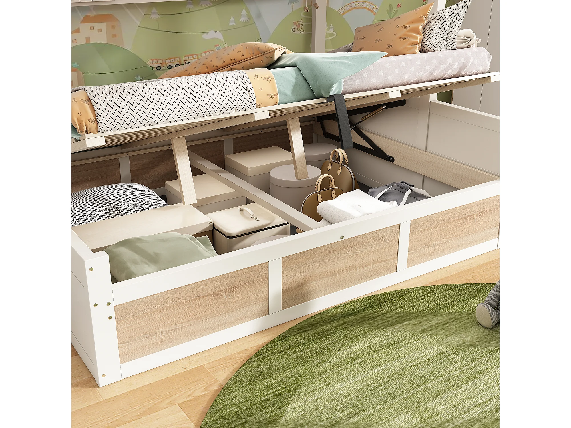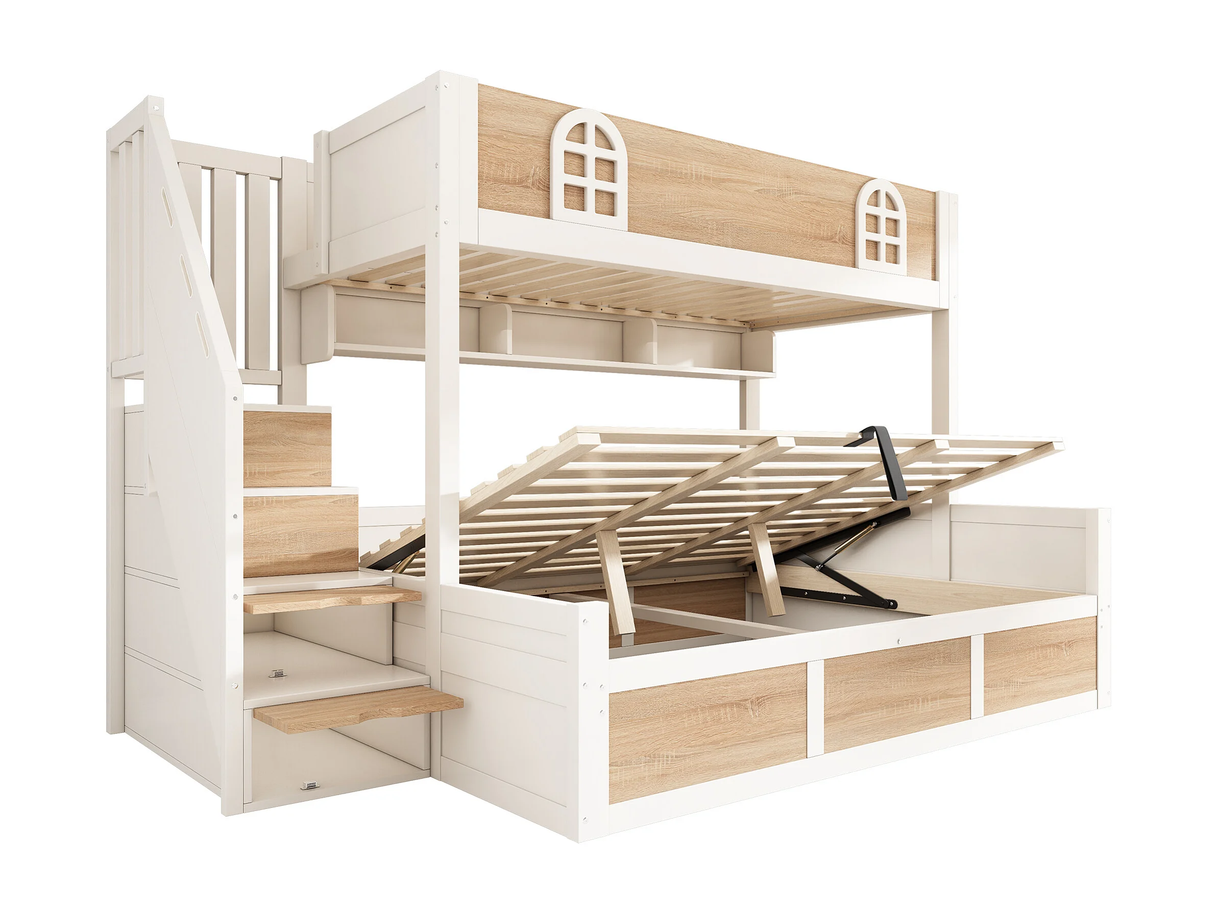 Łóżko piętrowe 90x200cm + 140x200cm - projekt domku - z drabiną z pojemnikami i półkami - Lite drewno + MDF - Naturalny (bez materaca)