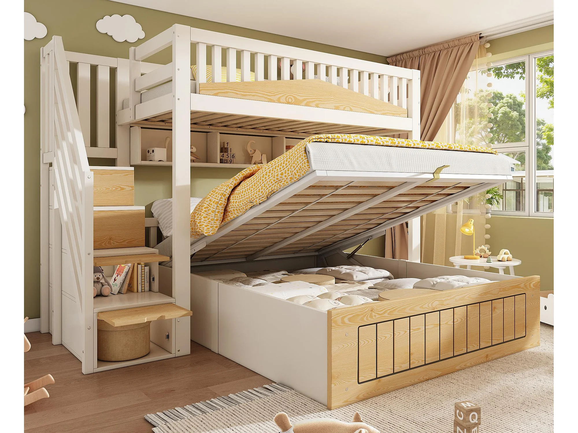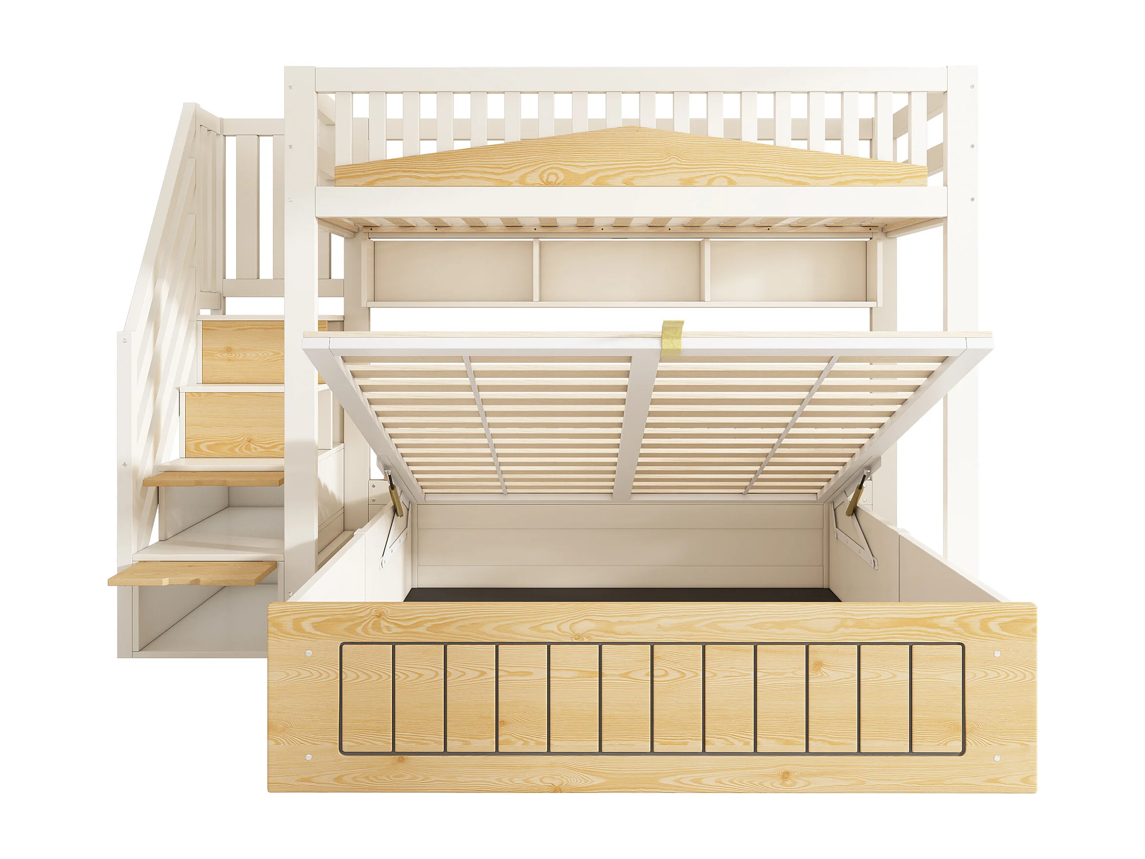 Łóżko piętrowe 90x200cm + 140x200cm z litego drewna - z barierkami i schodami do przechowywania - Białe i Naturalne