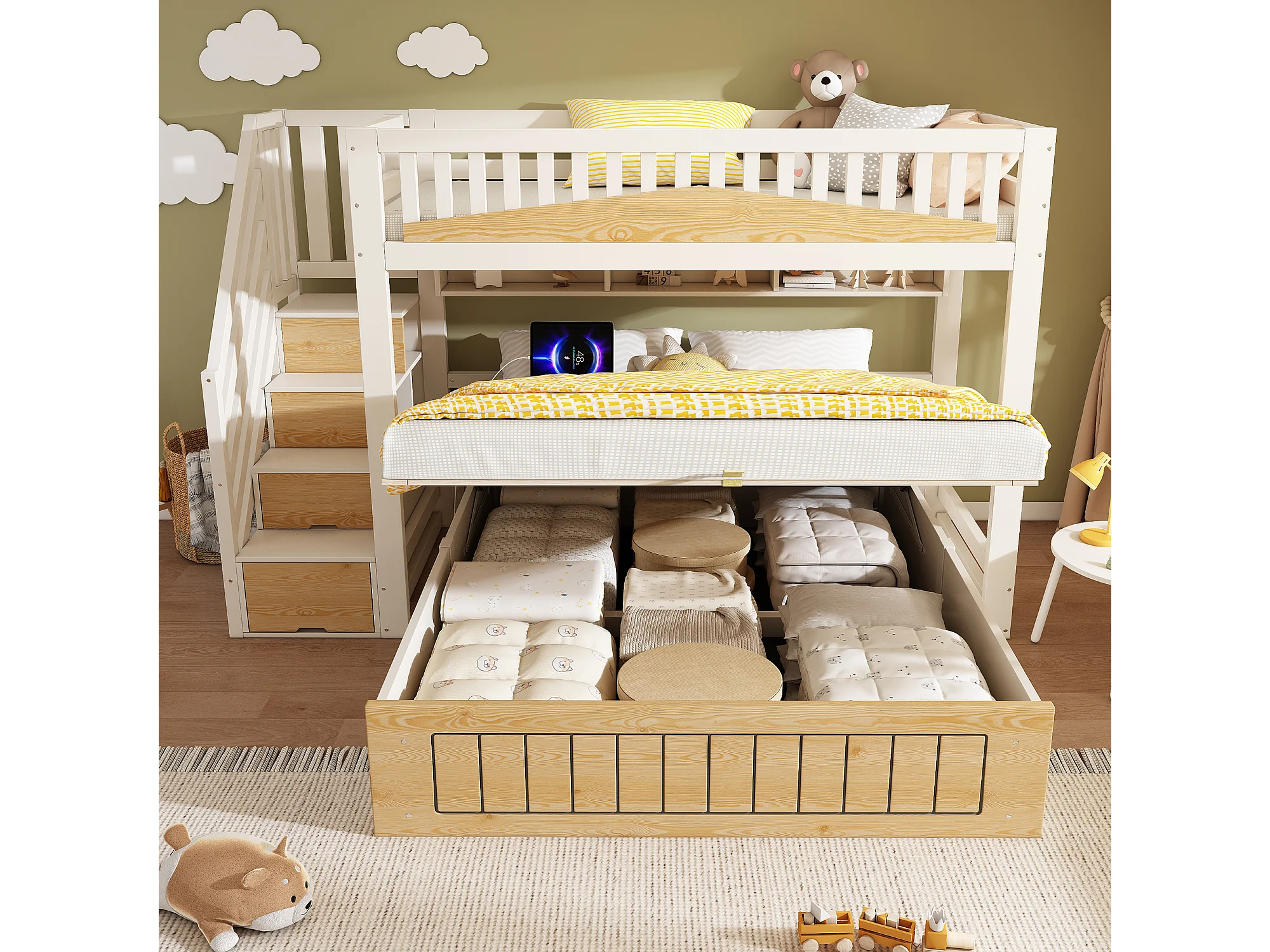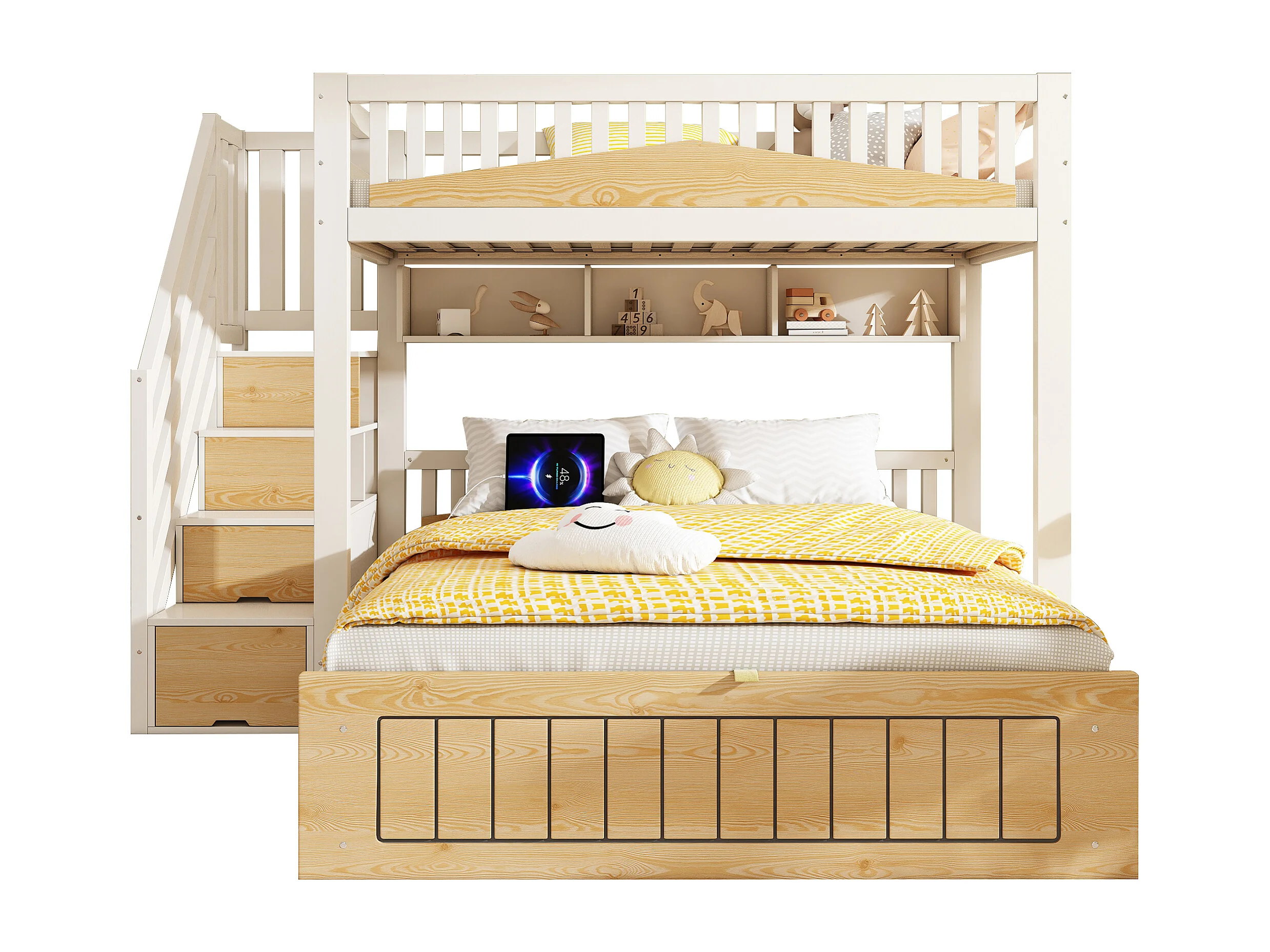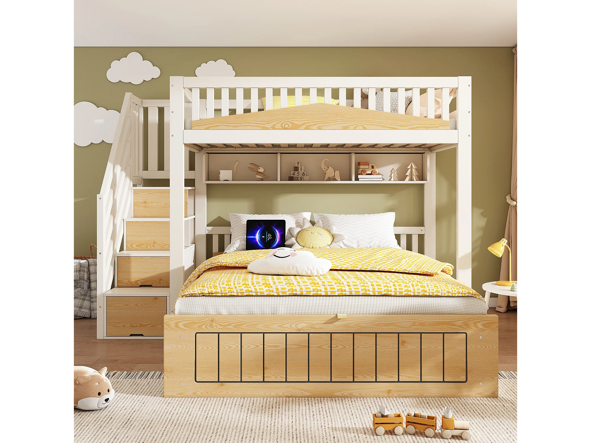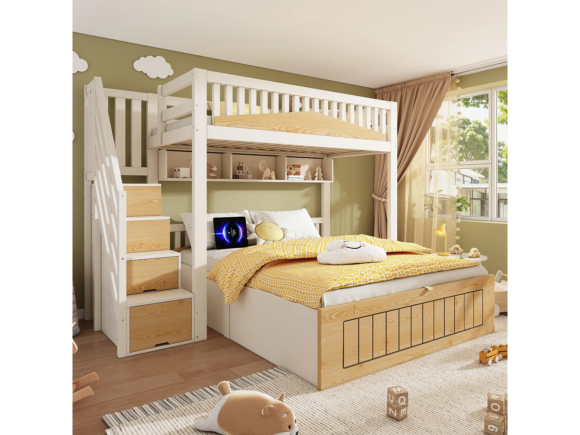 Łóżko piętrowe 90x200cm + 140x200cm - Dolne łóżko z miejscem do przechowywania - drabina z pojemnikami - z portem USB - Biały+Naturalny (bez materaca)