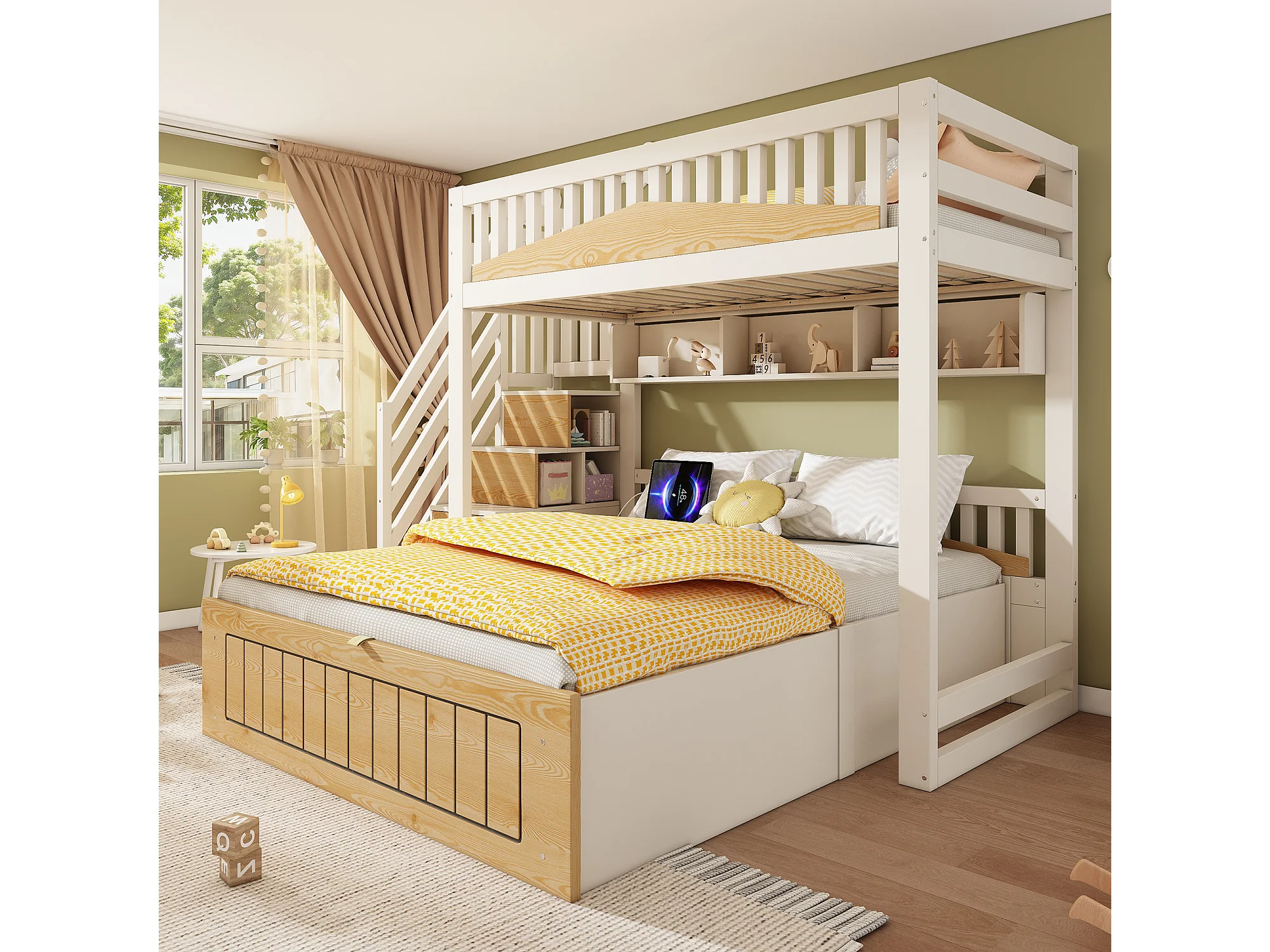 Łóżko piętrowe 90x200cm + 140x200cm - z drabiną - 2 szuflady - z półką - biały + naturalny (materac nie jest w zestawie)