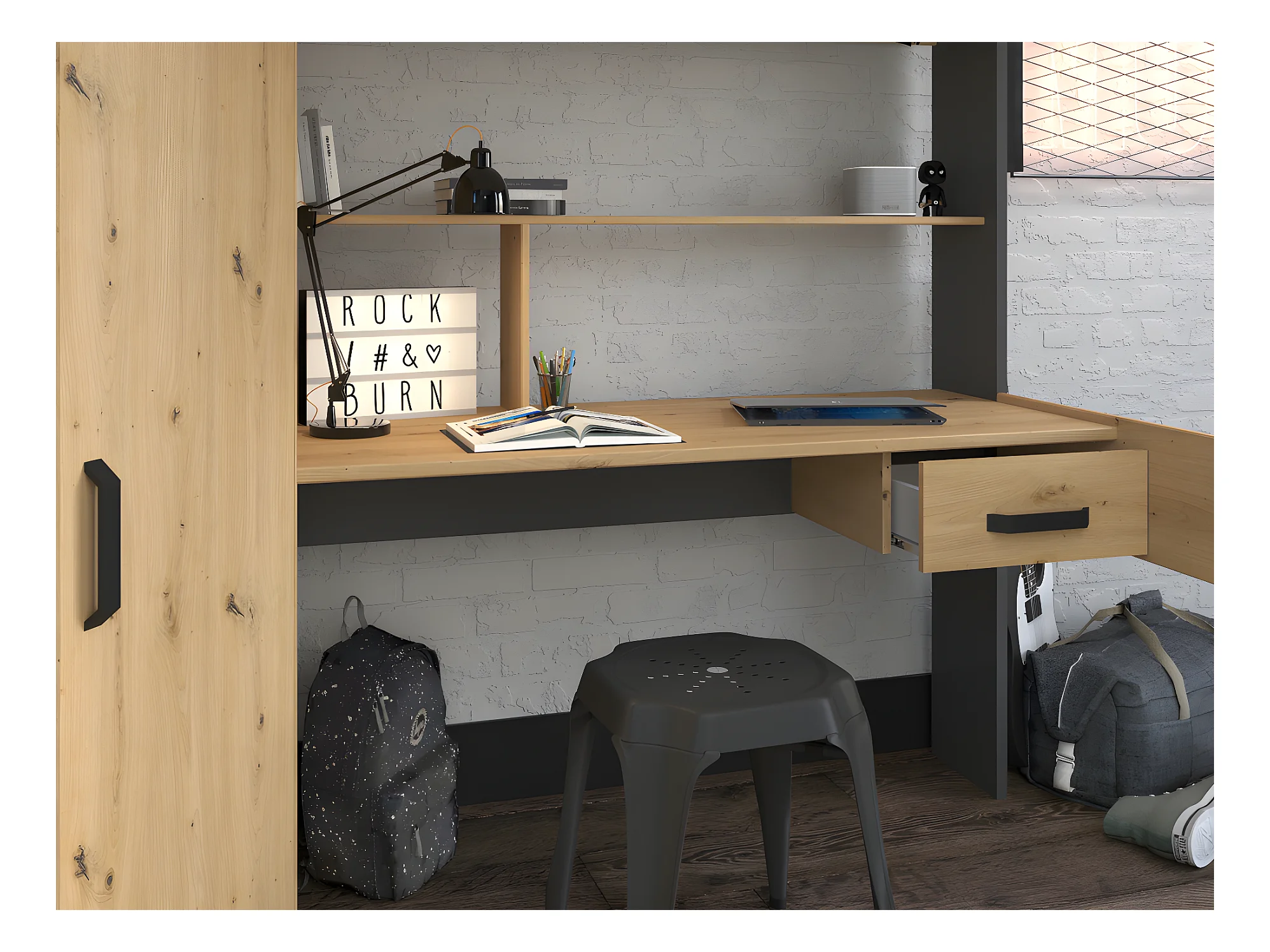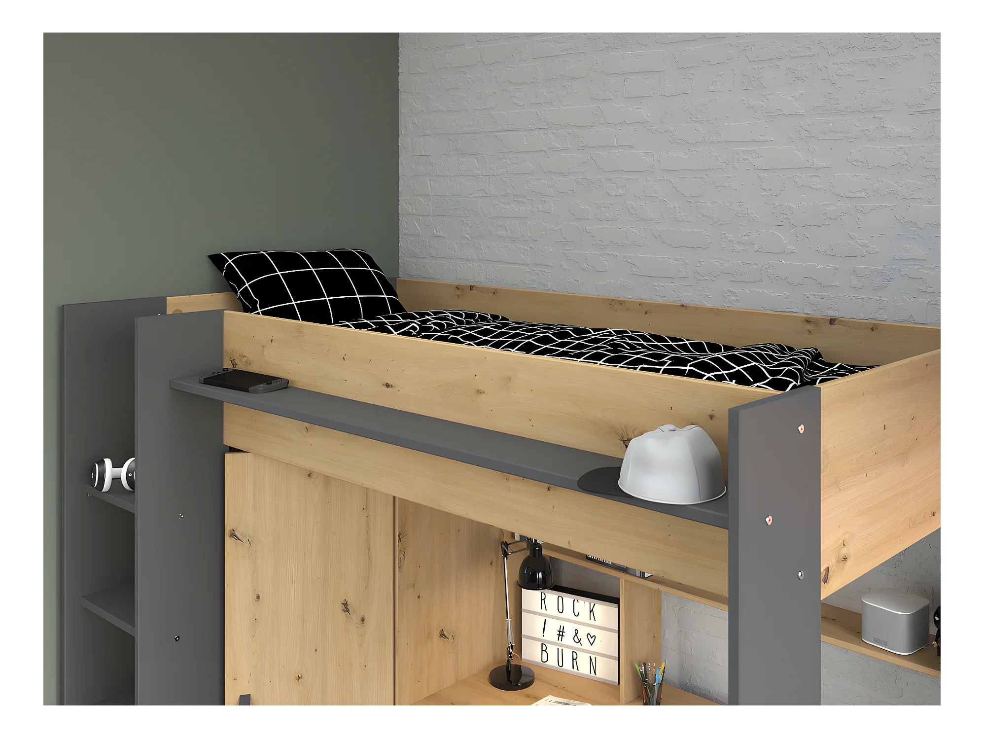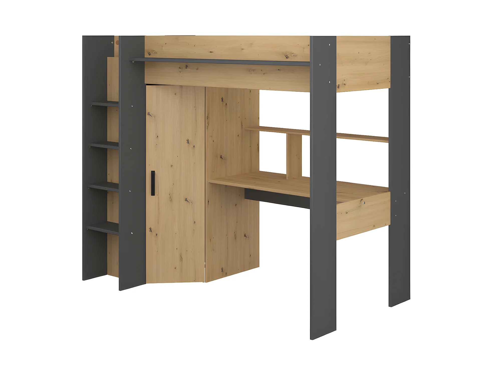 Łóżko z antresolą z biurkiem i szafą – 90 × 200 – kolor naturalny i antracytowy, materac w zestawie - AUCKLAND