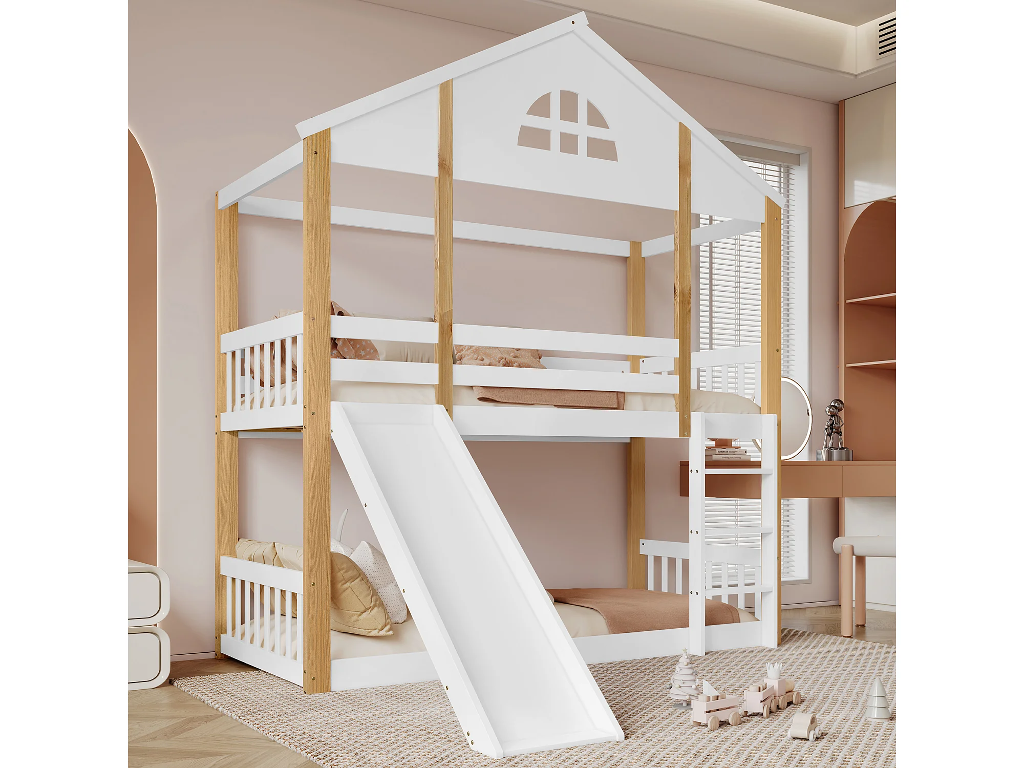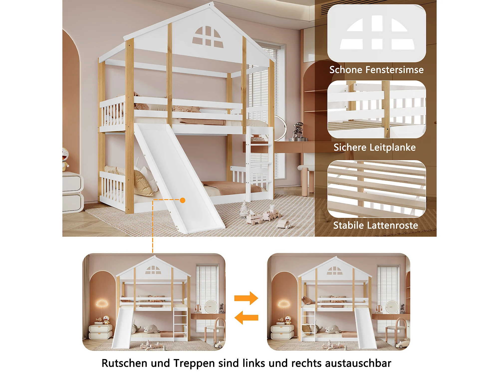 Łóżko piętrowe dla dzieci - 2 x 90 x 200 cm - z oknami + drabinka + zjeżdżalnia - drewno + MDF - białe i naturalne