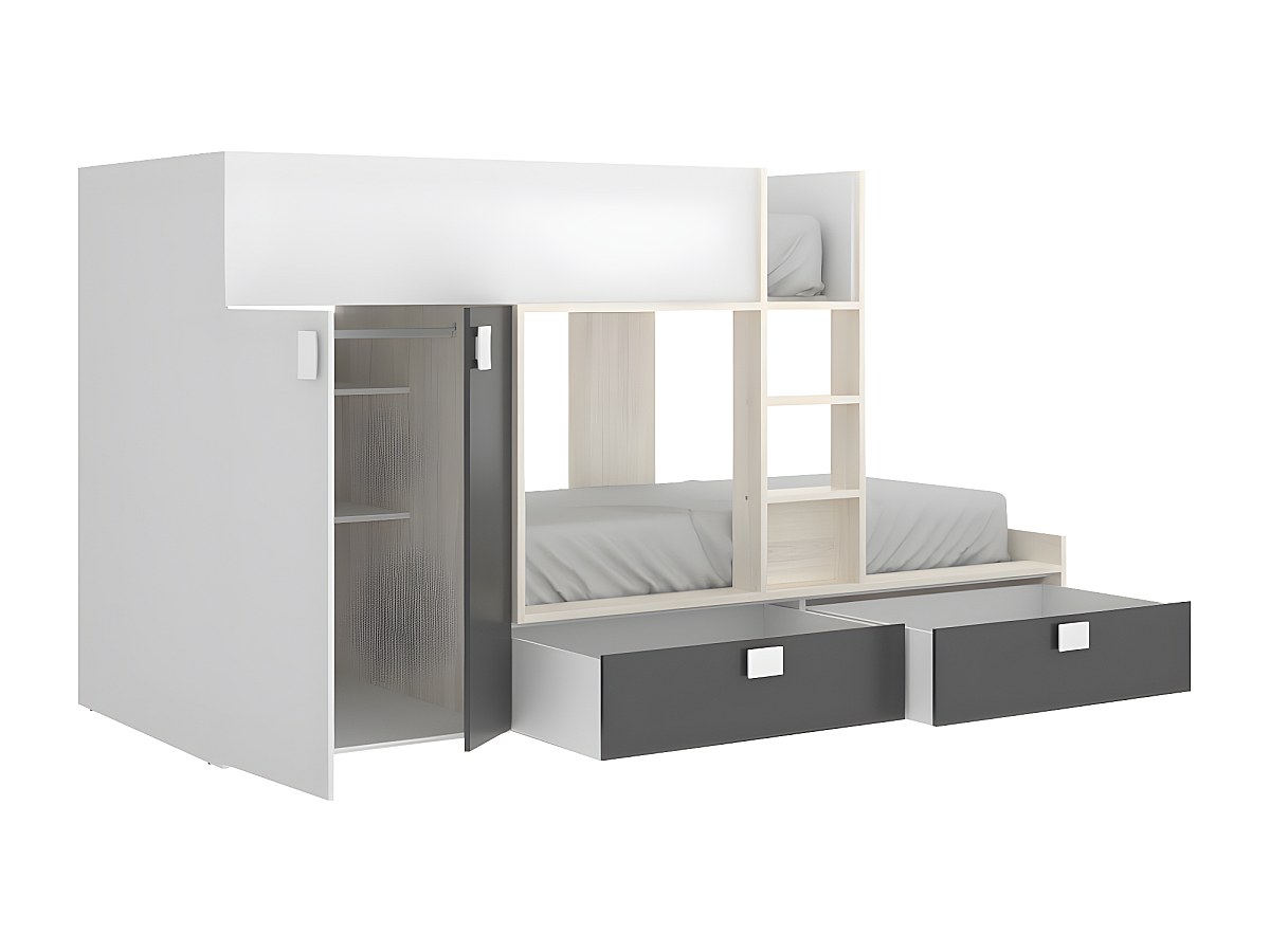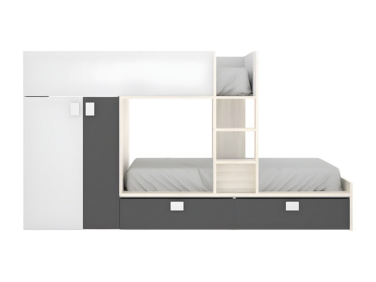 Łóżko piętrowe JUANITO - Wbudowana szafa - 2 x 90 x 190 cm - Kolor biały, dębowy i antracytowy