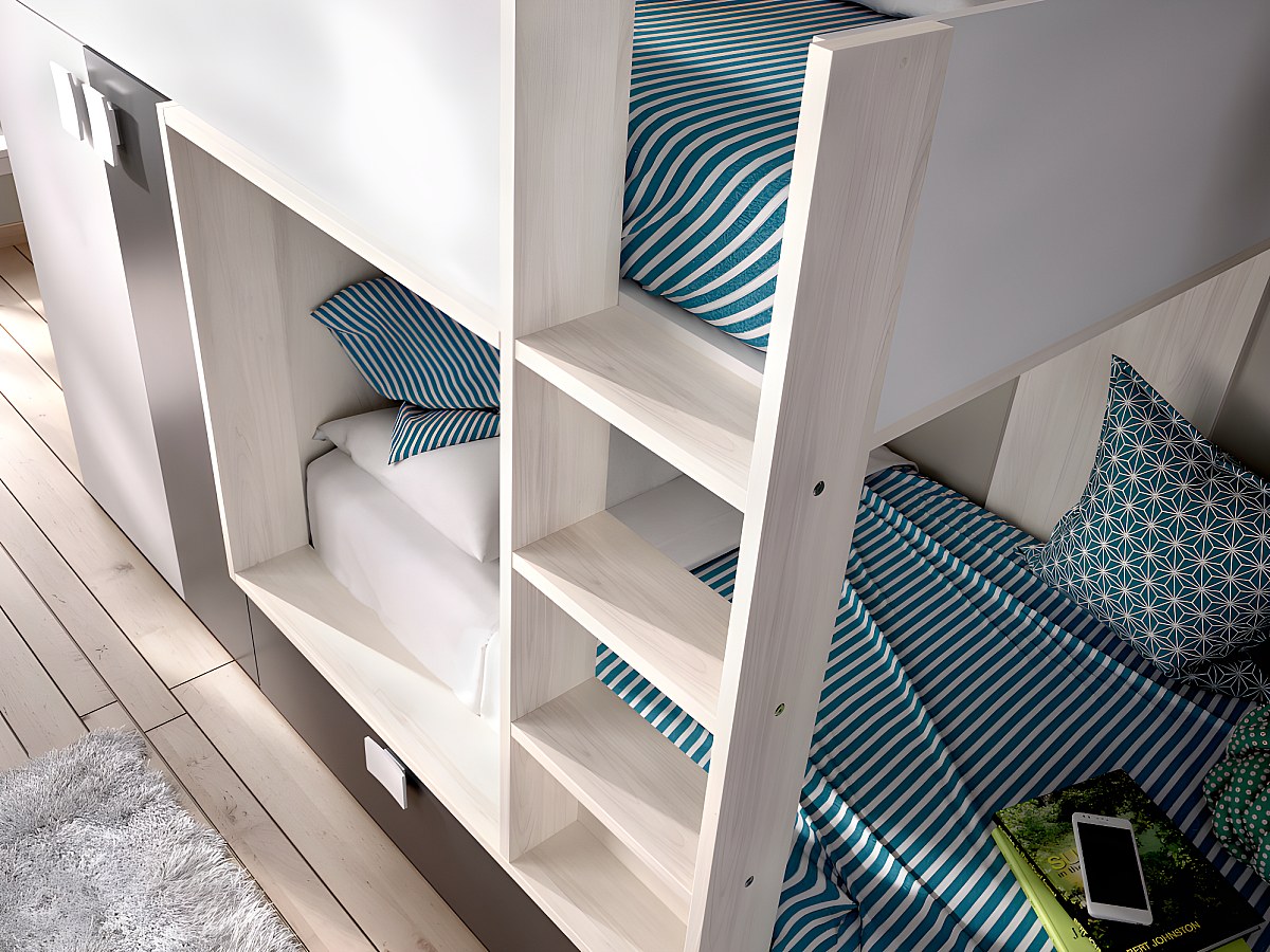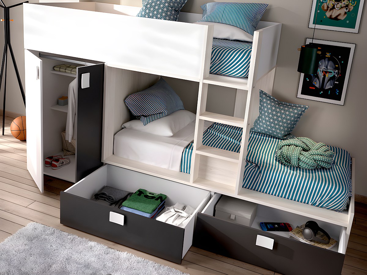 Wygospodaruj więcej miejsca w dziecięcym pokoju dzięki łóżku piętrowemu JUANITO. Wbudowana szafa oraz 2 duże szuflady pomieszczą wszystkie niezbędne rzeczy.