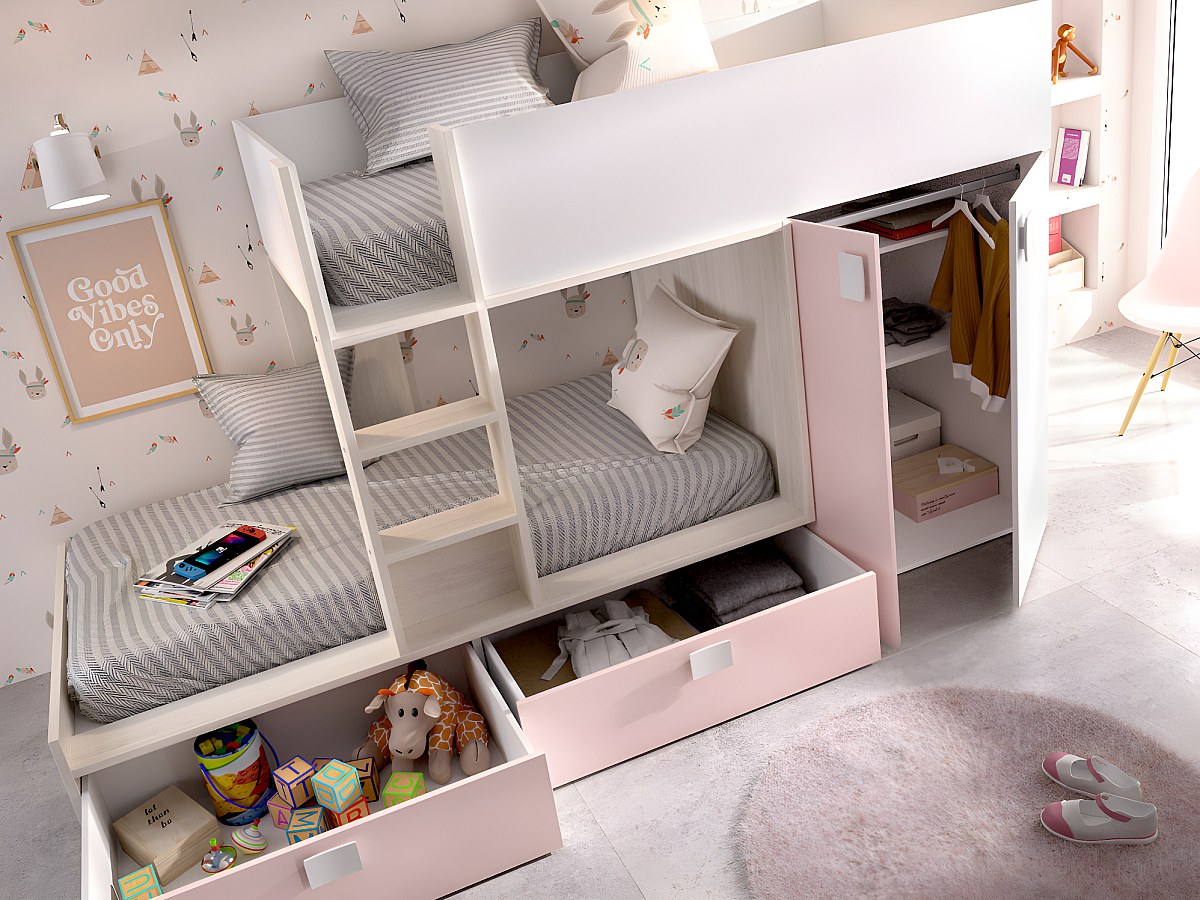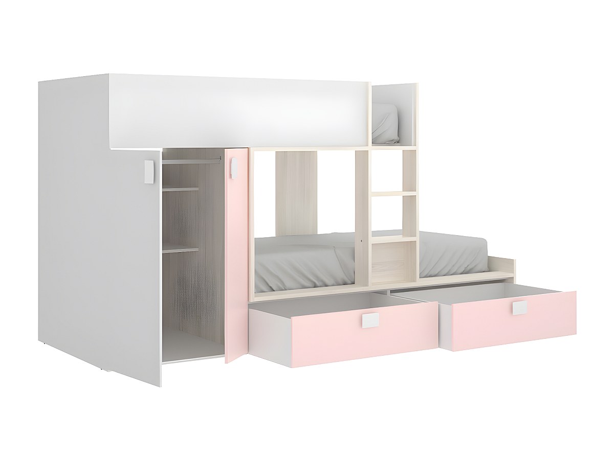 Łóżko piętrowe JUANITO – wbudowana szafa – 2 × 90 × 190 cm – kolor biały, dębowy i różowy