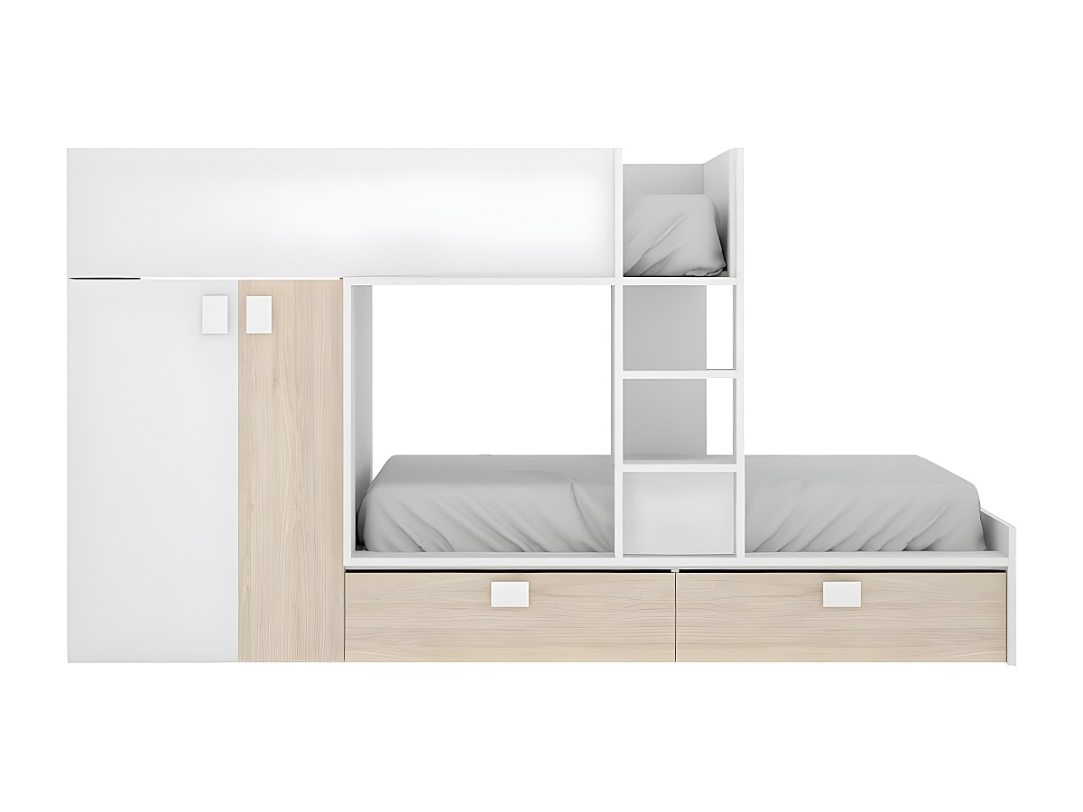 Łóżko piętrowe JUANITO – wbudowana szafa – 2 × 90 × 190 cm – kolor biały i dębowy.