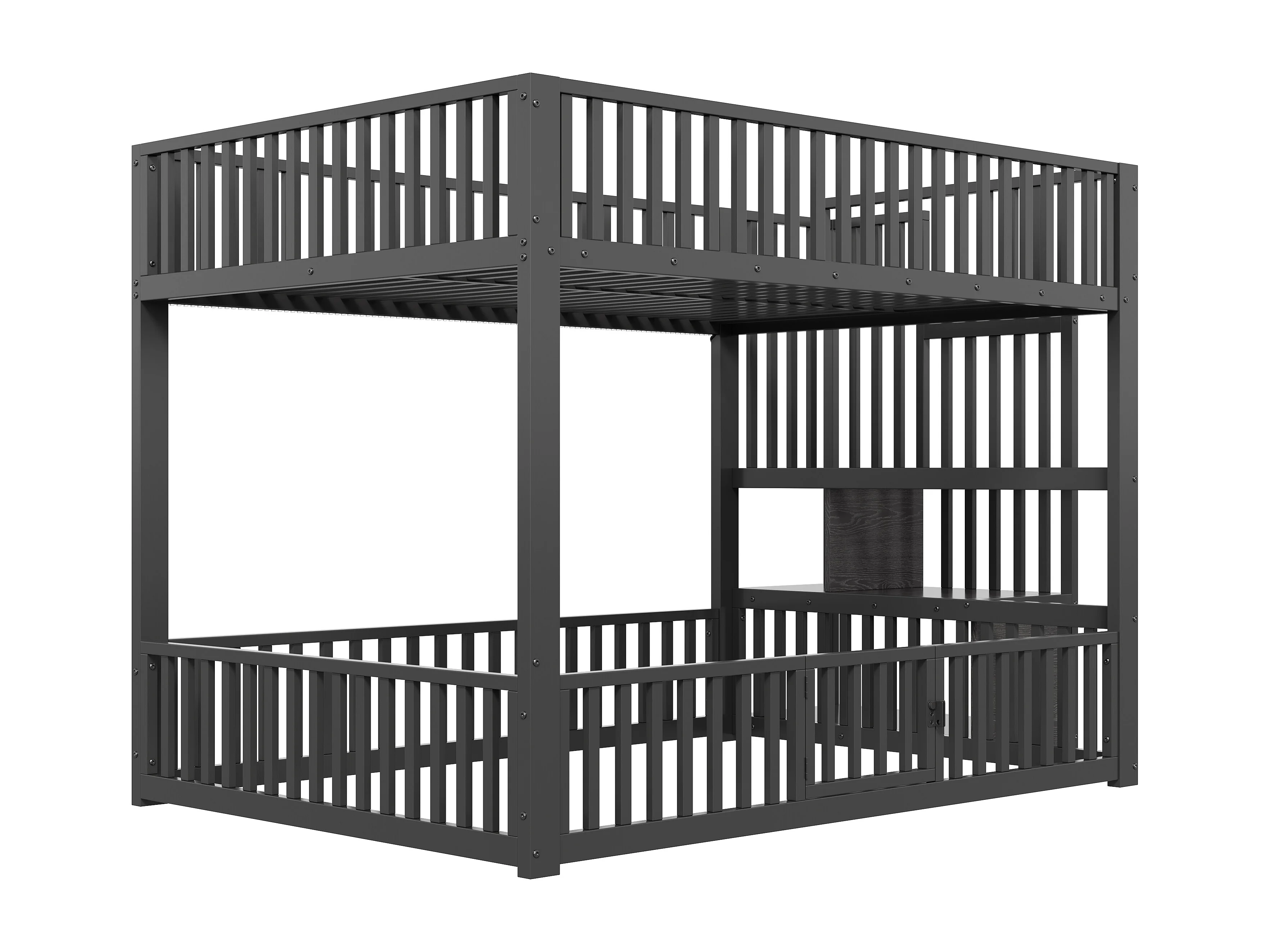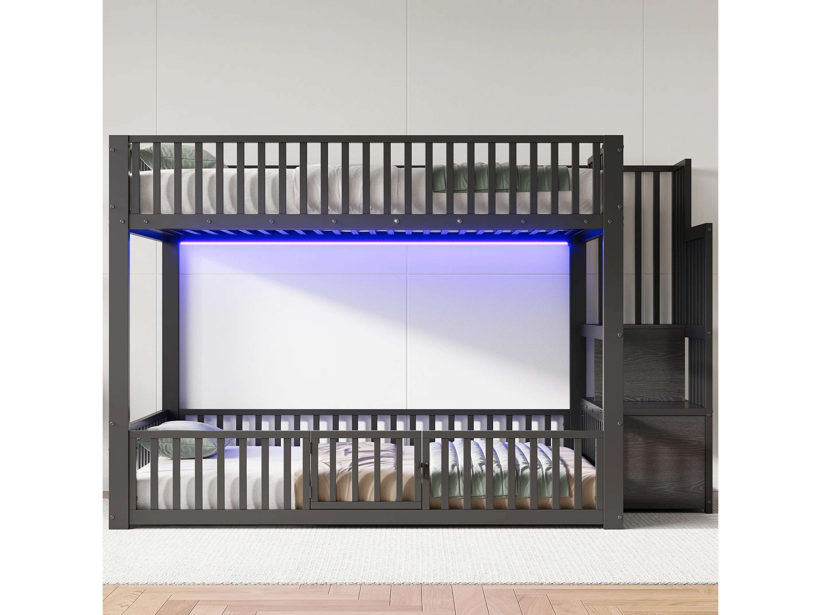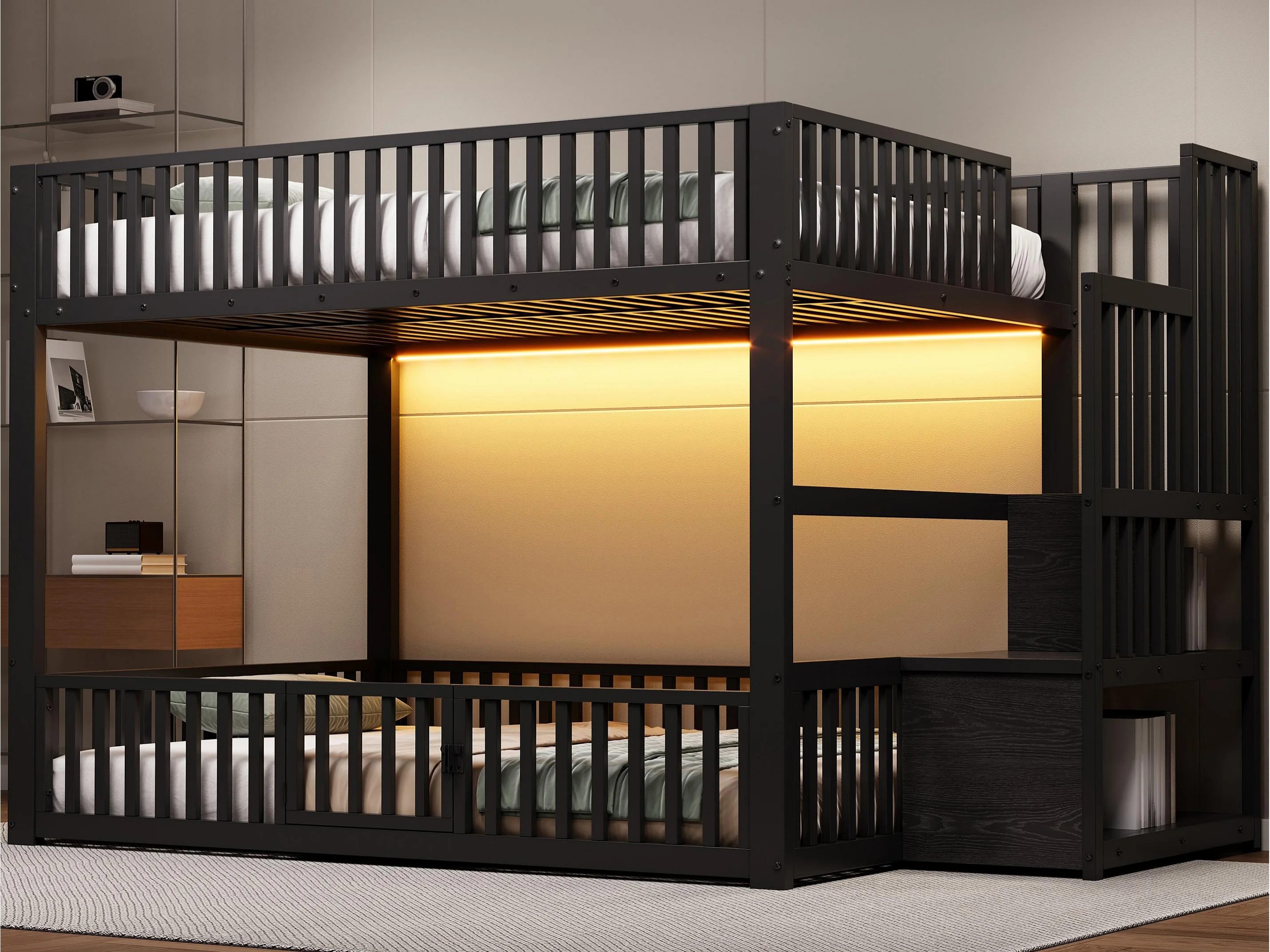 Łóżko piętrowe metalowe 140x200 cm - z drabiną z pojemnikami - barierka bezpieczeństwa - MDF - Czarny (Materac nie jest wliczony w cenę)