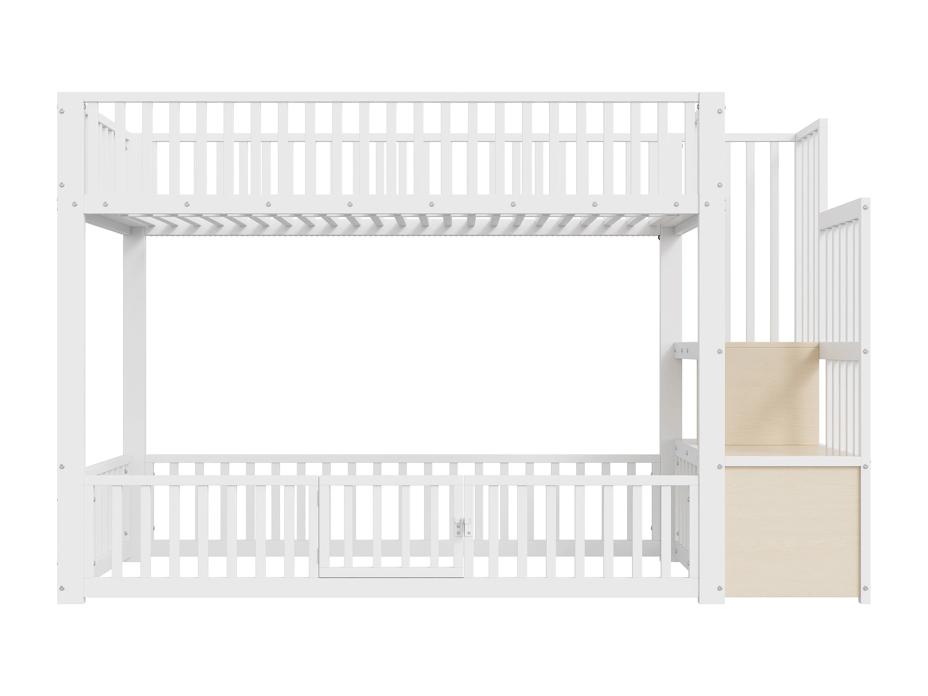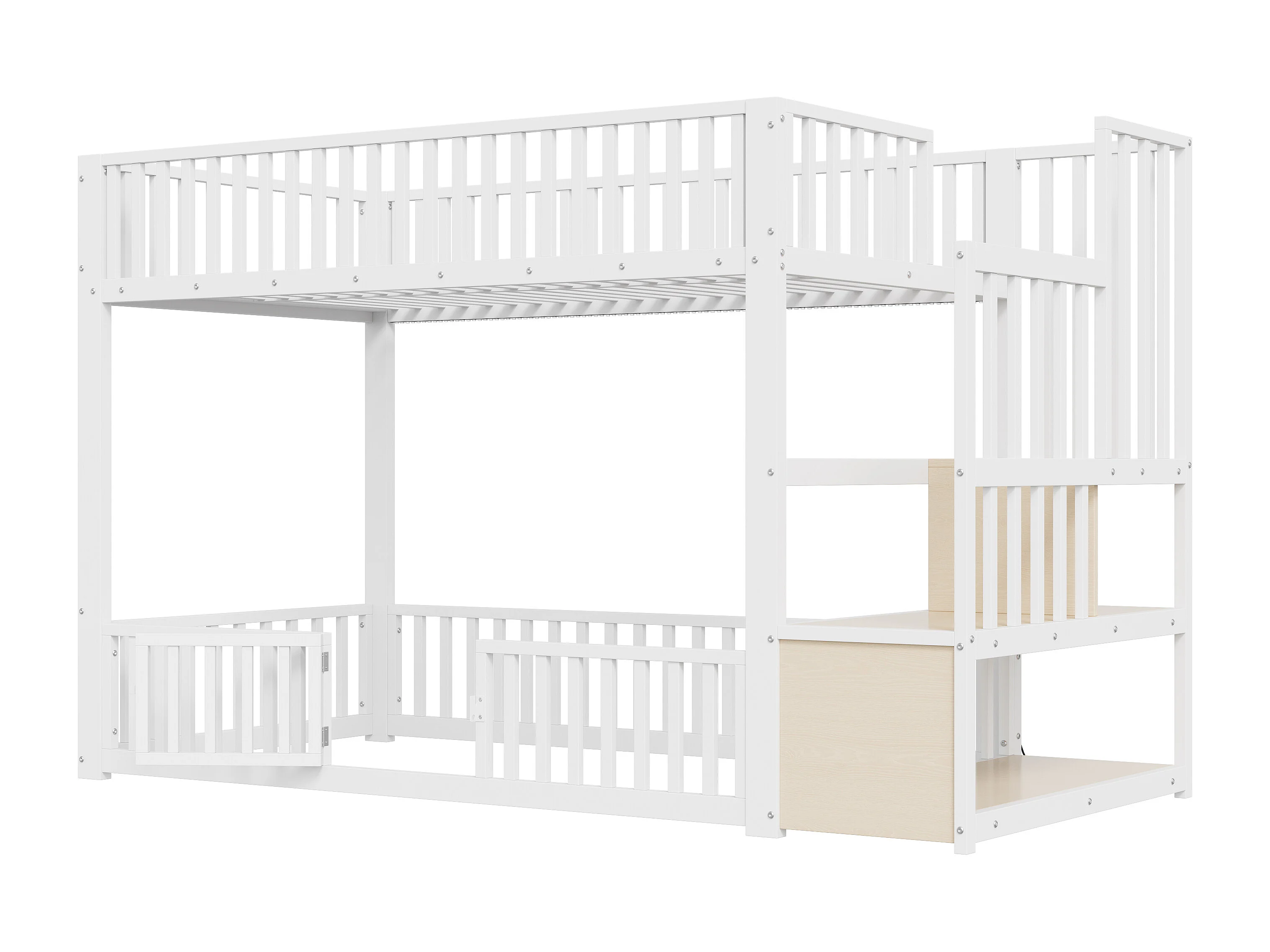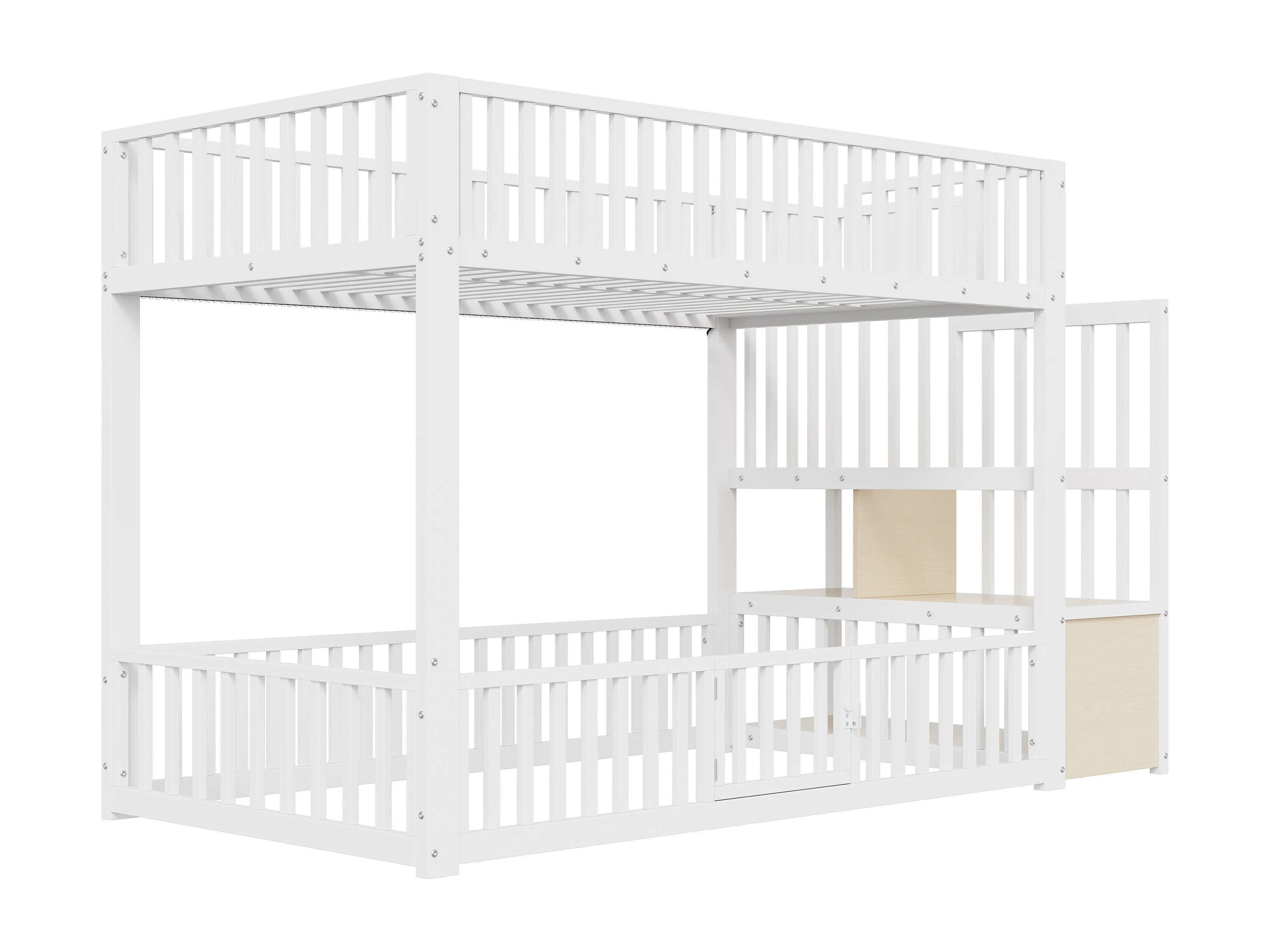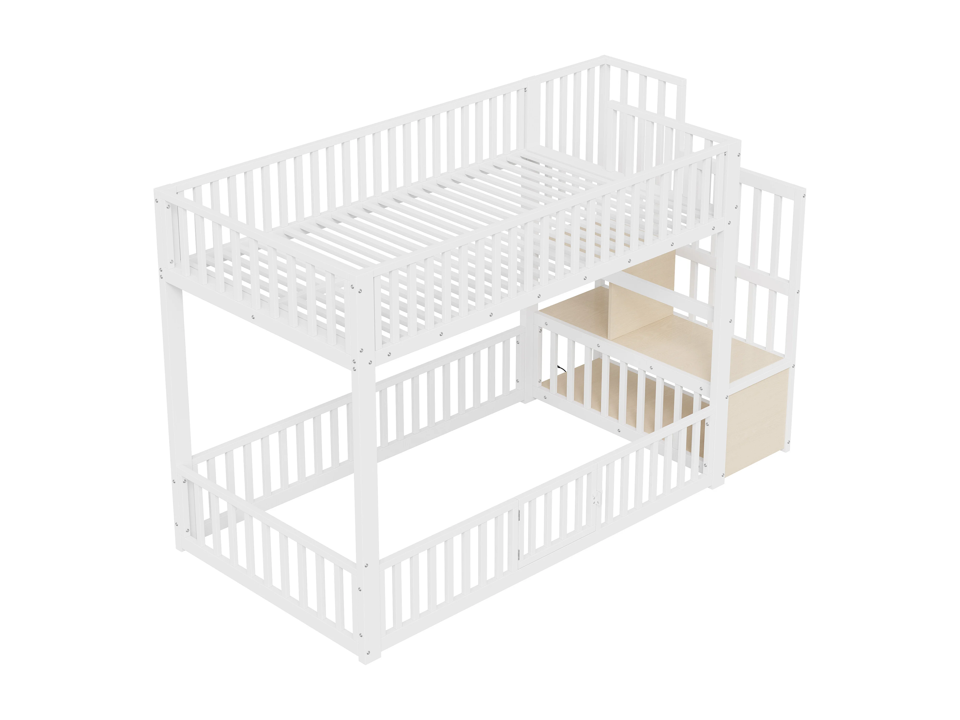 Łóżko piętrowe metalowe 90x200 cm - z drabiną z pojemnikami - barierka bezpieczeństwa - MDF - Biały (Materac nie jest wliczony w cenę)