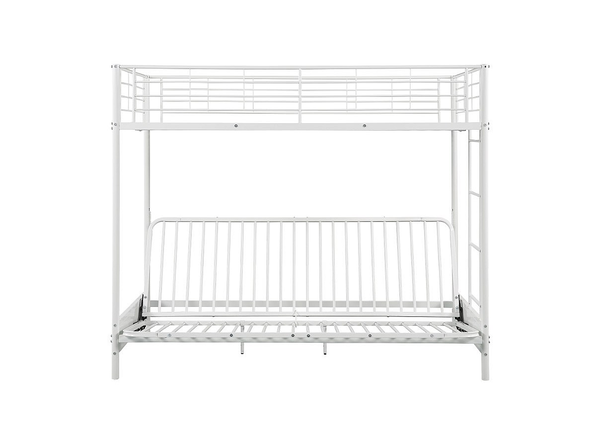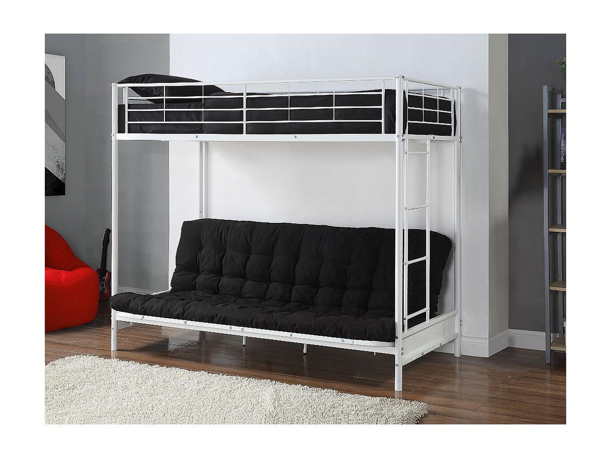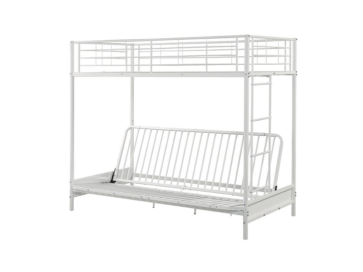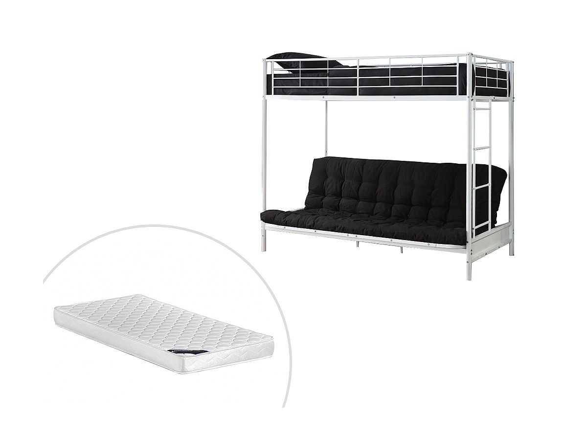 Łóżko piętrowe MODULO IV – 90 × 190 cm – z rozkładaną kanapą – metal – kolor biały, w zestawie z futonem i materacem