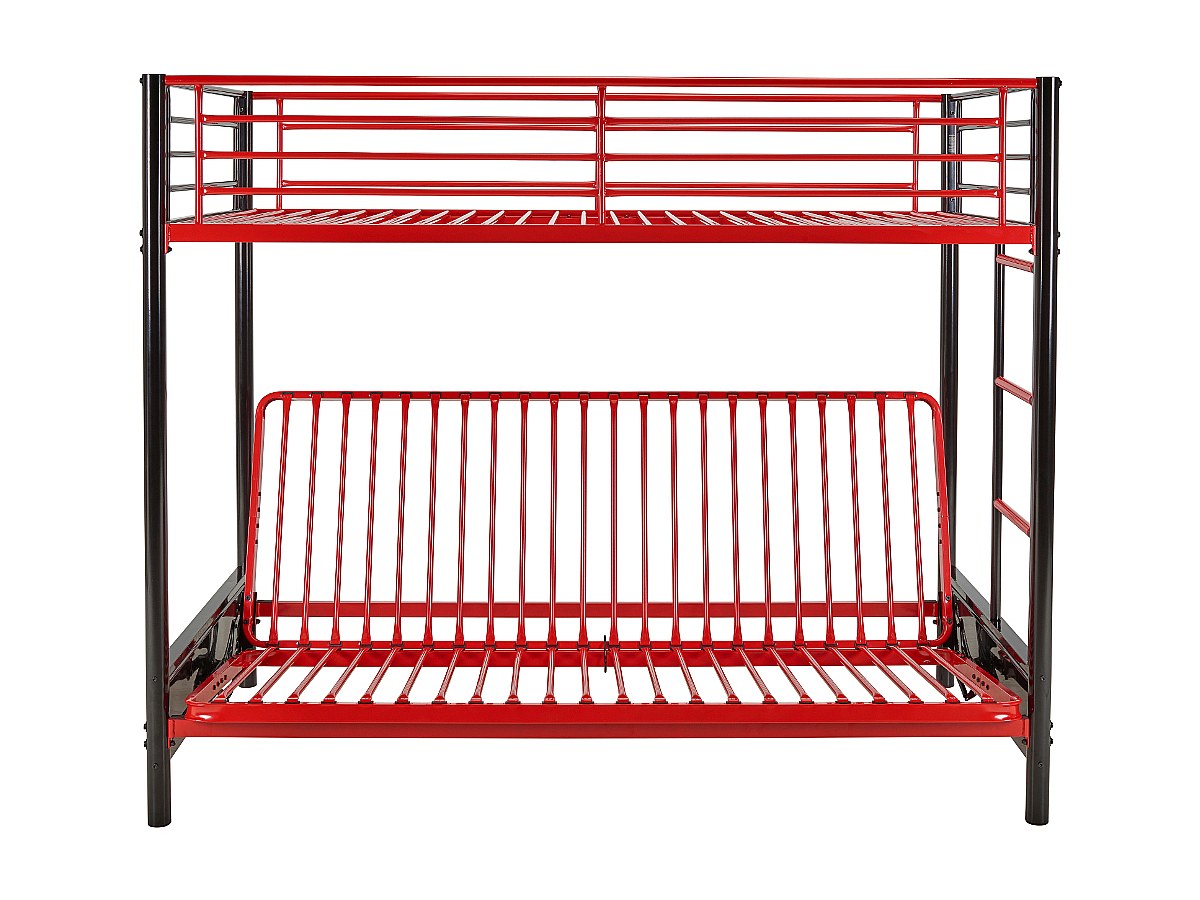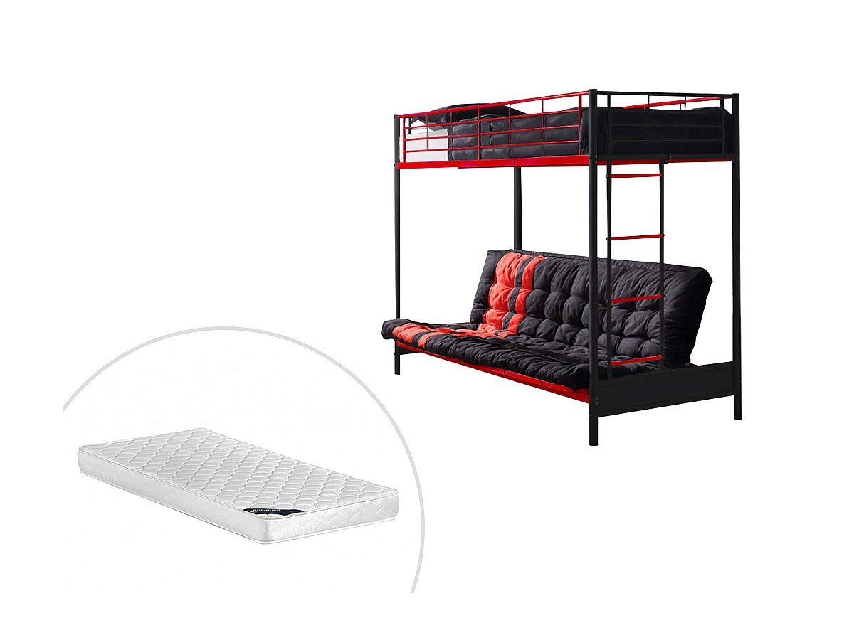 Łóżko piętrowe MODULO IV – 90 × 190 cm – z rozkładaną kanapą – metal – kolor czarny i czerwony, w zestawie z futonem i materacem