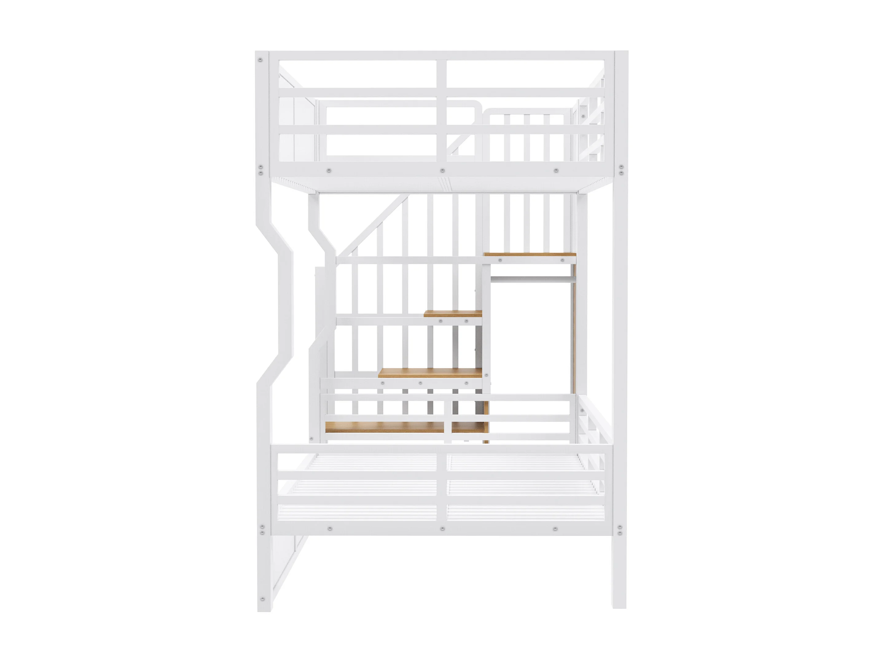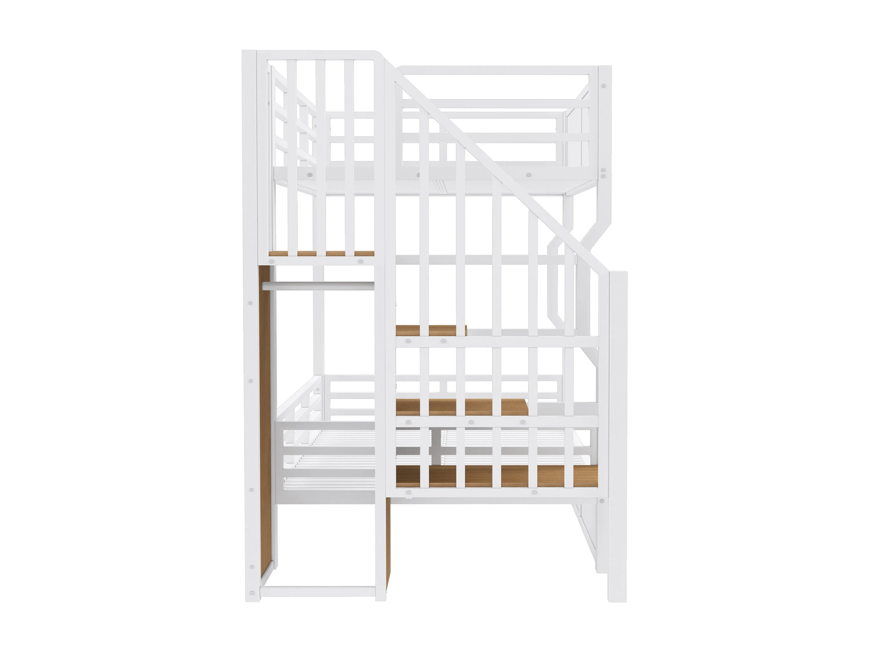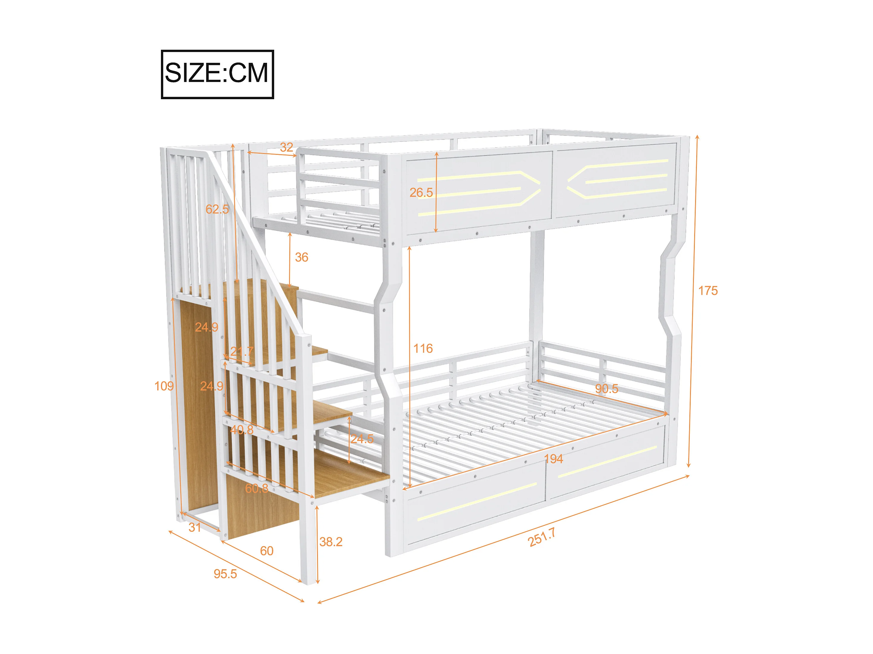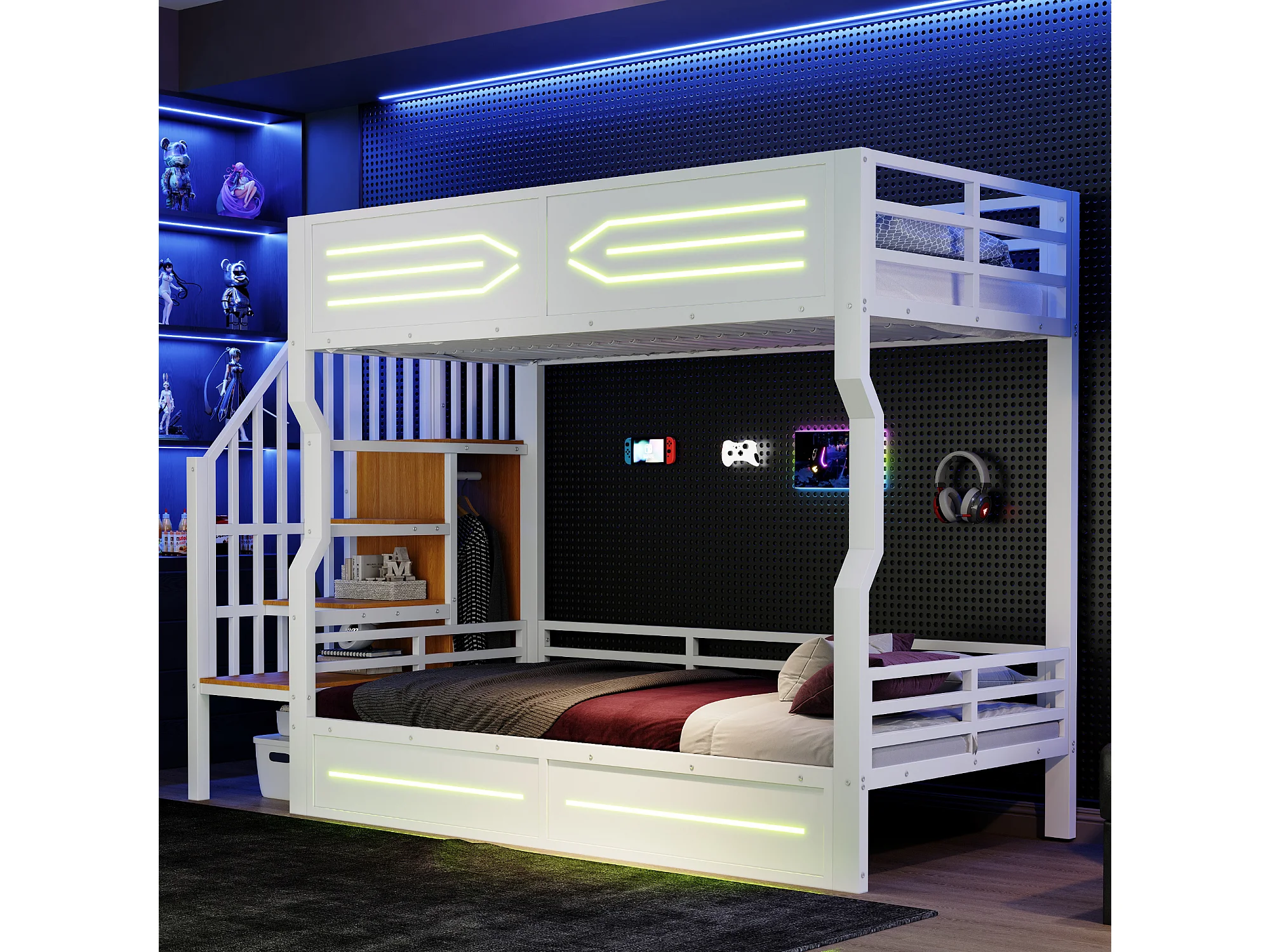 Łóżko piętrowe z kutego żelaza 90×200 cm - z drabiną z pojemnikami - z oświetleniem LED - z drabiną bezpieczeństwa - biały (materac nie jest wliczony w cenę)
